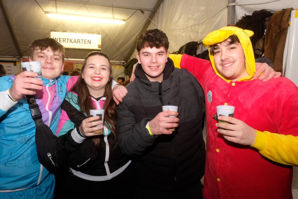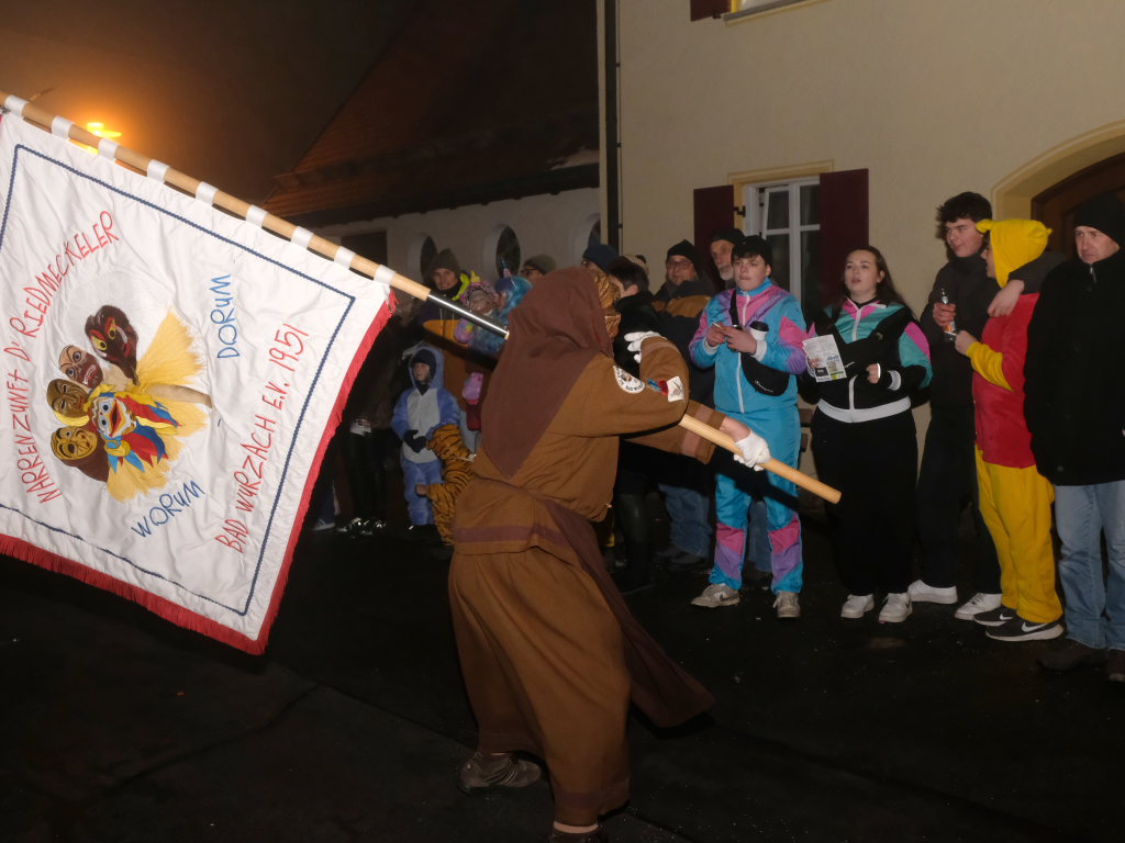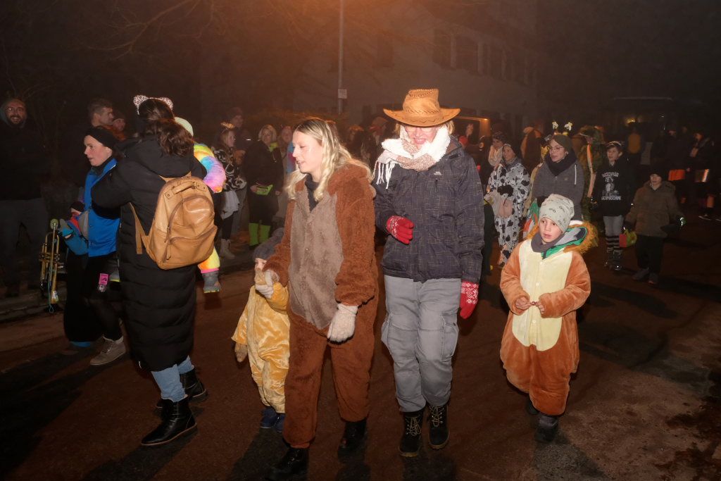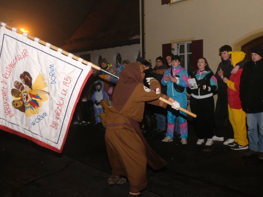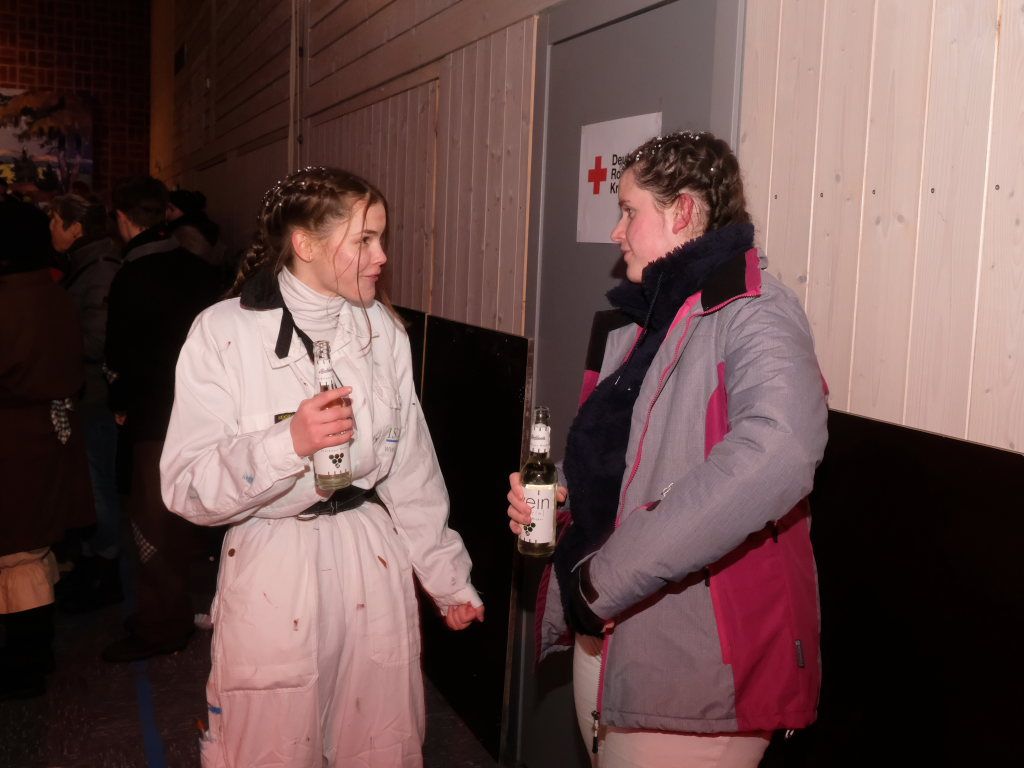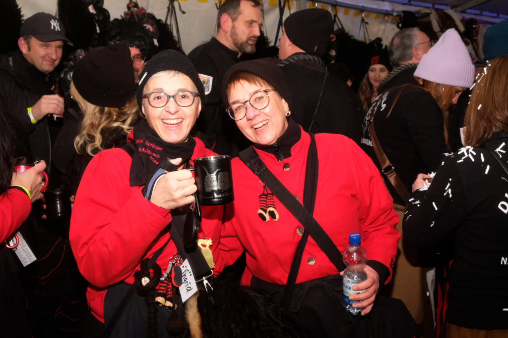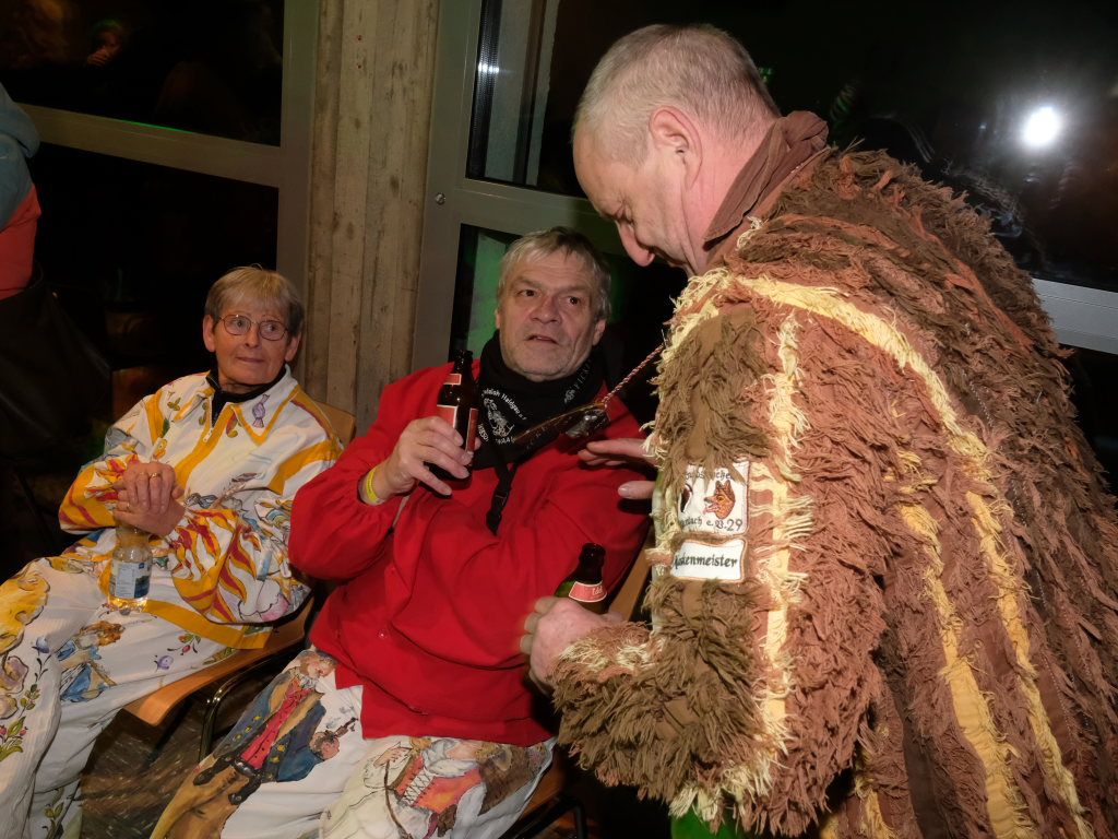 Als um 18.01 Uhr der Startschuss für den kleinen Narrensprung fiel, war die Hauptarbeit für die gastgebende Zunft um Zunftmeisterin Christine Veser und ihren Vize Ewald Bodenmüller schon lange erledigt. Im Vergleich zum Sprung 2018 hatten die aktuell rund 120 Mitglieder einen weitaus größeren Aufwand betrieben, damit sich die großen und kleinen Narren „auf dem Berg“ wohlfühlten. Denn im Anschluss an den Sprung wurde nicht nur die Halle zur Partymeile, sondern ein Festzelt auf dem Parkplatz bei der Halle wurde zur Narren-Disko. Und das Haus St. Martin, in dem vor dem Sprung der Zunftmeisterempfang stattgefunden hatte, wurde zur Disko – mit Tanz- und Spieleboden für die Kleinen.