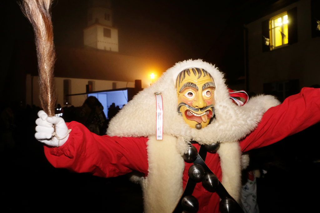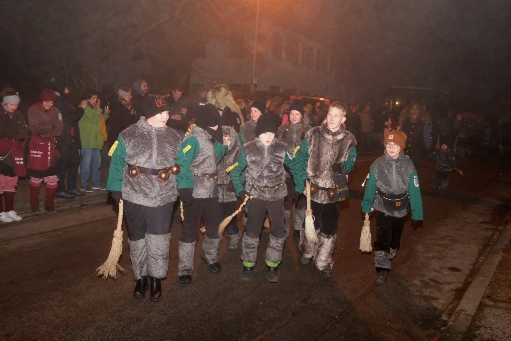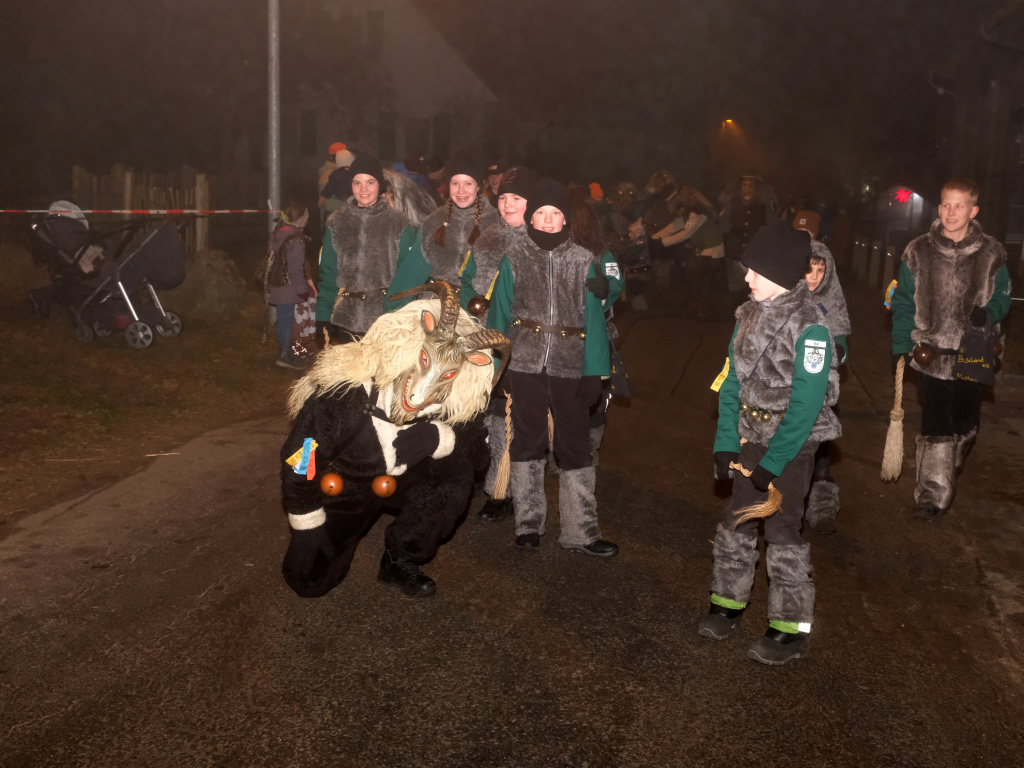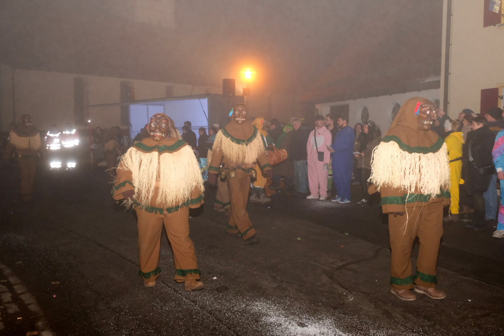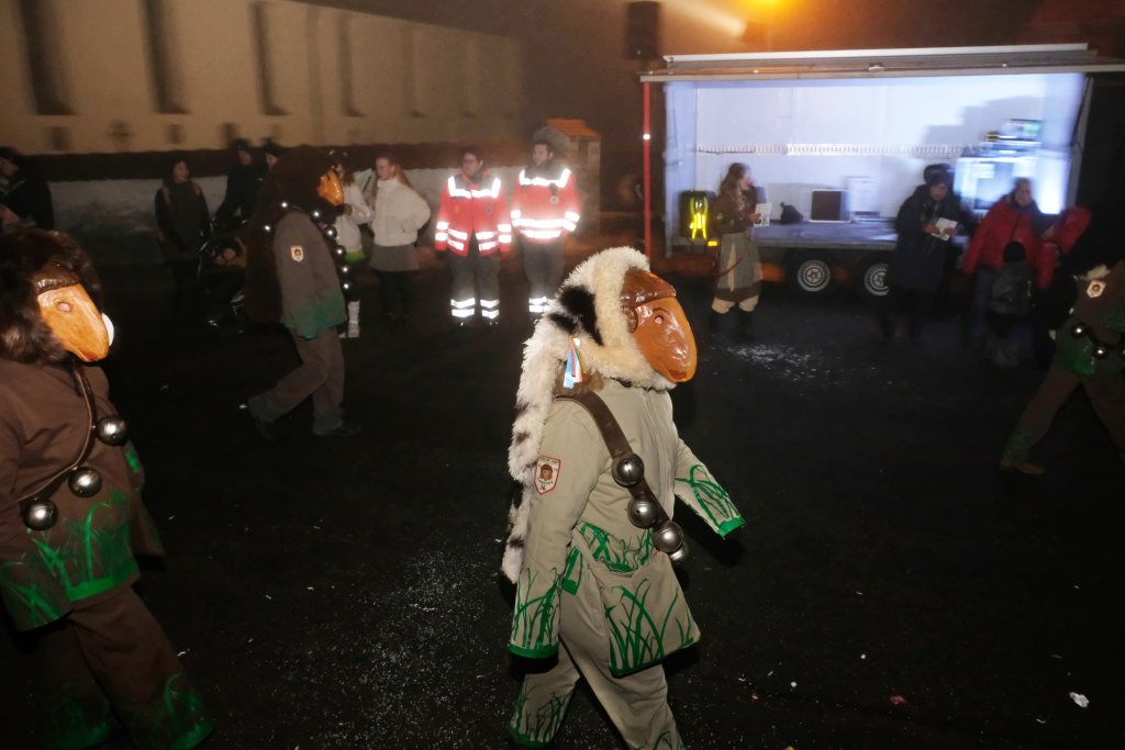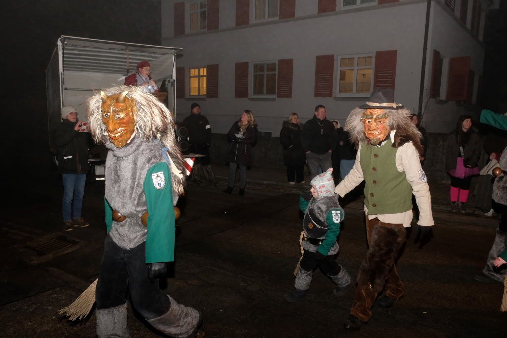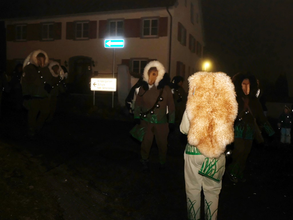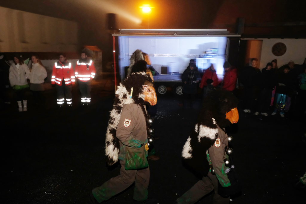Die Einzelmaske des Deifelsbock führte den Zug gemeinsam mit dem Narrensamen aus lauter kleinen Waldbutzen, der Standardmaske der Narrenzunft, vom Aufstellungsplatz an der Straße aus Weitprechts kommend an. Beim Abzweig an der Schule Richtung Kindergarten hatte Ortsvorsteher Berthold Leupolz als erster Umzugssprecher Stellung bezogen. Obwohl der passionierte Sänger eine gut ausgebildete Sängerstimme hat, musste er beim Ansagen der einzelnen Gruppen ordentlich die Stimme erheben. Besucher des Rathauses in Eintürnen wird empfohlen, in den nächsten Tagen schonend mit den Stimmbändern des Ortsvorstehers umzugehen.
