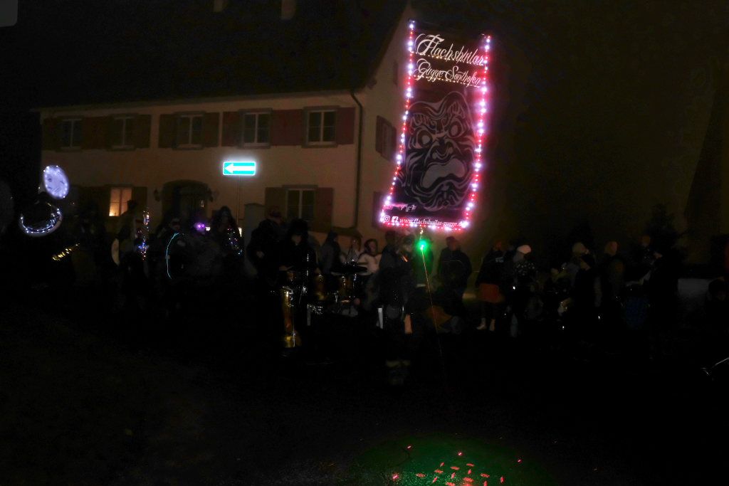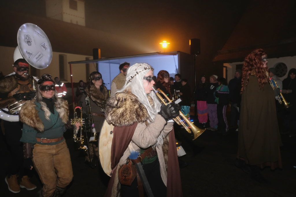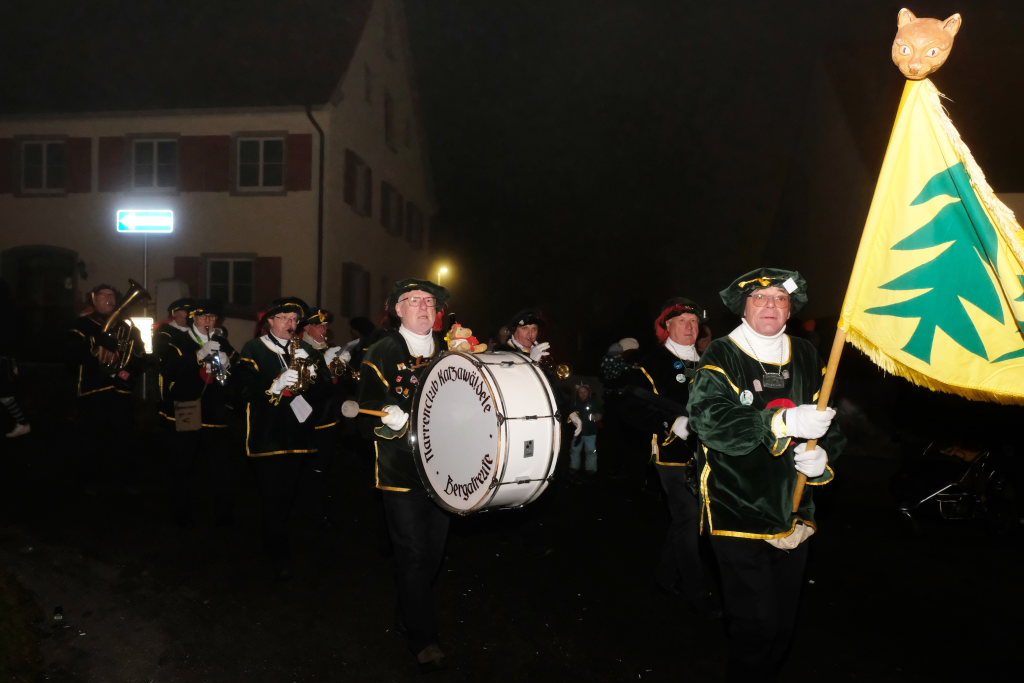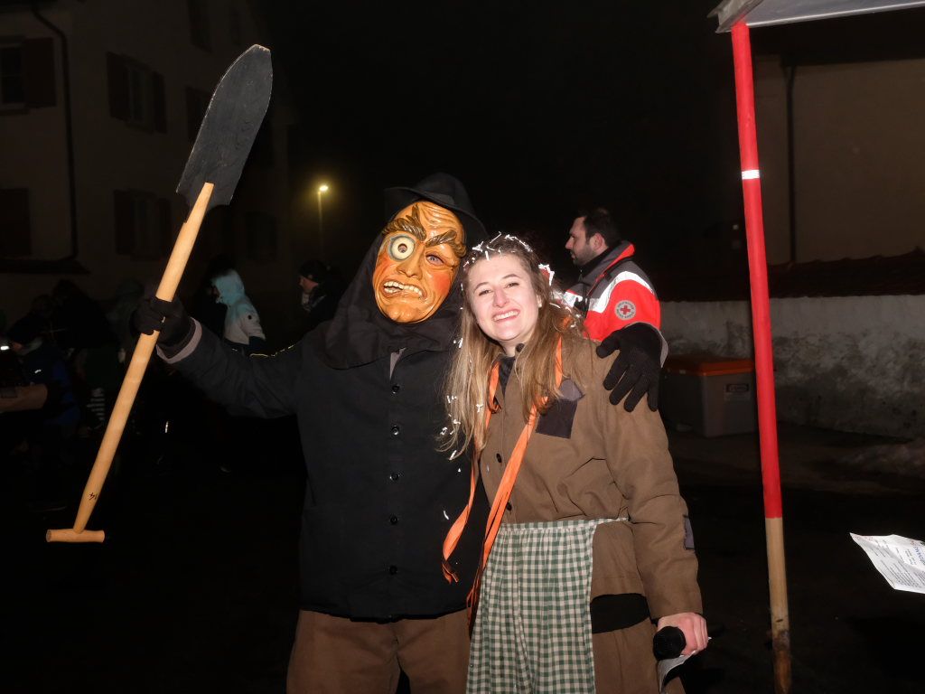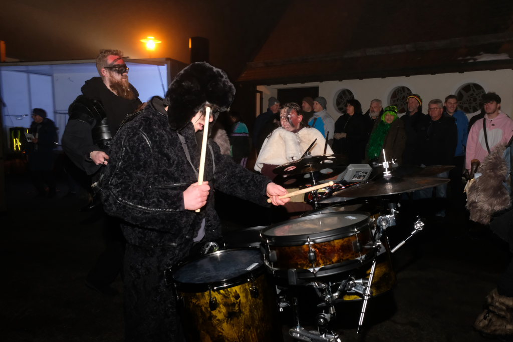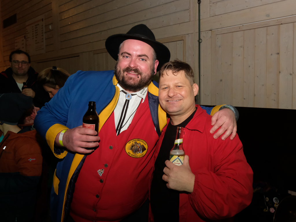 Trotz ihres eigenen großen Jubiläums – sie feiern in diesem Jahr ihr 50jähriges Bestehen – kamen Chadaloh, Pebo, Hugibold und Co. aus dem in Sichtweite liegenden Nachbarort Haidgau herüber, um mit den „Bockländern“ zünftig zu feiern. Und auch die Bad Wurzacher Narrenzunft Riedmeckeler war mit fast allen Häsern vertreten, nachdem diese den ersten Sprung in Eintürnen noch verpasst hatten. Ebenfalls an diesem Abend dabei waren auch die Schoafböck aus Arnach und die Narrenzunft aus Rötenbach, die ihren Narrenruf „Hundsknochen – wau, wau“ erschallen ließ nachdem, ihre hauseigene Guggamusik für Stimmung gesorgt hatte. Als vierte Musikgruppe konnten die Eintürner Narren die kleine Blaskapelle „Katzenwäldle“ aus Bergatreute für ihren Umzug begeistern. Großes Hallo und Umarmungen für „ihre“ Annika gab es mit den Torfstechern aus Waltershofen, die es sich aber nicht verkneifen konnten, eine Konfettispur in ihrer Haarpracht zu hinterlassen.
