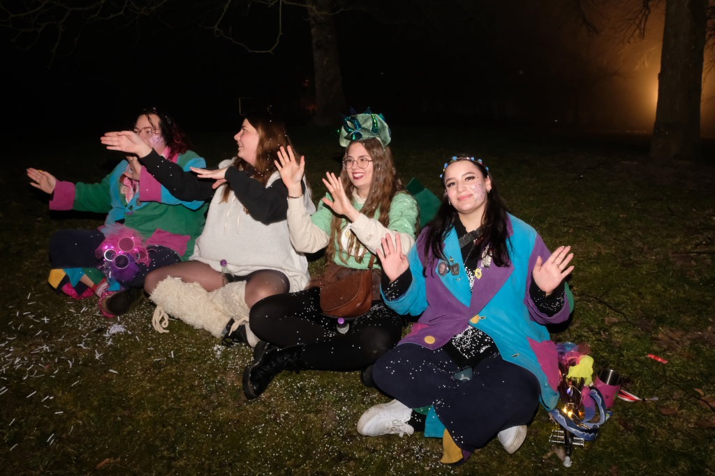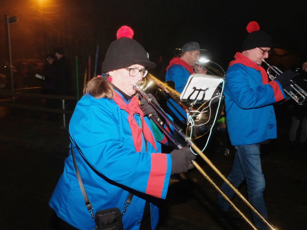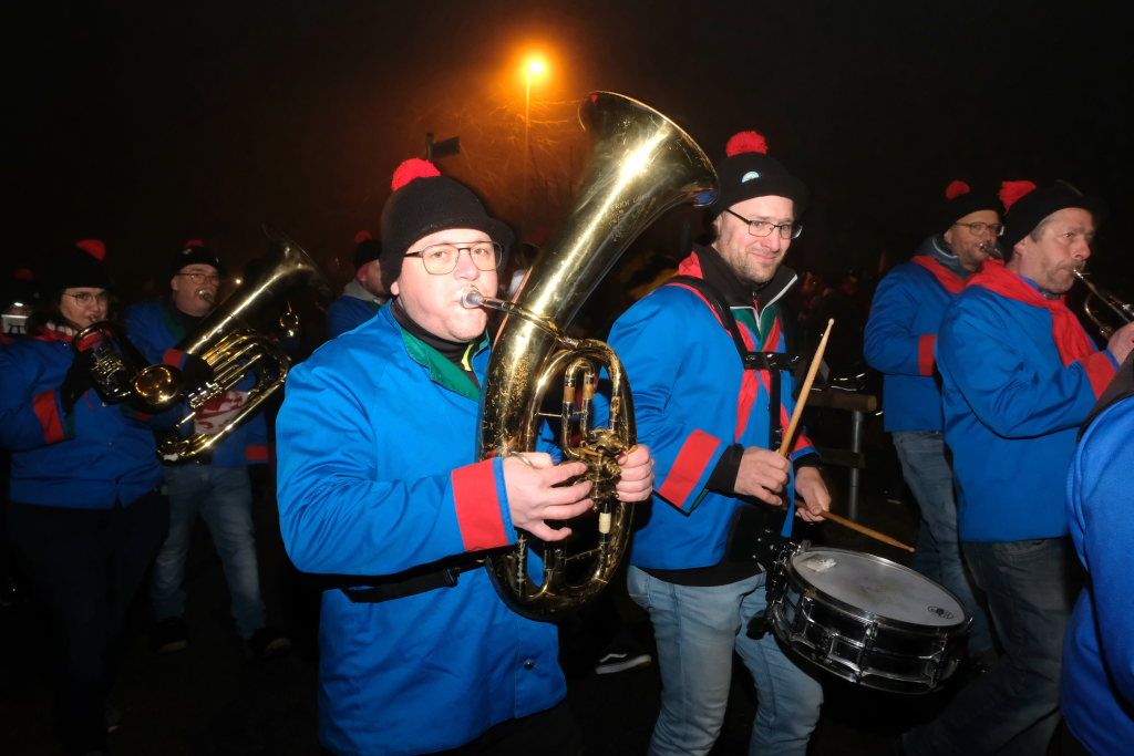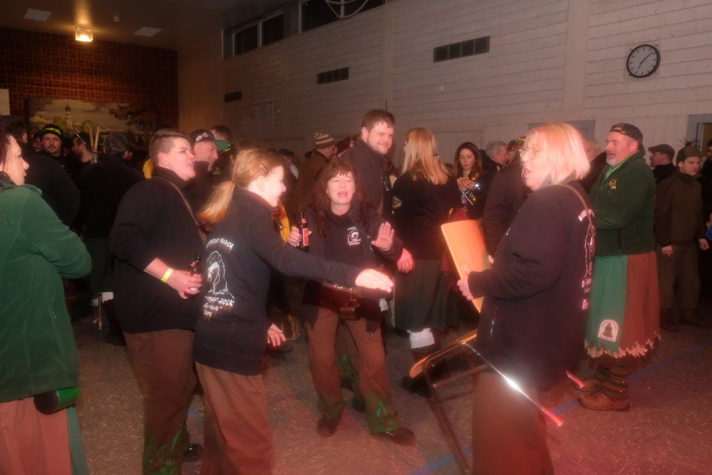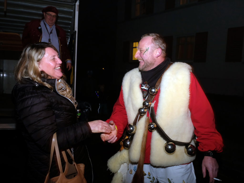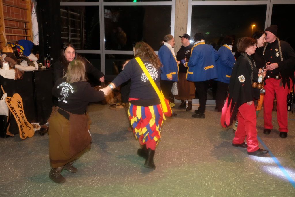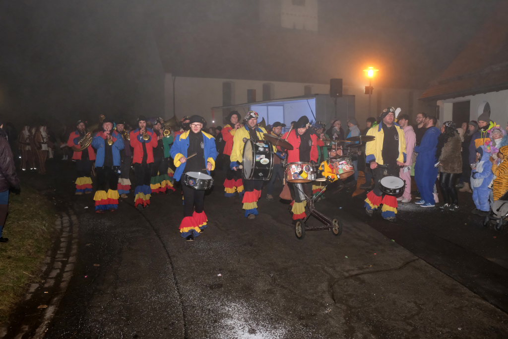 Trotz ihres eigenen großen Jubiläums – sie feiern in diesem Jahr ihr 50jähriges Bestehen – kamen Chadaloh, Pebo, Hugibold und Co. aus dem in Sichtweite liegenden Nachbarort Haidgau herüber, um mit den „Bockländern“ zünftig zu feiern. Und auch die Bad Wurzacher Narrenzunft Riedmeckeler war mit fast allen Häsern vertreten, nachdem diese den ersten Sprung in Eintürnen noch verpasst hatten. Ebenfalls an diesem Abend dabei waren auch die Schoafböck aus Arnach und die Narrenzunft aus Rötenbach, die ihren Narrenruf „Hundsknochen – wau, wau“ erschallen ließ nachdem, ihre hauseigene Guggamusik für Stimmung gesorgt hatte. Als vierte Musikgruppe konnten die Eintürner Narren die kleine Blaskapelle „Katzenwäldle“ aus Bergatreute für ihren Umzug begeistern. Großes Hallo und Umarmungen für „ihre“ Annika gab es mit den Torfstechern aus Waltershofen, die es sich aber nicht verkneifen konnten, eine Konfettispur in ihrer Haarpracht zu hinterlassen.