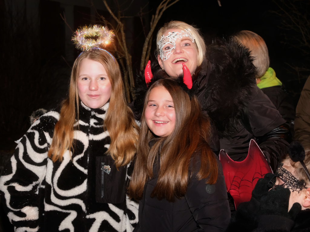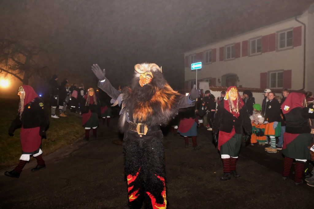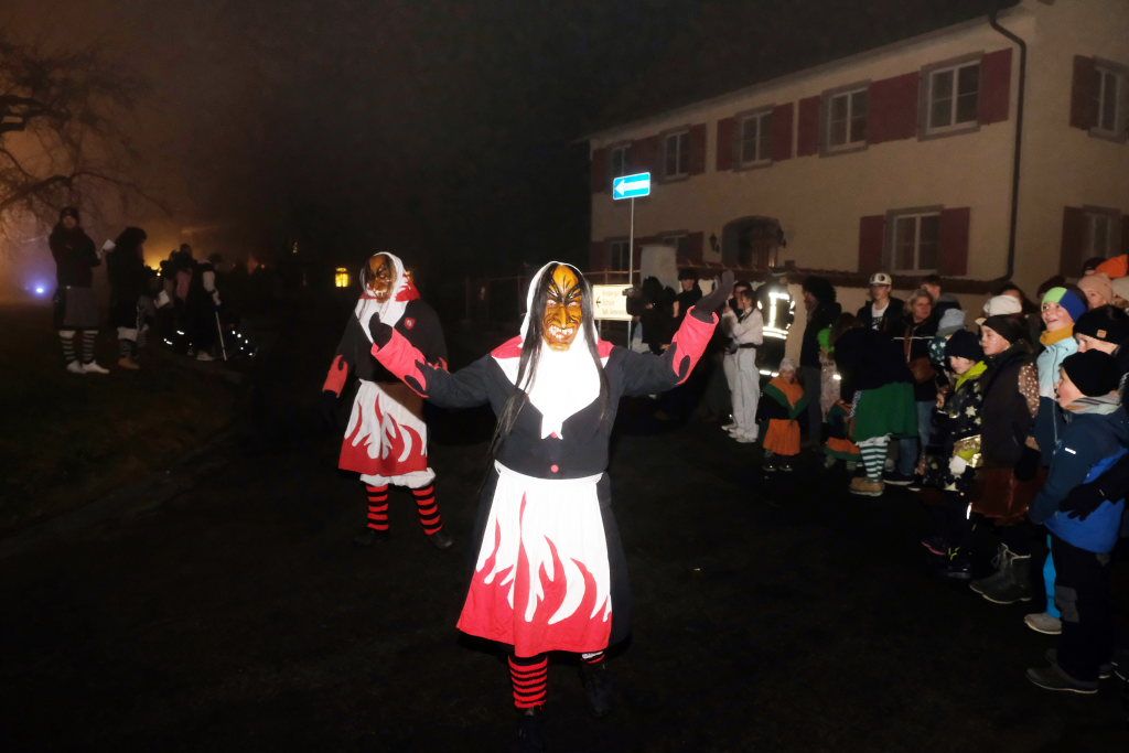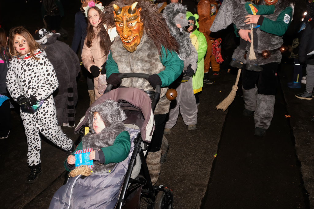 Auch für die Kindergarten- und Grundschulkinder Eintürnens wurde der Narrensprung zu einem unvergesslichen Erlebnis, durften sie doch als Haustierzirkus mit ihrem „Mäh, Miau und wau – des kenned mir au“ gleich nach der Narrenzunft den Weg rund um den Pfarrgarten antreten. Und hatten dabei auch noch musikalische Begleitung durch die Musiker des Musikvereins Eintürnen. Denen folgten die Höllteufel aus dem benachbarten Alttann, die früher zu Zeiten der Elterngeneration der Kindergarten- und Schulkinder oft die Schülerbefreiung am Gumpigen in Eintürnen vornahmen.