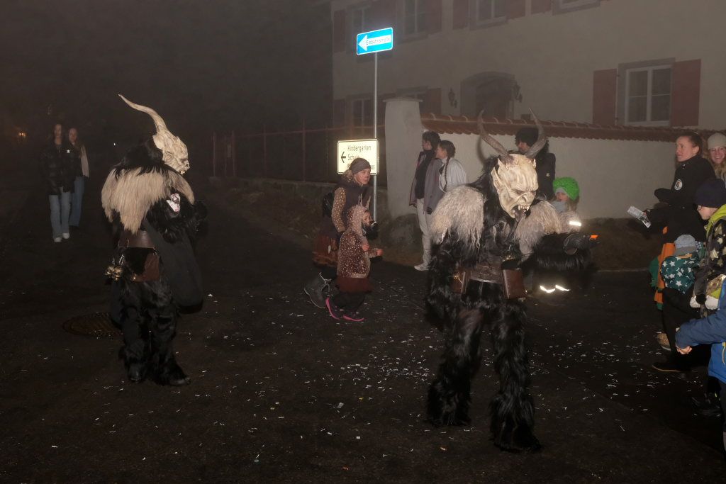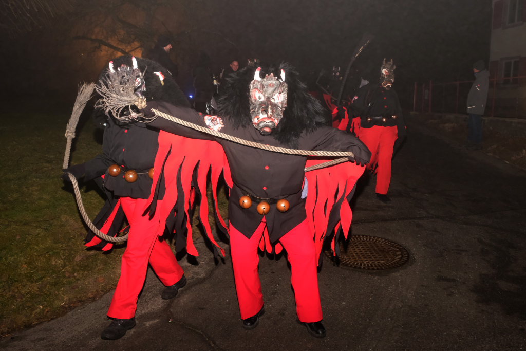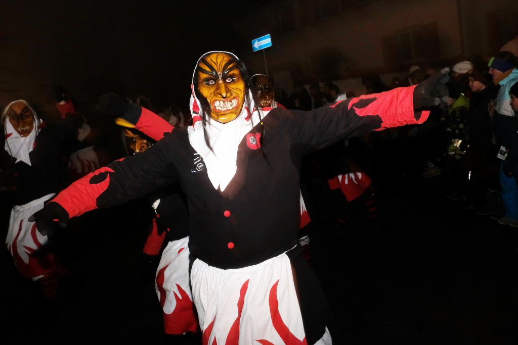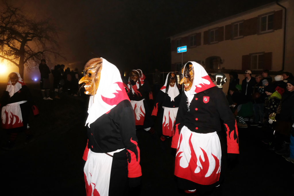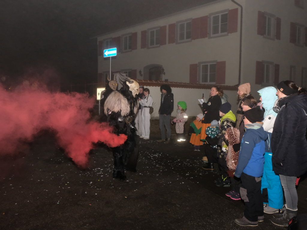 Auch für die Kindergarten- und Grundschulkinder Eintürnens wurde der Narrensprung zu einem unvergesslichen Erlebnis, durften sie doch als Haustierzirkus mit ihrem „Mäh, Miau und wau – des kenned mir au“ gleich nach der Narrenzunft den Weg rund um den Pfarrgarten antreten. Und hatten dabei auch noch musikalische Begleitung durch die Musiker des Musikvereins Eintürnen. Denen folgten die Höllteufel aus dem benachbarten Alttann, die früher zu Zeiten der Elterngeneration der Kindergarten- und Schulkinder oft die Schülerbefreiung am Gumpigen in Eintürnen vornahmen.