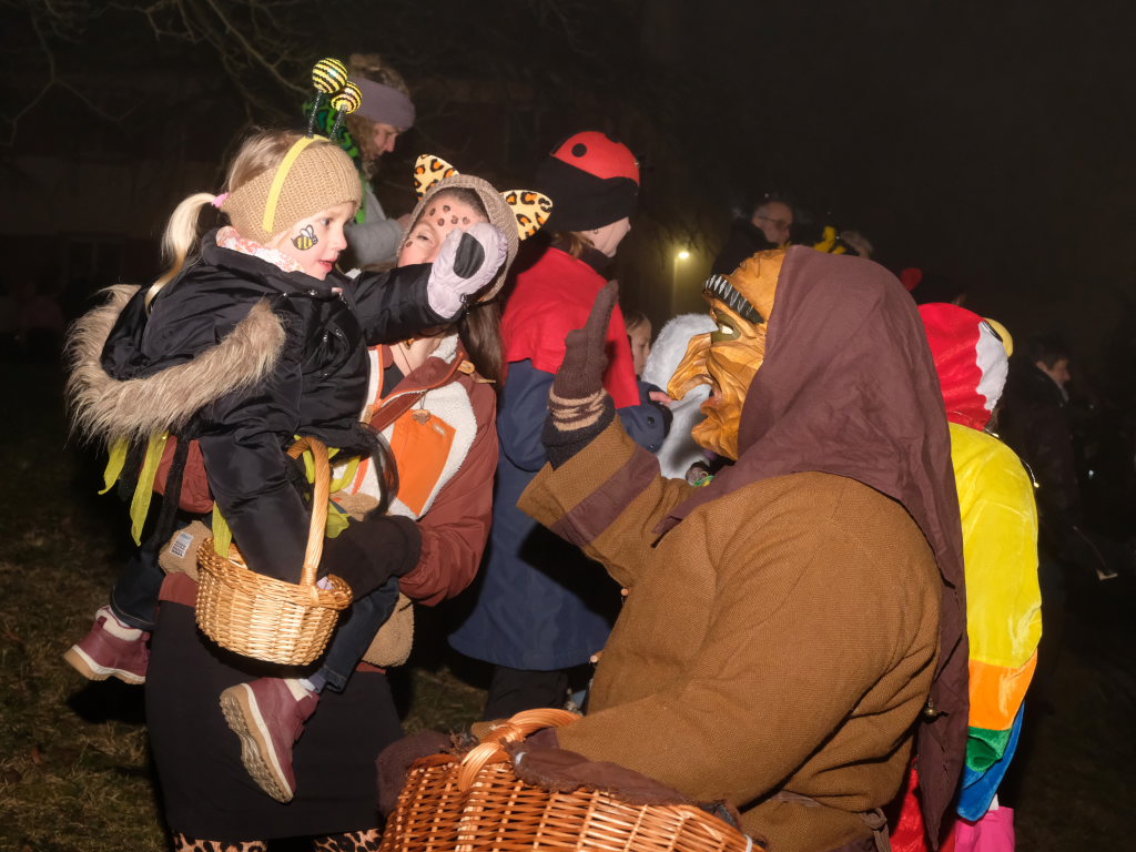 Selbst die kleinen Kinder freuten sich an den Masken, wie hier beim Abklatschen mit einem Moorweible.