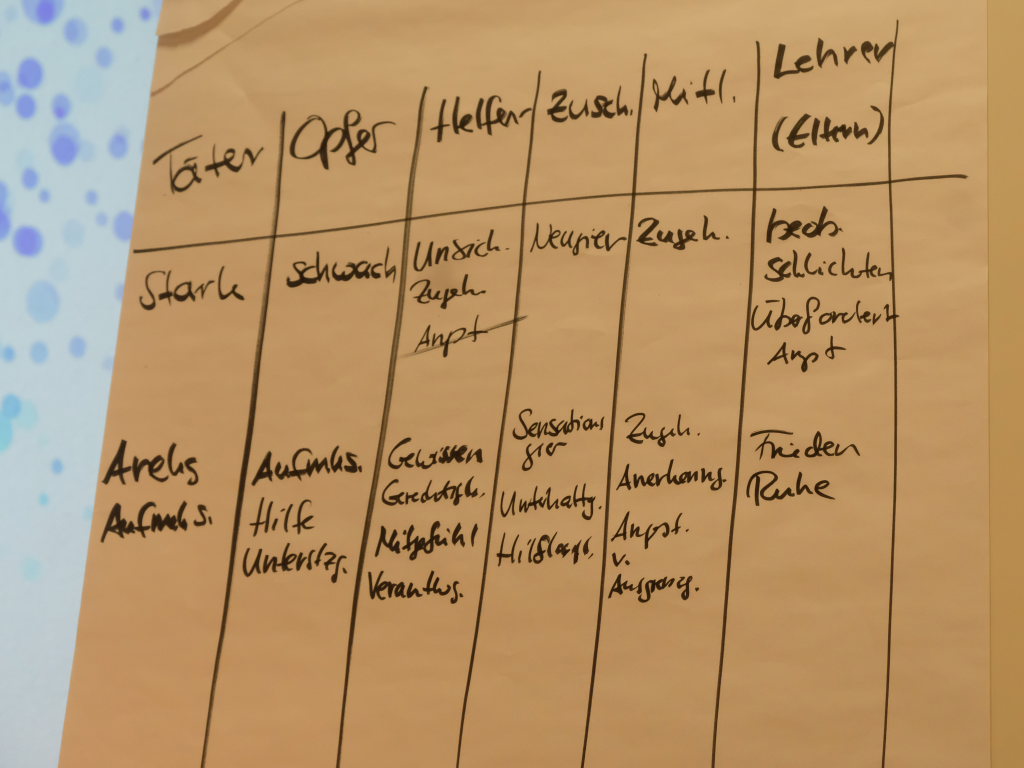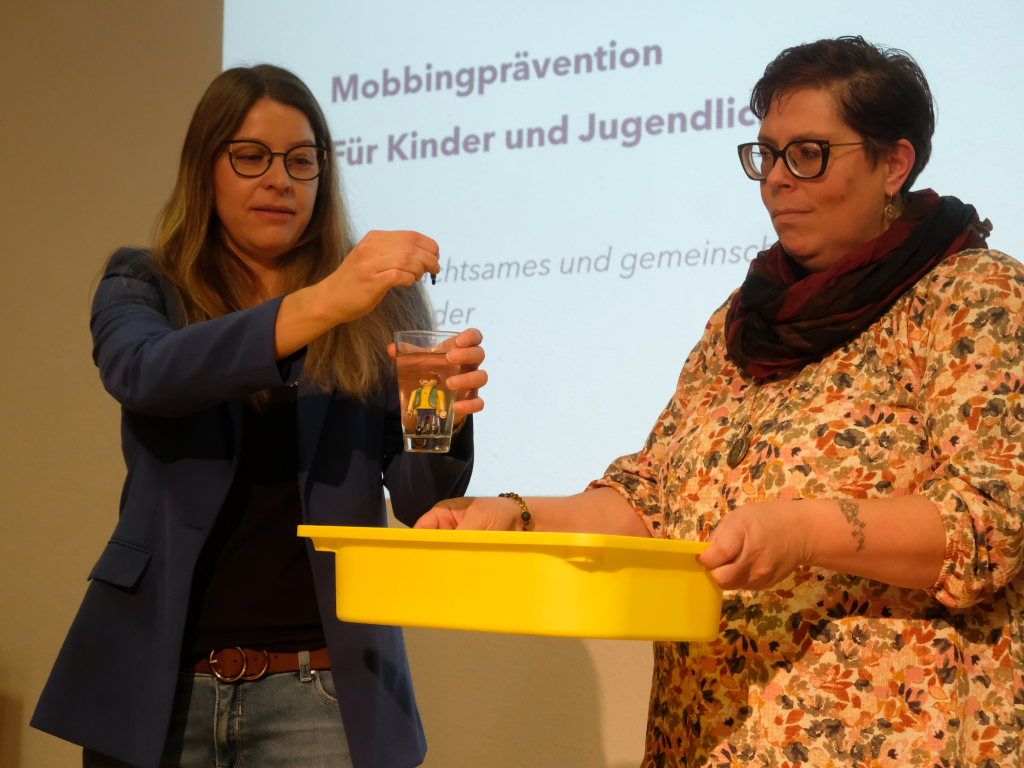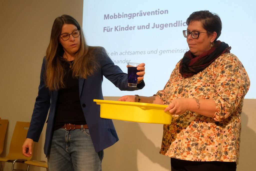 Dass aber viele äußere Zeichen Interpretationssache sind, zeigte die Referentin anhand einer pantomimischen Darstellung zweier Kinder: während das eine sehr unsicher wirkte, erschien das andere etwa durch die Geste der in die Hüften gestemmten Arme viel selbstsicherer. Auf die Frage, was die Besucher gesehen hatten, tippten diese dementsprechend auf das zweite als das Kind, das widerstandsfähiger (resilienter) gegenüber von Mobbing seien. Tatsächlich könne der optische Eindruck bei Beiden täuschen.