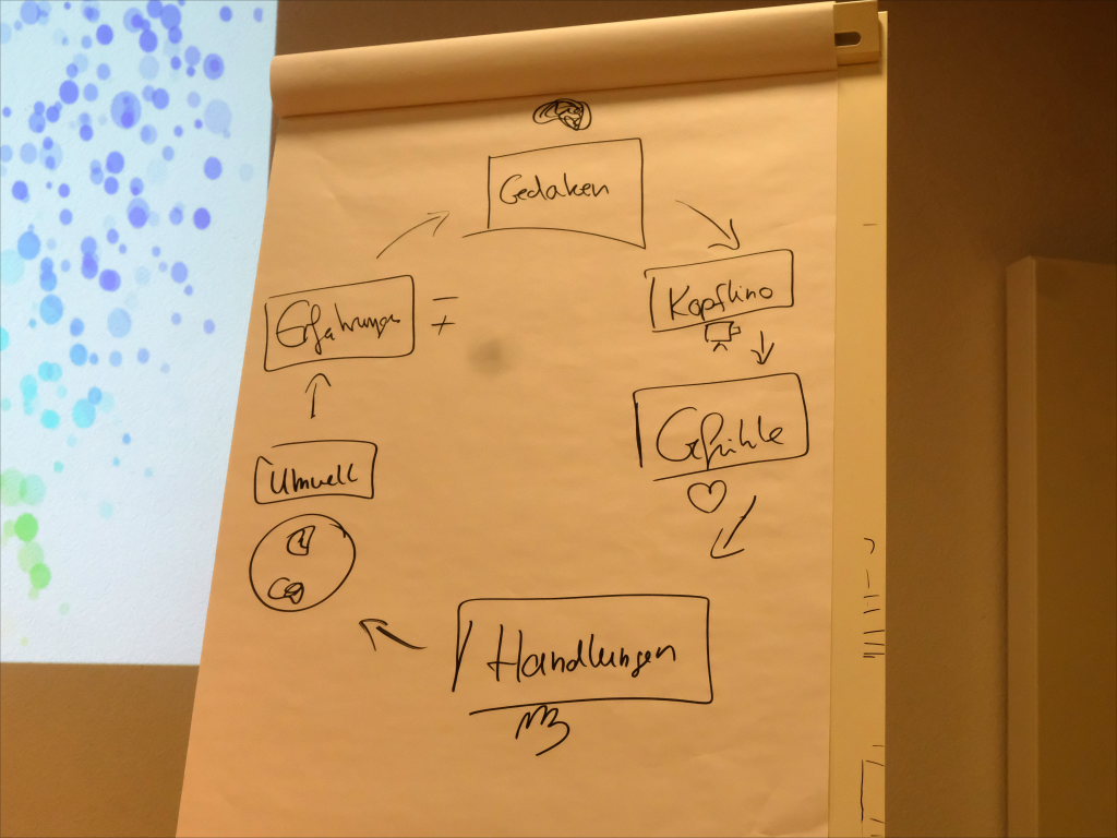 Am Beispiel einer in einem Glas Wasser stehenden Spielfigur verdeutlichte Carmen Rodi den Einfluss positiver und negativer Gedanken auf das Unterbewusstsein. Anhand fünf kleiner Episoden, die dieser Gregor vom Aufstehen bis zu seinem Arbeitsplatz erlebt, zeigte sie durch Einbringen von dunkler Farbe auf, wie sich bei negativen Gedanken das Unterbewusstsein immer mehr verfinstert. Bei positiven Gedanken in der jeweils gleichen Situation – wie etwa einem Stau auf dem Weg zur Arbeit – zeigte sich, dass das Unterbewusstsein immer eine „klare Sicht“ hatte.