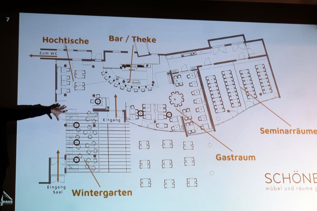 Das bisherige Foyer wird zur Lounge mit direkter Anbindung an den Restaurantbereich umgestaltet, wo man es sich in bequemen Sesseln gutgehen lassen kann. Beim Betreten des Restaurants erblickt der Besucher zunächst den Bistrobereich mit Hochtischen und Hochstühlen mit dem Kernstück, der geschwungenen Bistro-Theke. Rechts davon schließt sich der Restaurantbereich an, an die wiederum die Seminarräume angegliedert sind.