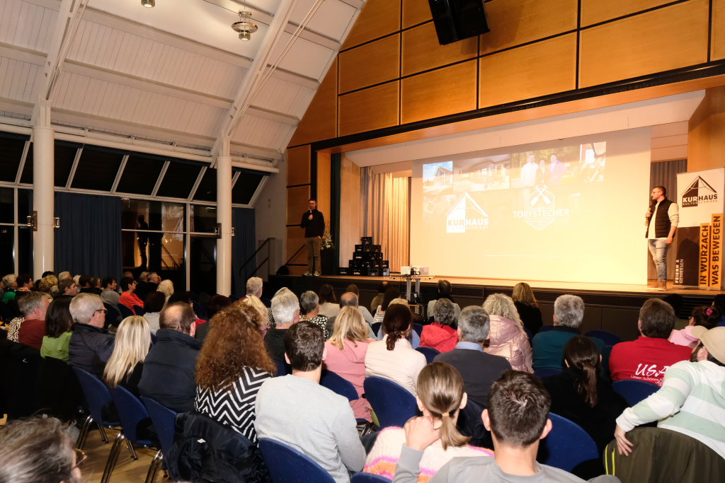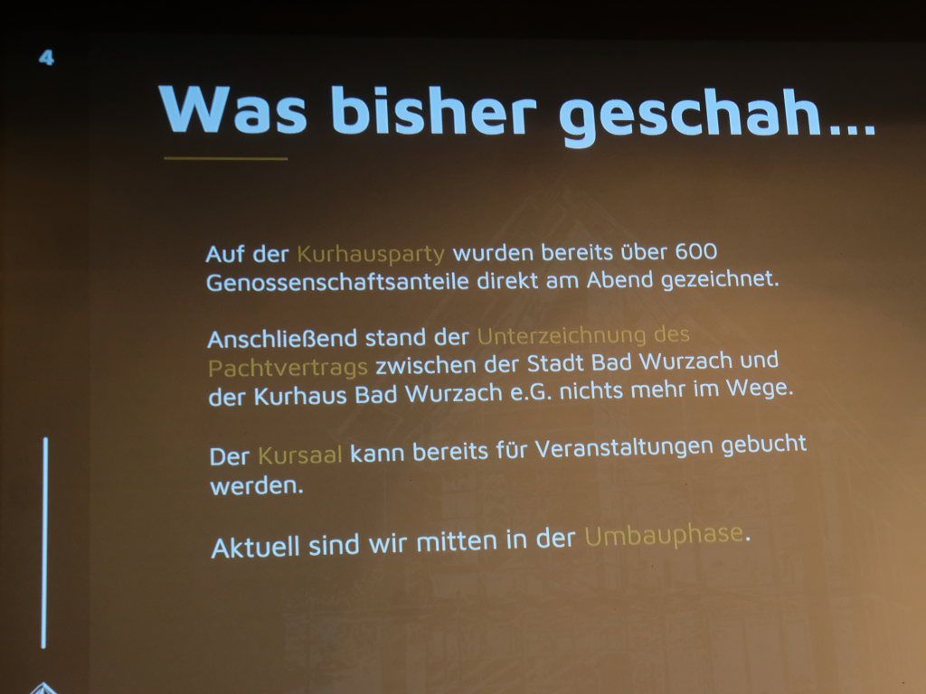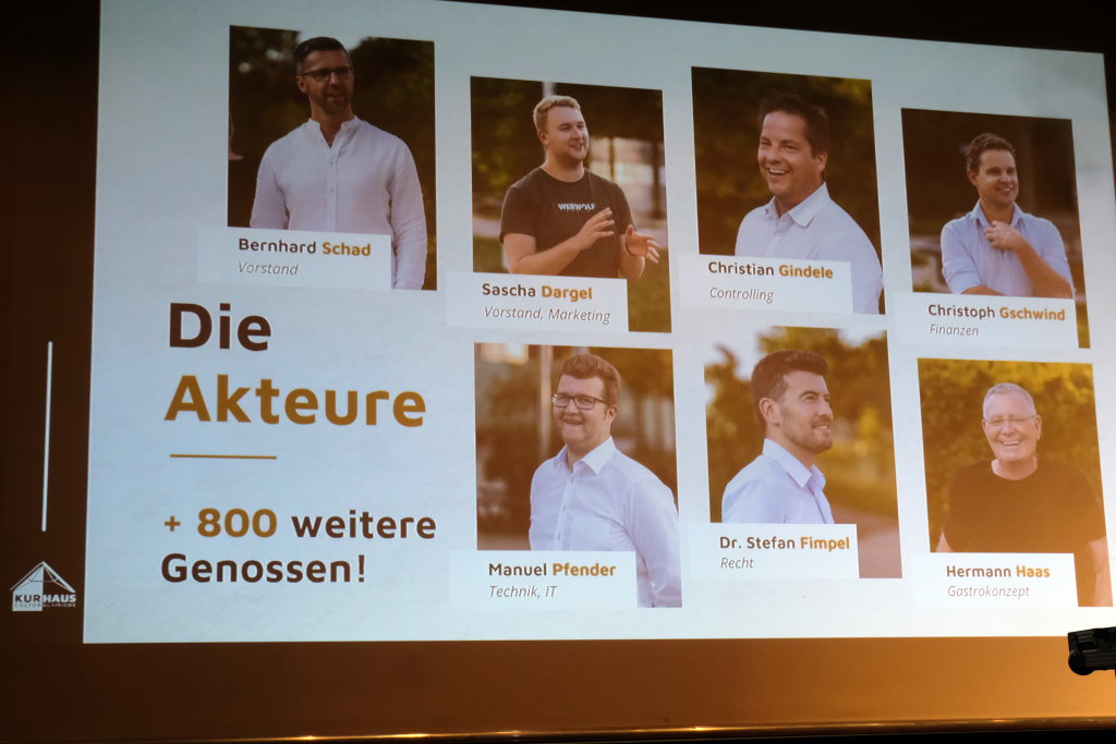 Bad Wurzach – Die Genossenschaft für das „neue“ Kurhaus hat im Rahmen einer „Fortschrittsparty“ die sehr konkreten Vorstellungen, was es in dem Haus zukünftig geben wird, vorgestellt. Rund 350 Besucher, in der Mehrzahl Anteilseigner an der Genossenschaft, sorgten für einen fast vollbesetzten Kursaal, um aus dem Munde der Genossenschaftsvorstände Bernhard Schad und Sascha Dargel sowie Stefan Fimpel vom Aufsichtsrat mehr über die neuesten Entwicklungen und Pläne zu erfahren.