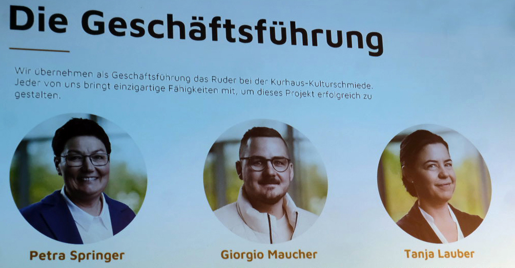 Bei Petra Springer, die als Vertriebs- und Eventmanagerin für die Veranstaltungen im Kursaal zuständig sein wird, war deren Beteiligung schon bekannt. Sie definierte bei ihrer Vorstellung die Buchstaben ihres Vornamens als Programm: P für Power, E für Engagement, T für Teamgeist, R für Richtigen Riecher und A für Ausdauer.