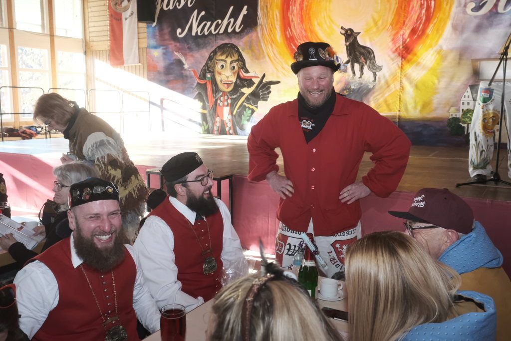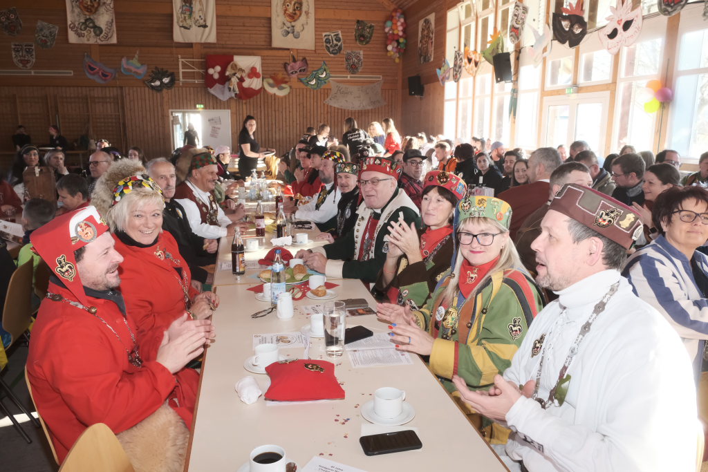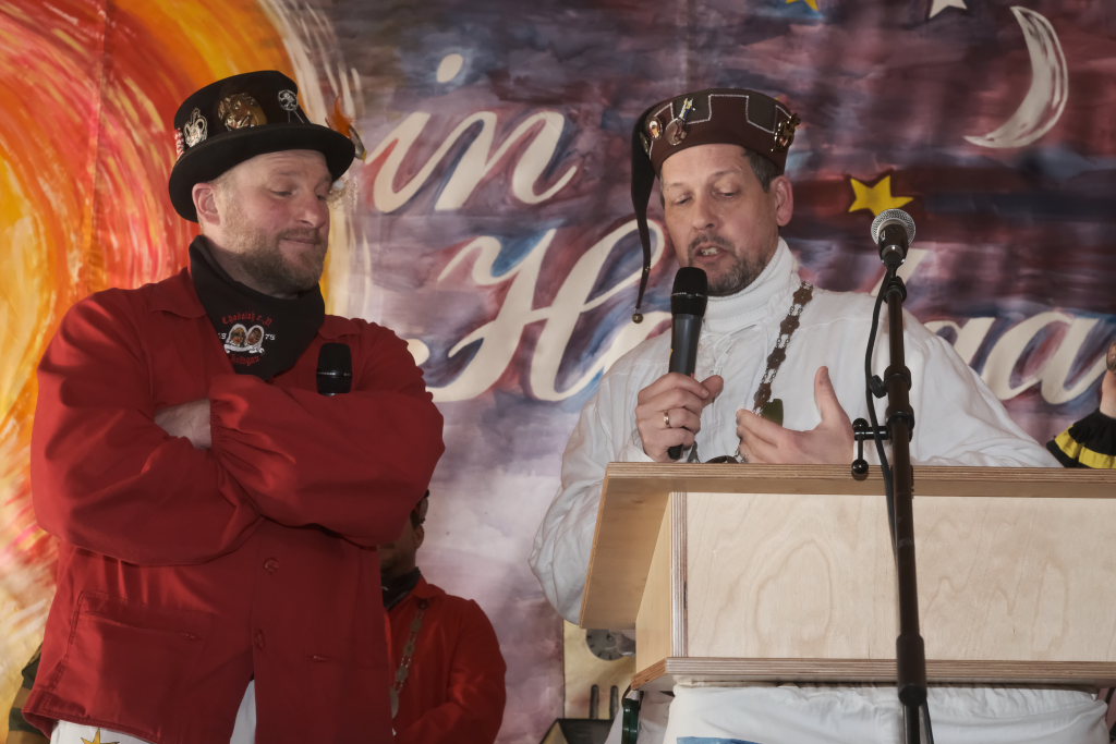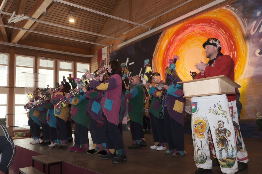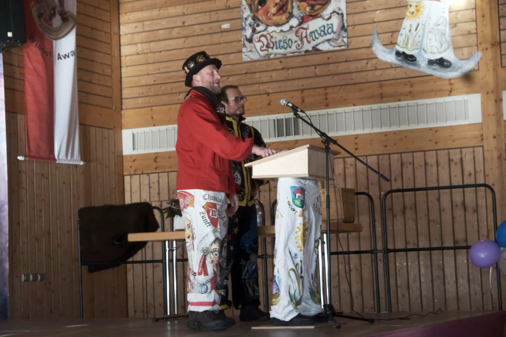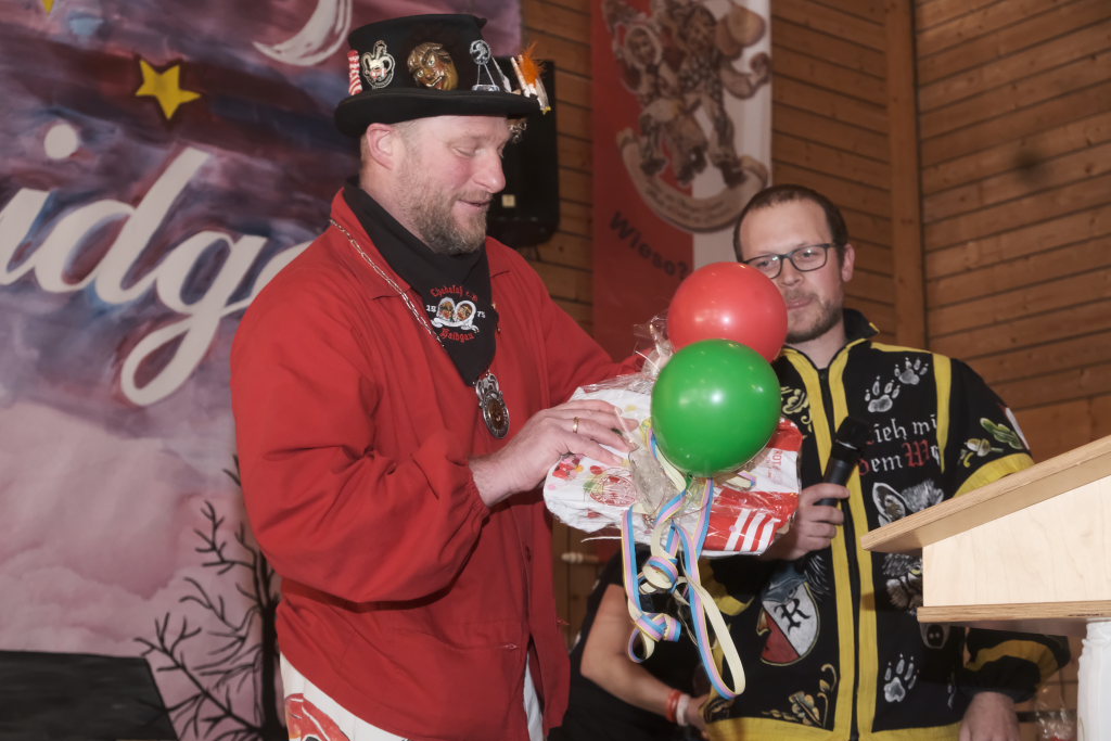 Um Sauberkeit bemüht, hatte die Hausherrin, Ortsvorsteherin Ernestina Frick, dem Zunftmeister einen Staubwedel mit Teleskopstiel als Gastgeschenk mit gebracht und mit den Gelächter im Saal hervorrufenden Worten: „So jetzt hoschd Du den längeren …als König Charles“ überreicht. Hintergrund: Seit einiger Zeit gibt es keinen Hausmeister für die Halle mehr.
