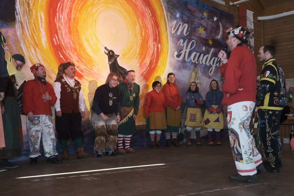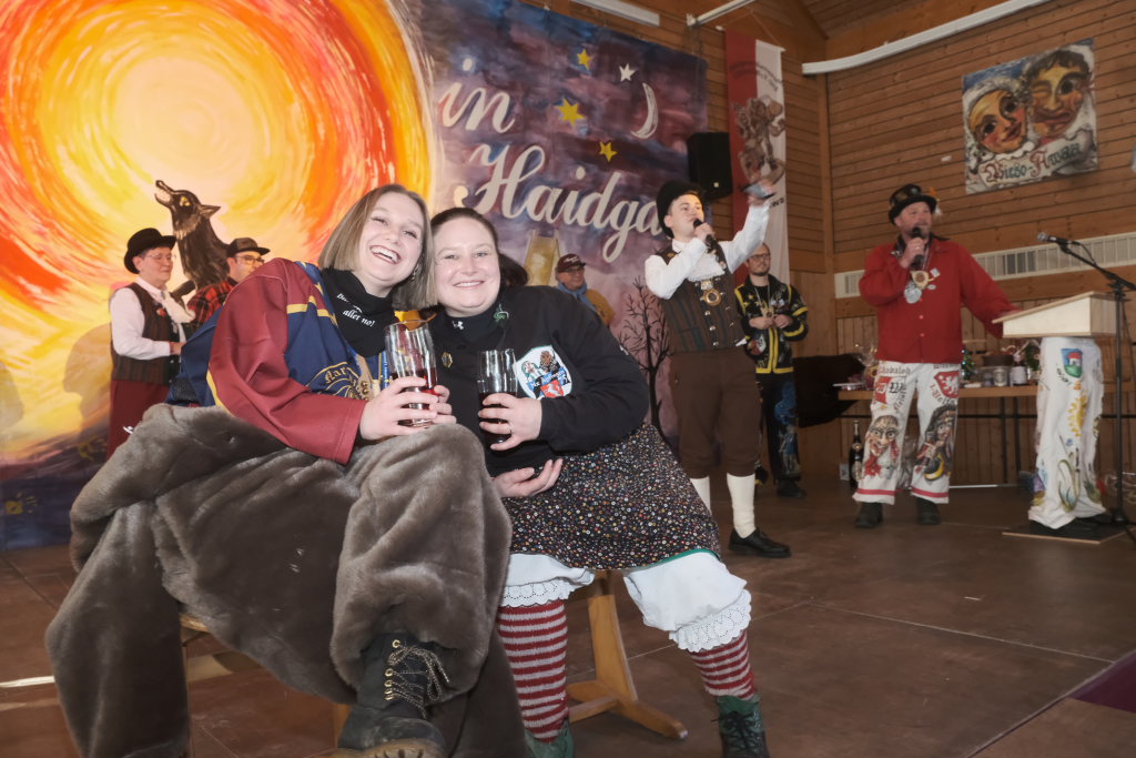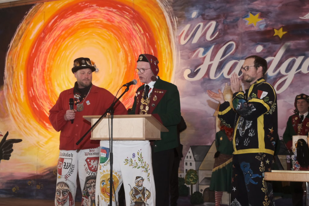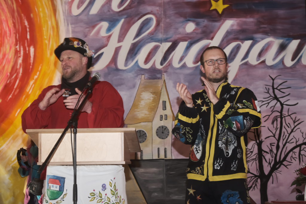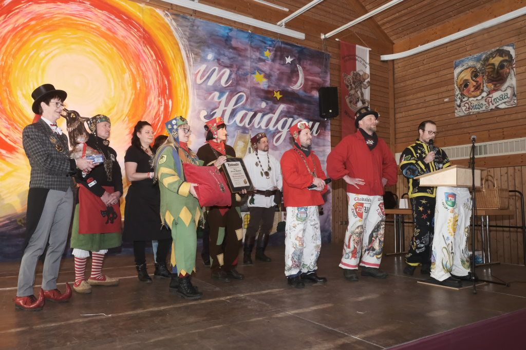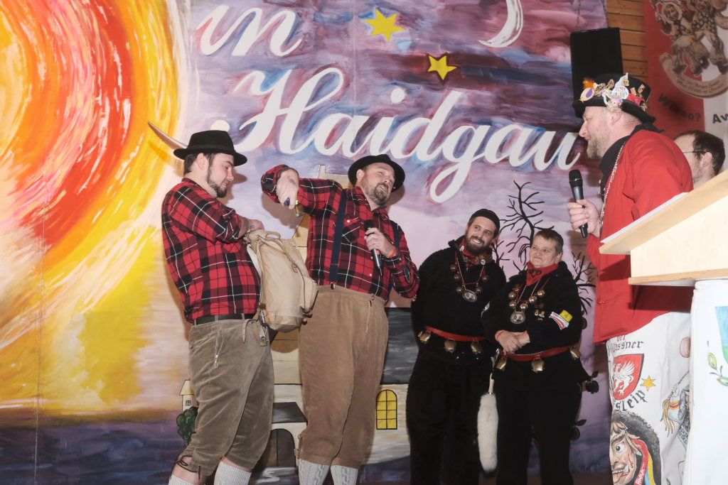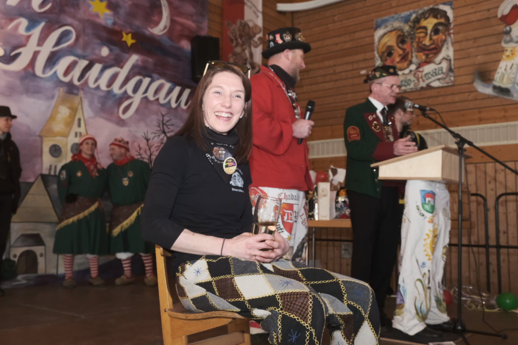 Mit einer gesungenen Liebeserklärung an die Haidgauer Fasnet wartete der Zunftmeister Marco Gärtner der Bockstall Narren aus Weingarten auf. Ein Lied das durchaus das Zeug haben könnte zur Hymne der Haidgauer Fasnet zu werden, wie Iris Kohler die Zunftschreiberin der Chadaloh und musikalisch durchaus bewandert anerkennend feststellte. Einziges Problem dabei: Es müsste jemand im Narrenverein Dudelsack spielen lernen….