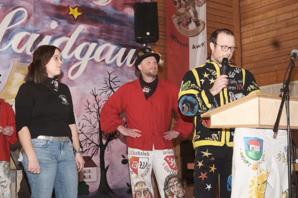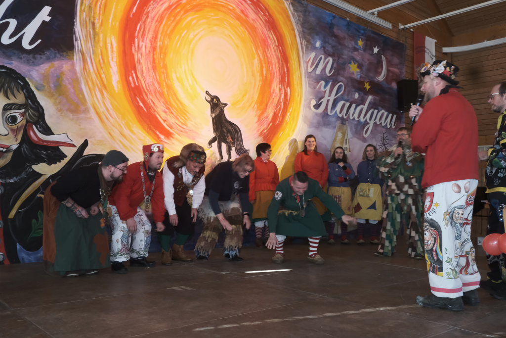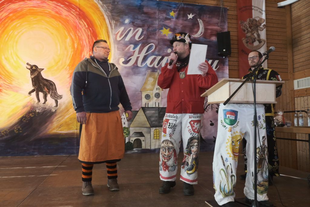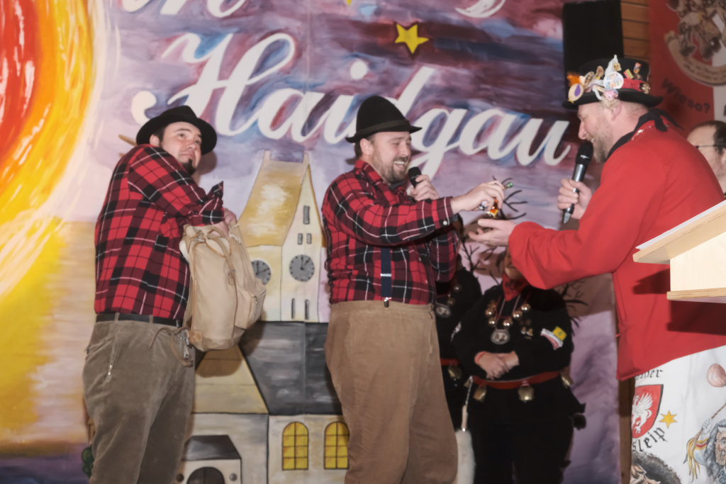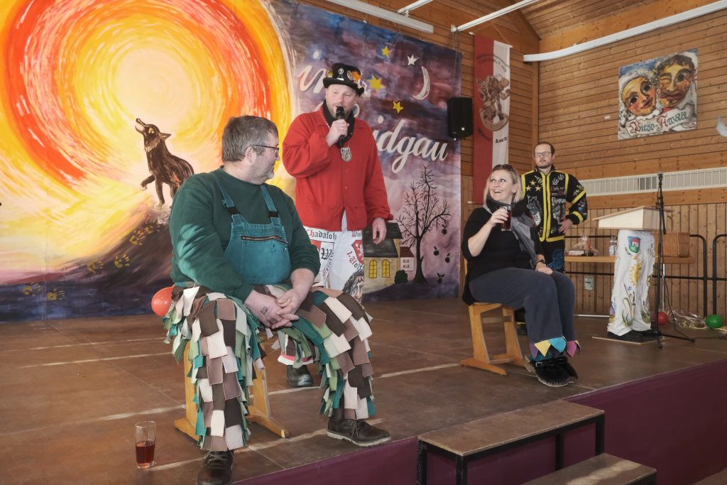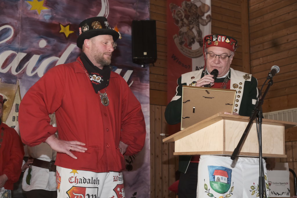 Mit einer gesungenen Liebeserklärung an die Haidgauer Fasnet wartete der Zunftmeister Marco Gärtner der Bockstall Narren aus Weingarten auf. Ein Lied das durchaus das Zeug haben könnte zur Hymne der Haidgauer Fasnet zu werden, wie Iris Kohler die Zunftschreiberin der Chadaloh und musikalisch durchaus bewandert anerkennend feststellte. Einziges Problem dabei: Es müsste jemand im Narrenverein Dudelsack spielen lernen….