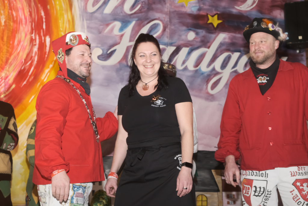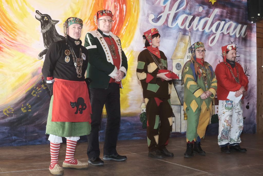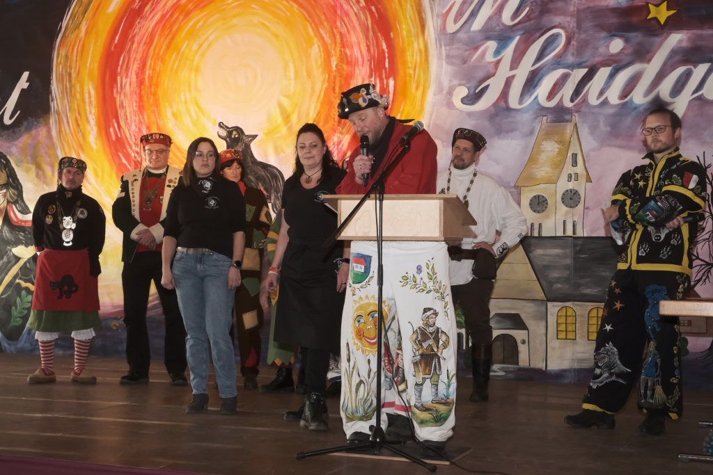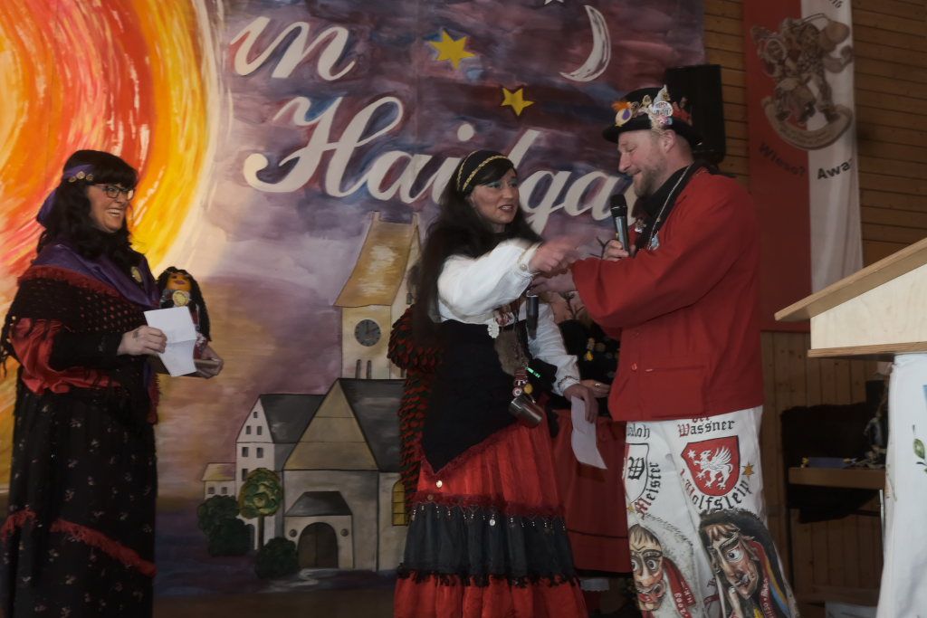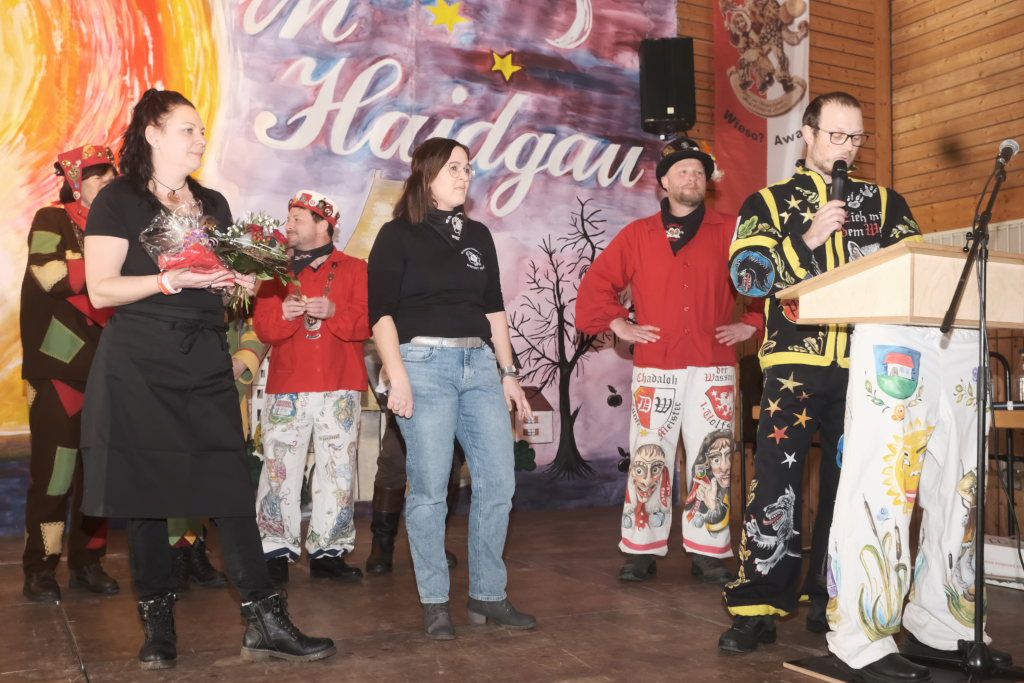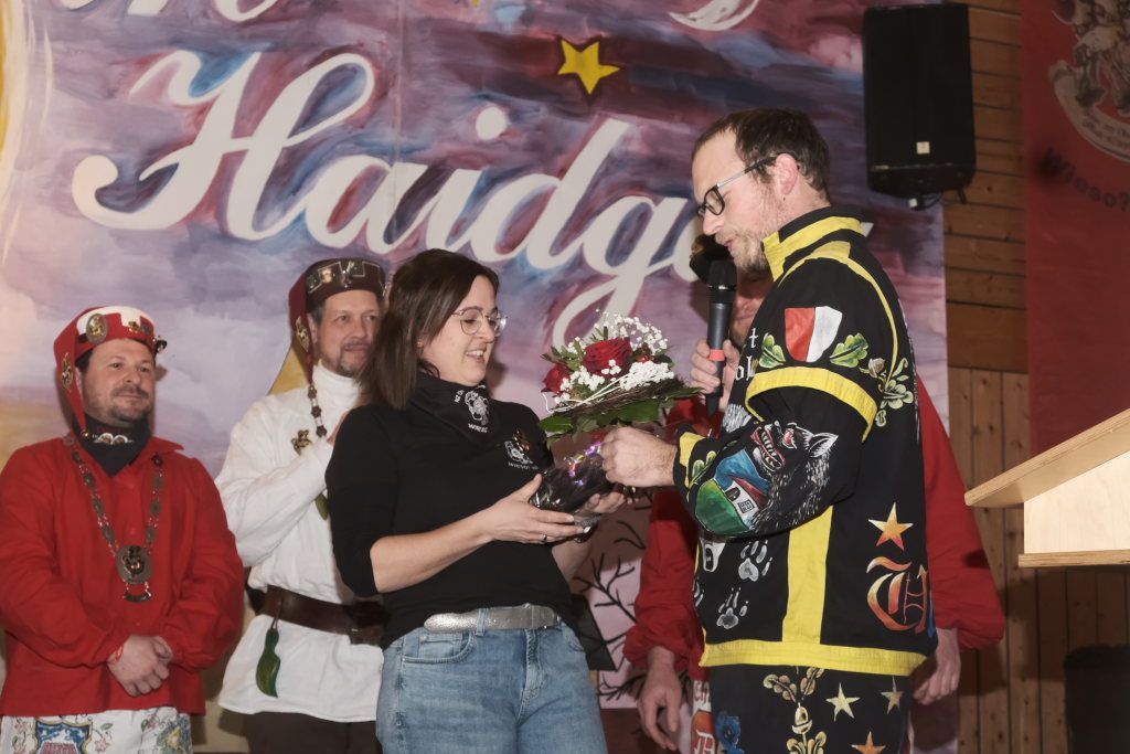 Die Laudatio auf Marietta Etz hielt Zunftmeister Daniel Wassner. Sie hatte ihre närrische Laufbahn im Jahr 2000 bei der Narrengilde Unterschwarzach begonnen und stellte dann 2006 fest, nachdem sie ihren Mann Holger Etz, damals Schriftführer der Chadaloh kennengelernt hatte, dass sie in ihrem Herzen auch für zwei Zünfte Platz hatte. Seitdem springt sie in Haidgau als Pebo mit. Beim Zunftball wirkt sie alljährlich auf der Bühne mit, betreut beim Umzug und am Gumpiga die Kaffeebar und ist auch jedesmal bei der Hallendeko mit dabei.