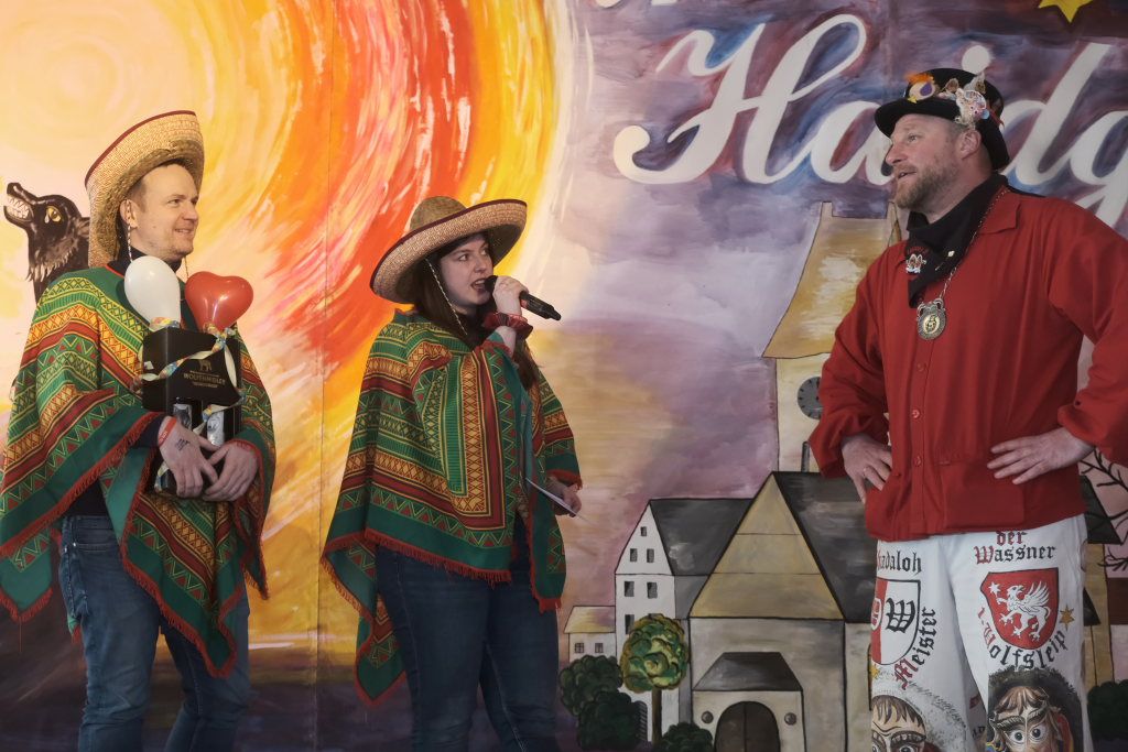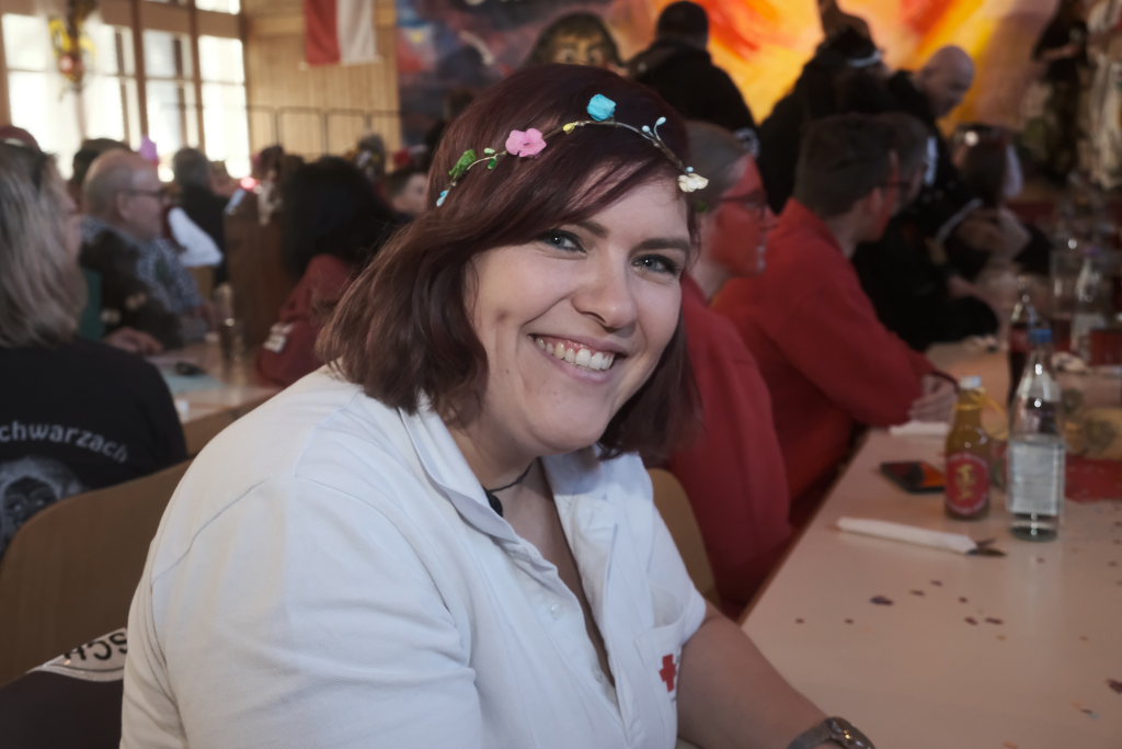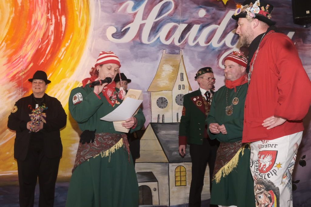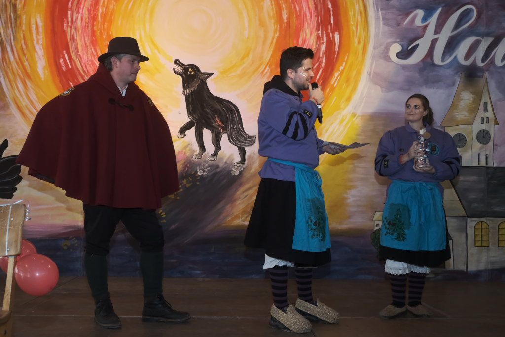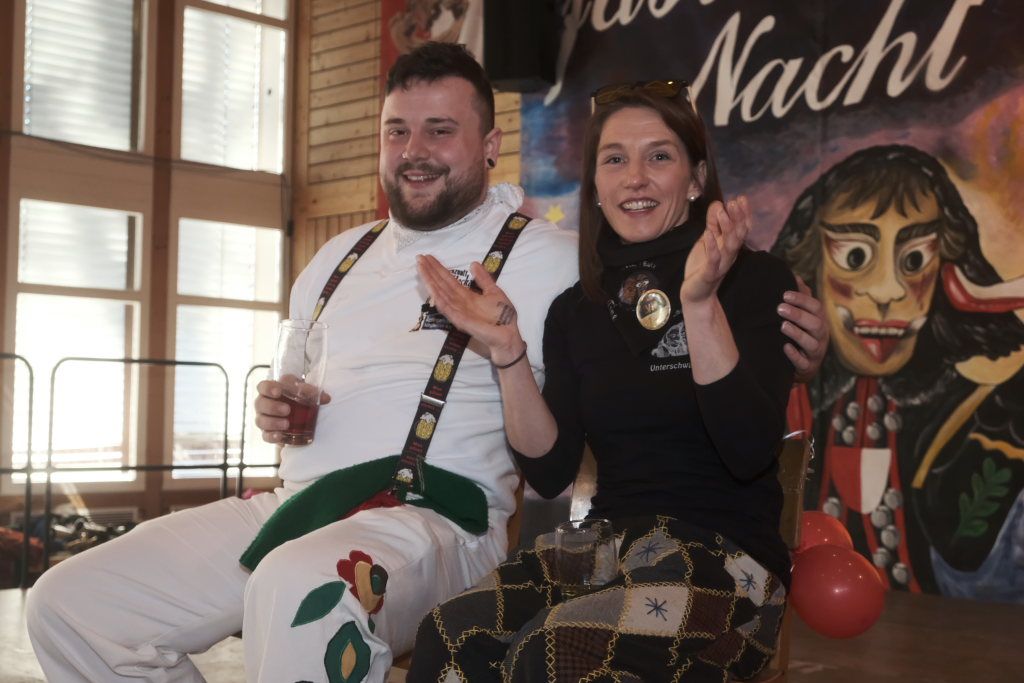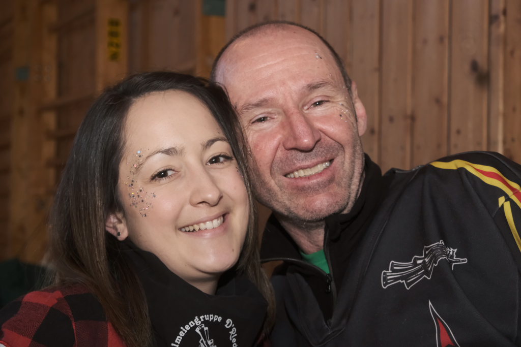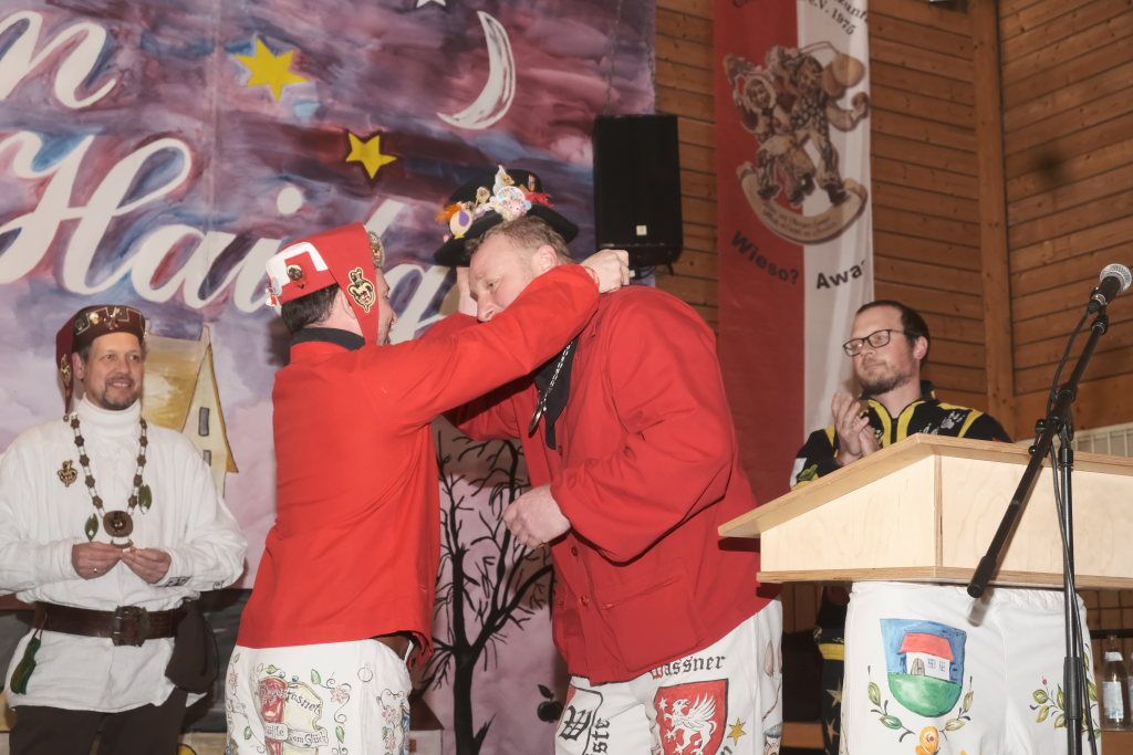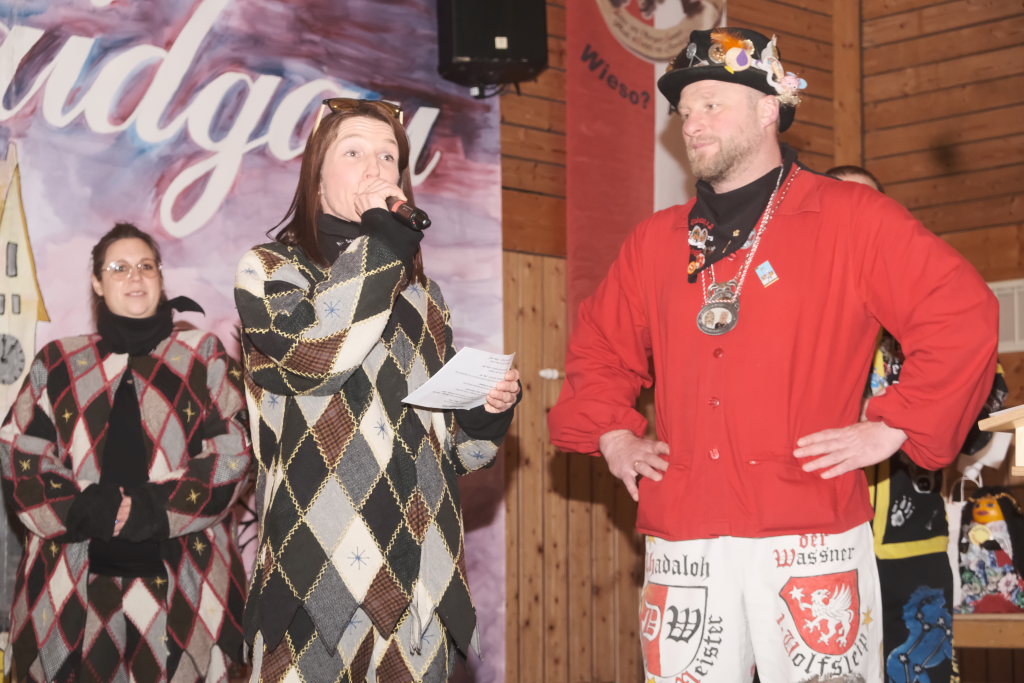 Für Diana Rösch hielt die Laudatio Vizezunftmeister und Ehemann Peter Rösch. Diese war 2009 zur Haidgauer Zunft gestoßen, weil ihr damaliger Freund (und jetziger Ehemann) dort schon lange dabei war. Schnell wurde klar, dass es ihr viel Spaß macht mit zu springen. Natürlich habe sie ihm den Rücken freigehalten, sorge beim Zunftball für Tanz und mehr. Und für die Haidgauer Fasnet schaffe sie viel im Hintergrund, weswegen auch der Hästrägerorden, sehr verdient sei. Er wisse, dass sie es nicht so schätze, wenn er das so öffentlich sage, aber an diesem tag müsse sie es einma ertragen: „I will mi ganz oifach ganz arg bei dir bedanka, und hoff´dass Du mir no lang diesen halt gibsch für solche närrischen Veranstaltungen.“