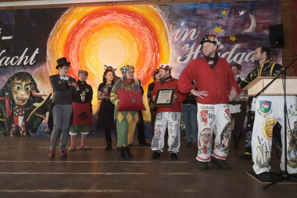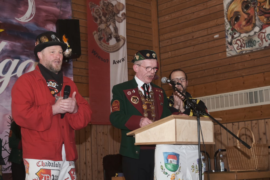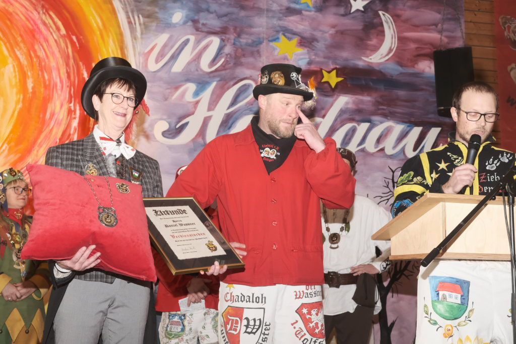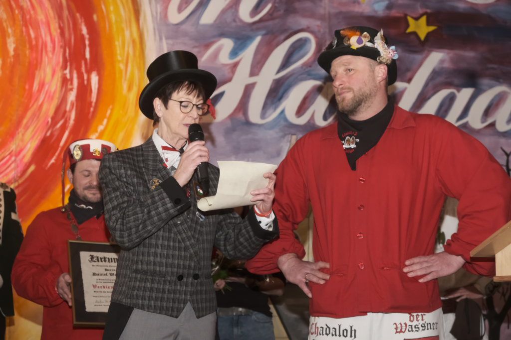 Dies gelang wohl auch, weil zwei weitere verdiente Närrinnen der Chadalohs,, Marietta Etz und Diana Rösch mit dem Hästräger-Orden ausgezeichnet wurden, womit dem in dieser Hinsicht ahnungslosen Zunftmeister das Großaufgebot an Präsidiumsspitzen des ANR erklärt werden konnte.