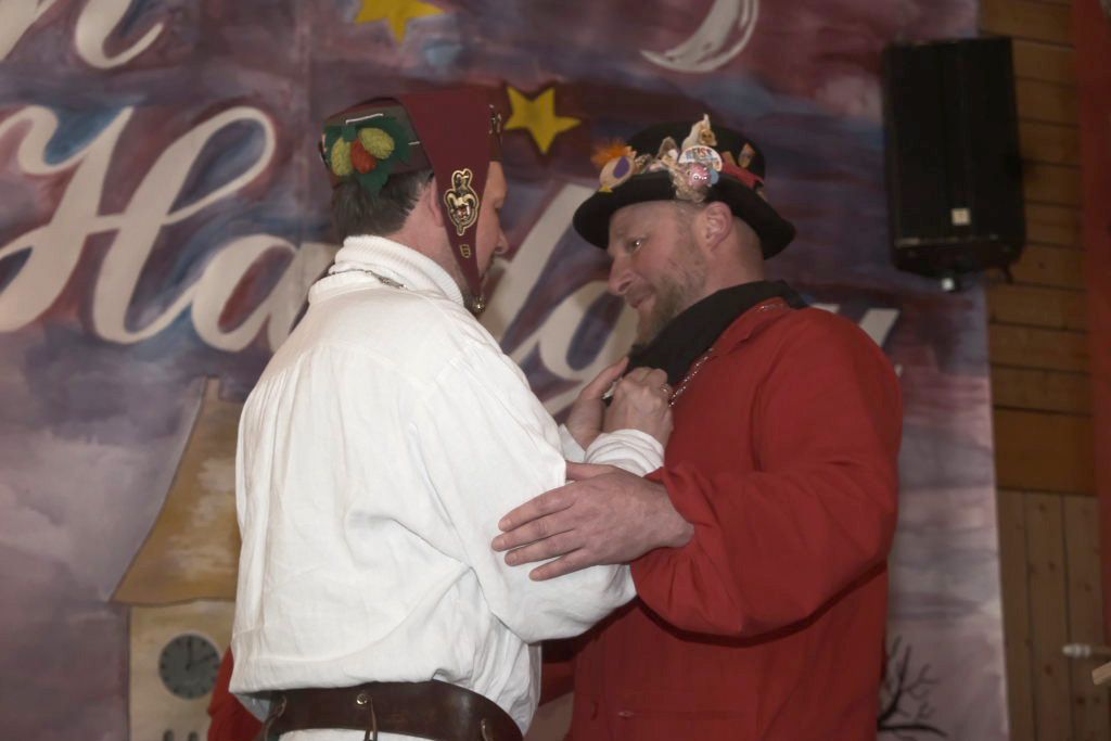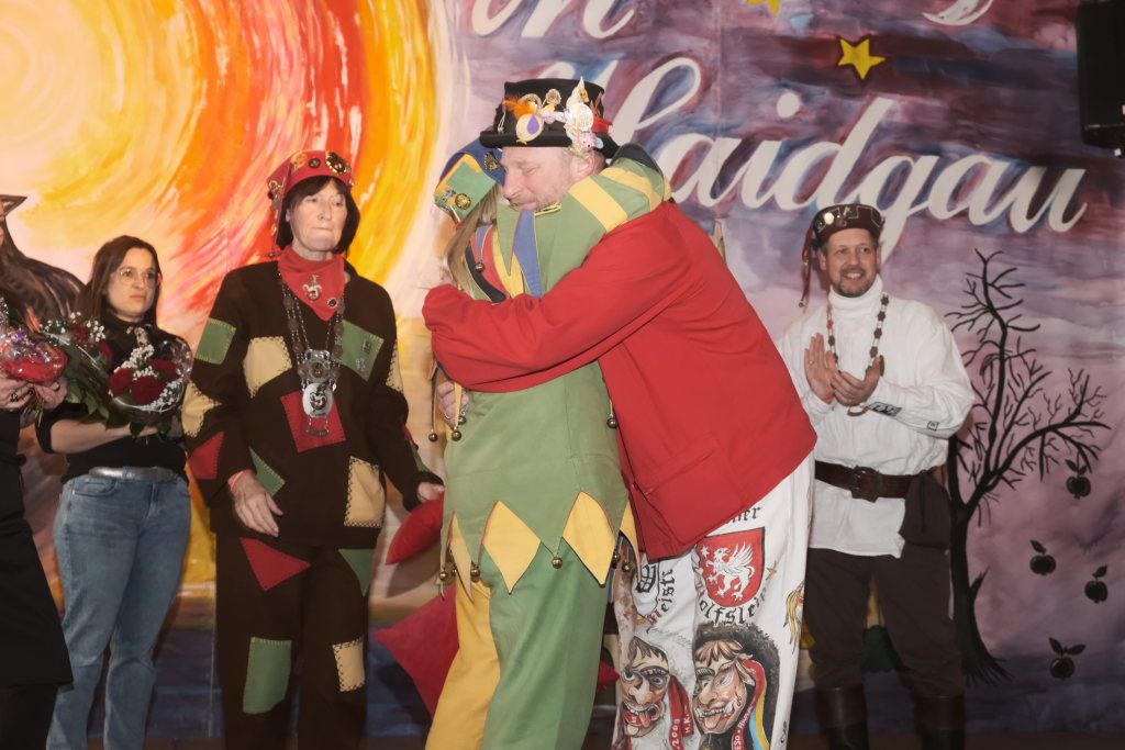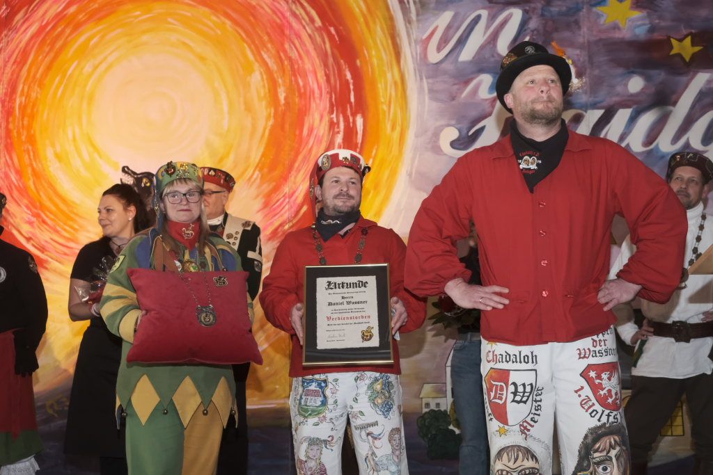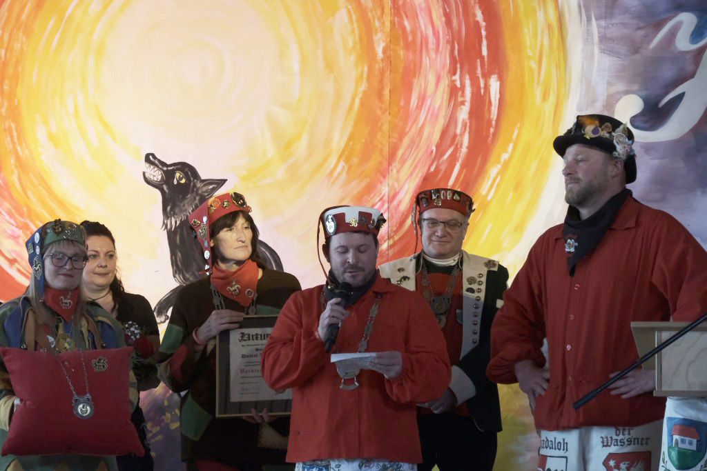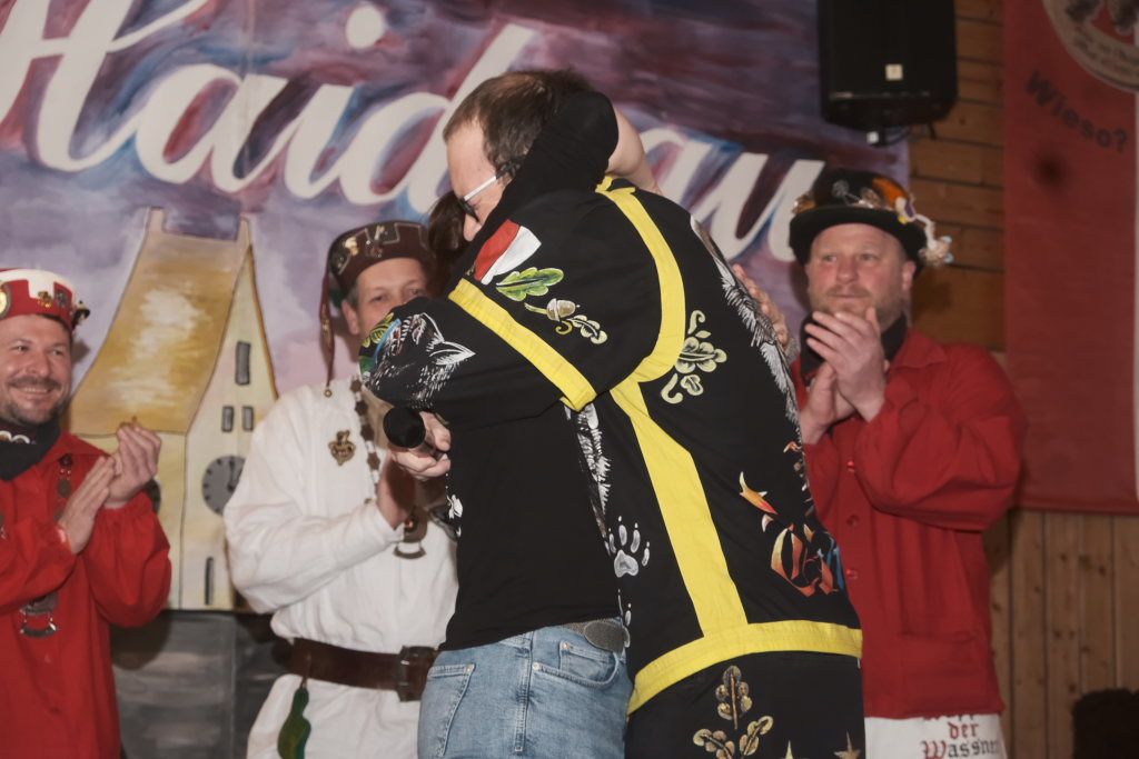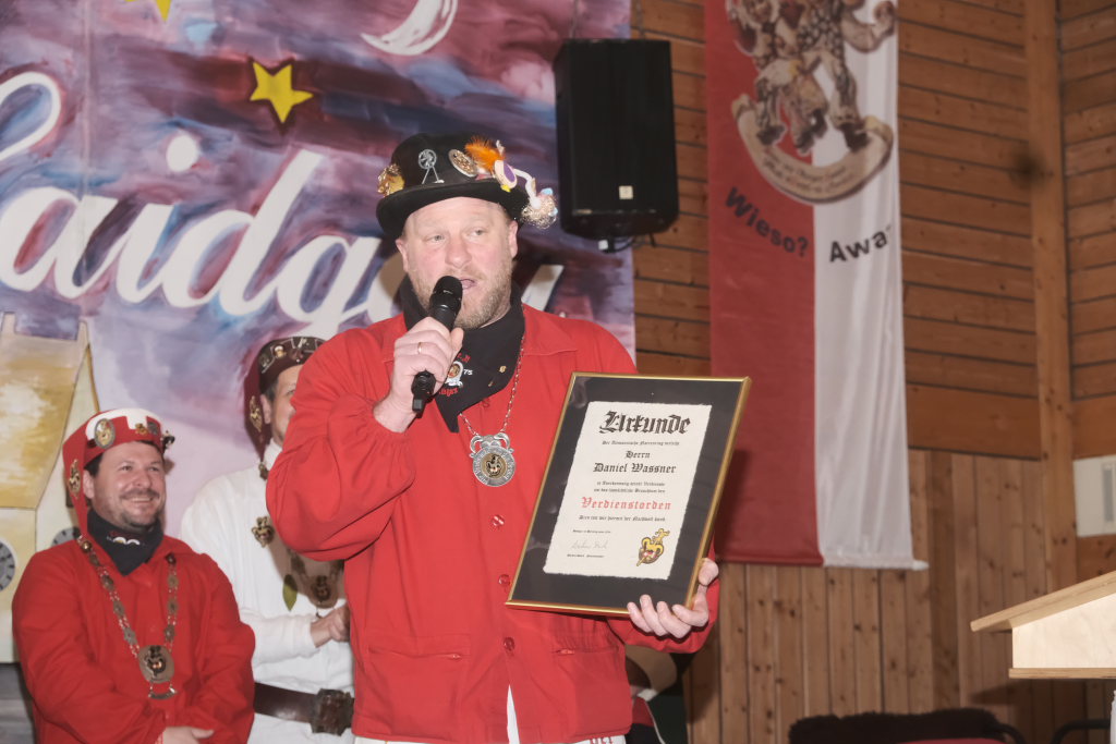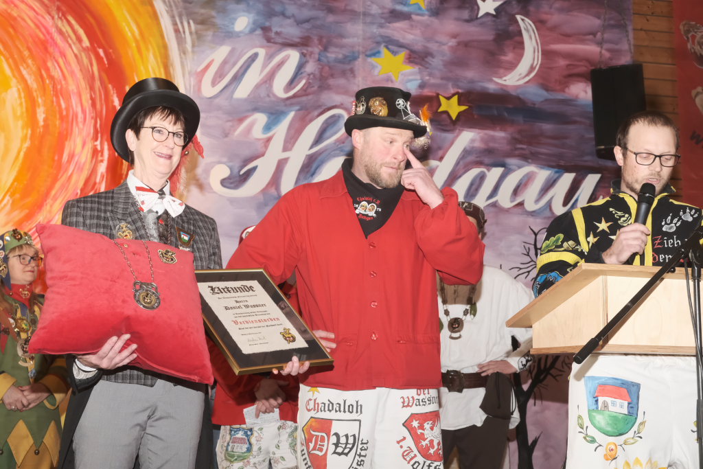 Dann, als Daniel Wassner schon zum Tagesgeschäft übergehen wollte, kam die große Überraschung für ihn: Doris Bendel, seine Vorgängerin als Zunftmeisterin kam im Häs der Fasnetsladerin auf die Bühne und hielt die Laudatio für den sichtlich gerührten Zunftmeister: „Du bisch koin Ma der großen Orda, de isch mir scho klar, jedoch der Verdienstorda kehrt an dei Brust scho lang mol na.“