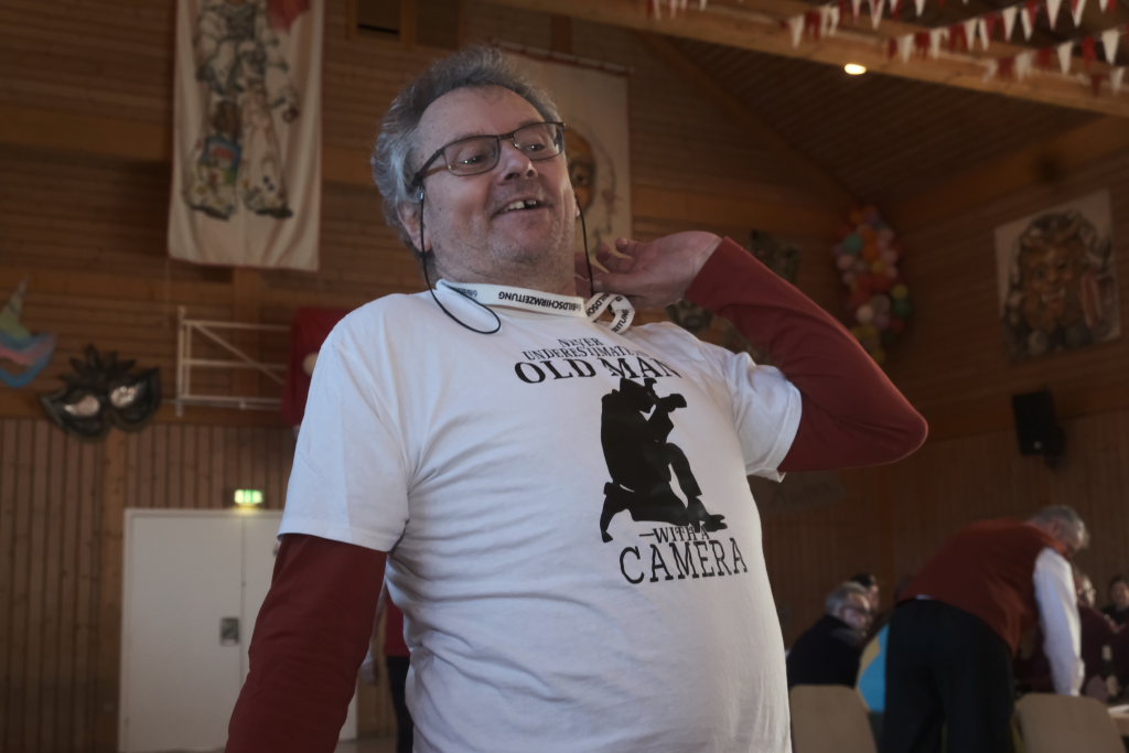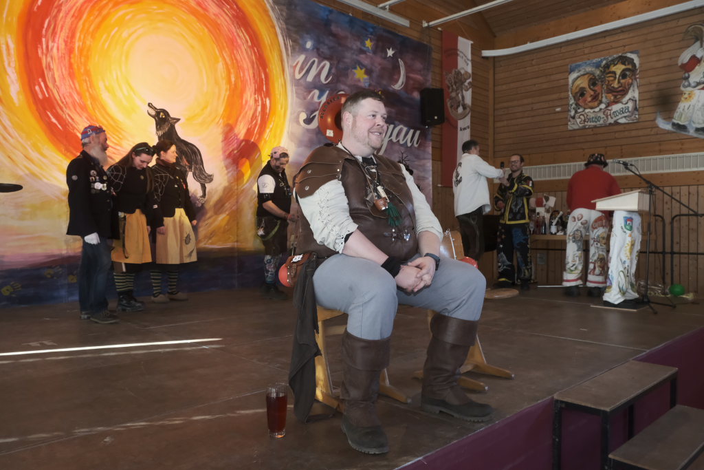 Willi Butscher, Zunftmeister der Langjupp aus Seibranz stellte das neue „Häs“ seiner Zunft, den „Wandersmann“ vor dem versammeltem ANR Präsidium vor. Bemerkenswert: Er war zum Zunftmeisterempfang mit dem Fahrrad (!) angereist. Was wegen der frühlingshaften Temperaturen beinahe folgerichtig war.