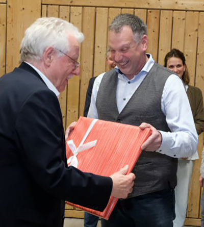 Der stellvertretende Ortsvorsteher Gebhard Baumann überreicht das Geschenk des Ortschaftsrates – mit der Bitte, der Beschenkte möge es sogleich öffnen …