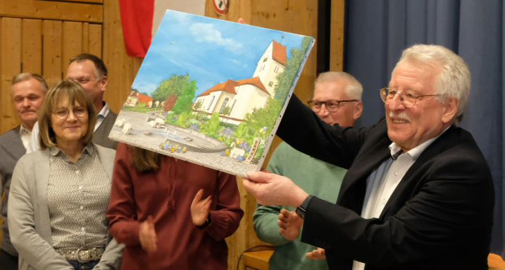 Der nächste Programmpunkt an diesem denkwürdigen Abend war die Übergabe des Geschenkes des Ortschaftsrates. Dieses war ein Gemälde von Silke Vincon, einer gebürtigen Arnacherin, das ein zentrales Projekt von Raunekers Amtszeit darstellt: den Dorfplatz mit dem Schäfchenbrunnen.