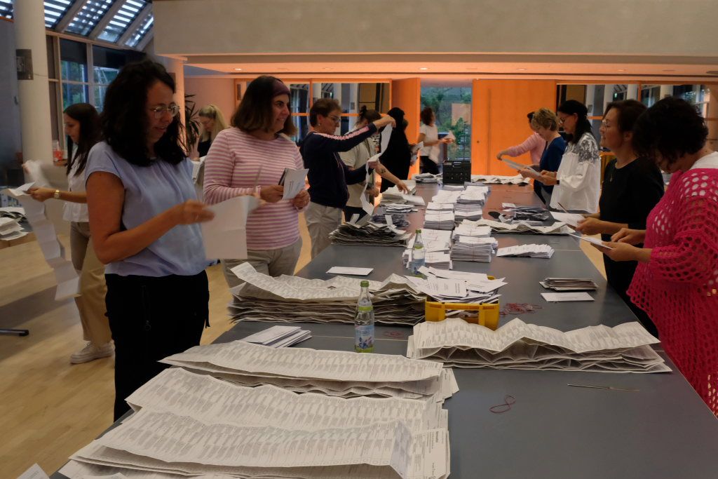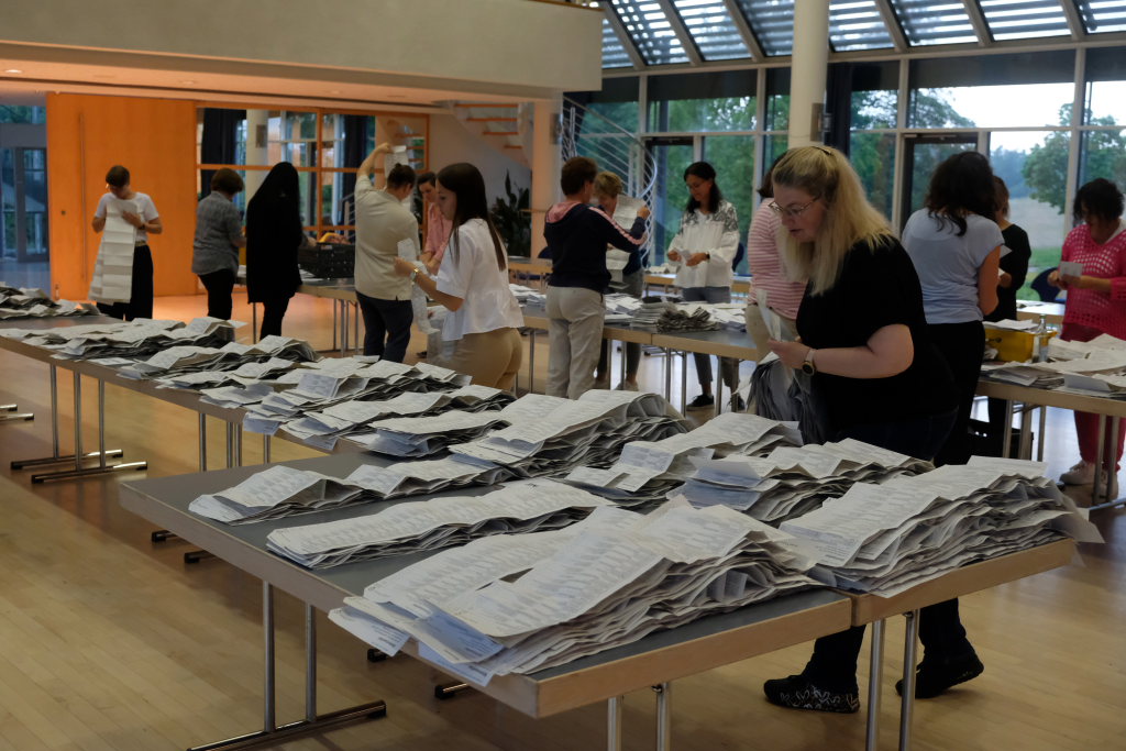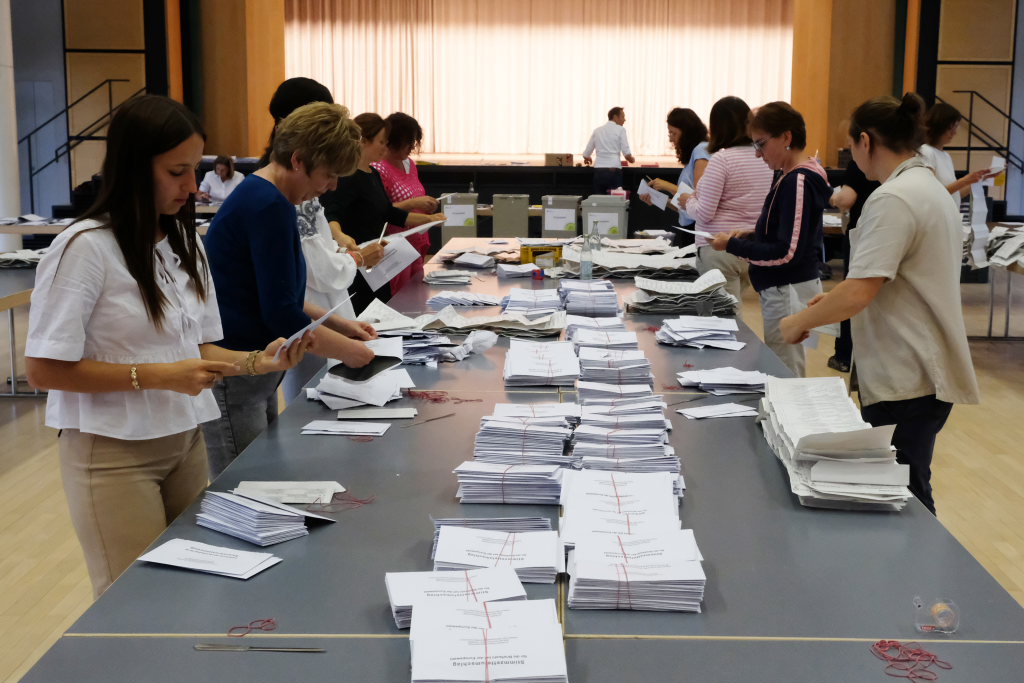 Die beeindruckenden Stapel der Europawahlzettel bei der Auszählung der Briefwahlunterlagen im Kursaal. Foto: Uli Gresser