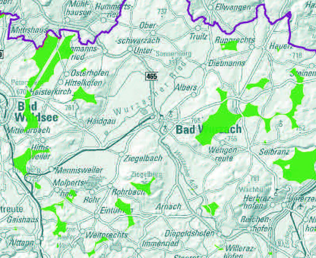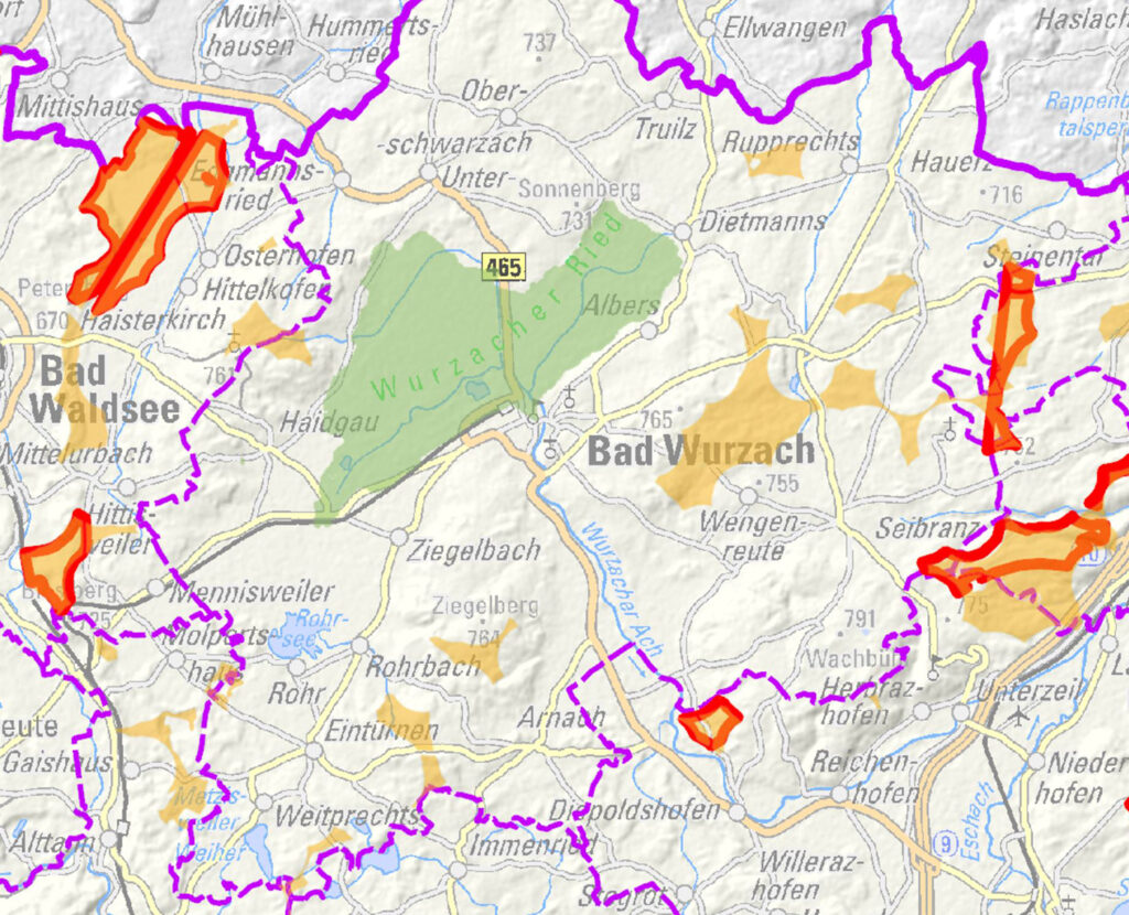 Auf den am 11. Juli 2023 vom RVBO vorgestellten Suchraumkarten waren 11 Prozent der Verbandsfläche als für Windkraft möglich deklariert worden (grün markiert) – darunter im Gemeindegebiet von Bad Wurzach in Sichtweite des Riedes der Ziegelberg und der Stadtwald Richtung Wengenreute sowie der Hummelluckenwald bei Humberg und weitere Gebiete (bei Rupprechts, bei Humberg zusätzlich noch eine Zone im Süden und sogar ein Bereich rund um die Kartause Marienau bei Seibranz) sowie – knapp hinter der Gemeindegrenze – der Alttanner Wald zwischen Weitprechts und Alttann und bei Weitprechts zusätzlich noch eine Zone östlich des Ortes. Der Kartenausschnitt wurde der Webseite des Regionalverbandes entnommen.
