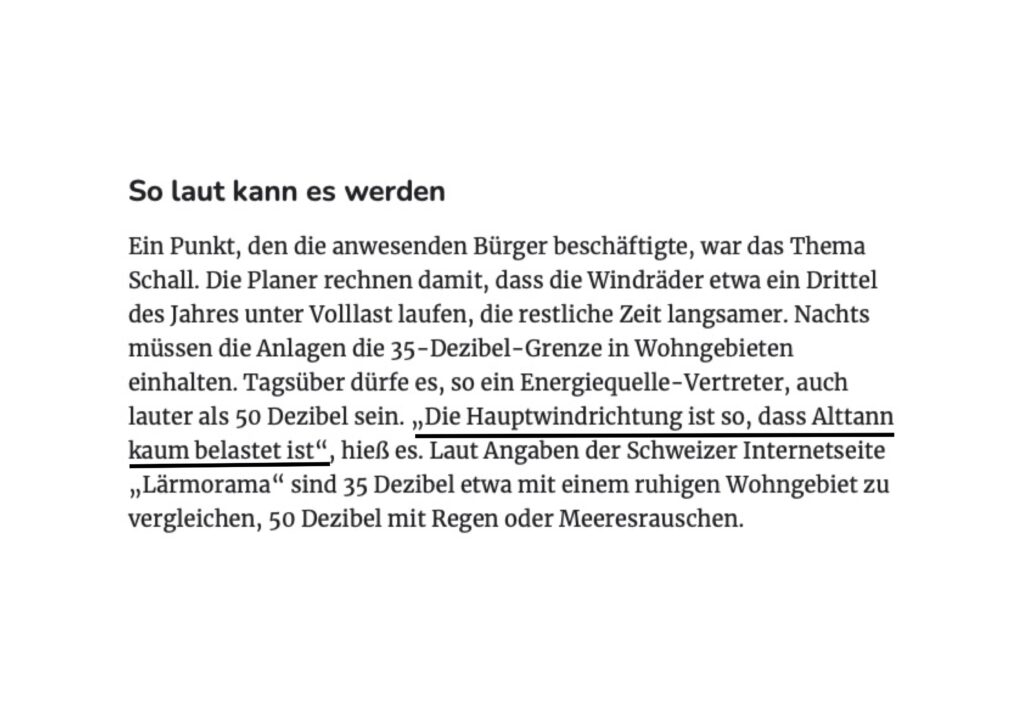 Denn zur Wahrheit gehört, dass die Projekte Weitprechts-Alttann und Humberg vom Projektierer beinhart durchgezogen werden. Bei der Vorstellung des Projektes „Alttanner Wald“ durch die projektierende Firma des Herrn Böhm aus Kirchdorf und die Erfurter Firma „Energiequelle“ Anfang Oktober in Wolfegg waren nur die Bürger von Wolfegg, wozu Alttann gehört, nicht aber die Einwohner des zu Bad Wurzach gehörenden Ortes Weitprechts zugelassen – obwohl die geplanten Anlagen näher bei Weitprechts als bei Alttann zu stehen kommen. Bei jener Informationsveranstaltung in der Orangerie des Fürsten von Wolfegg wurden die Lärm-Ängste der Anwohner laut Bericht der „Schwäbischen Zeitung“ vom 3. Oktober wie folgt beschieden: „Die Hauptwindrichtung ist so, dass Alttann kaum belastet ist.“