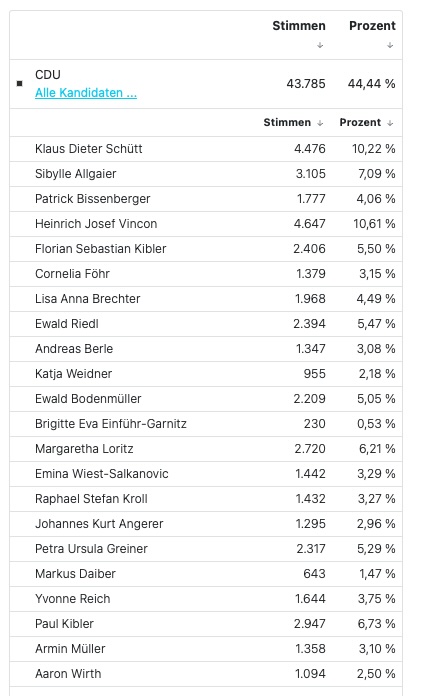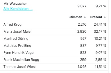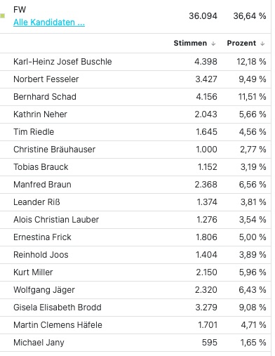 Stimmenkönig ist Heinrich Vinçon (CDU), der 4647 Wählervoten auf sich vereinigen konnte. Ihm am nächsten kommen Klaus Schütt (CDU; 4476 Stimmen), Karl-Heinz Buschle (Freie Wähler; 4398) und Bernhard Schad (FW; 4156). „Chief“ Franz Josef Maier (2920; Mir Wurzacher) ist wieder drin, während der hoch gehandelte Grüne Dr. Ulrich Walz (628) es nicht geschafft hat.