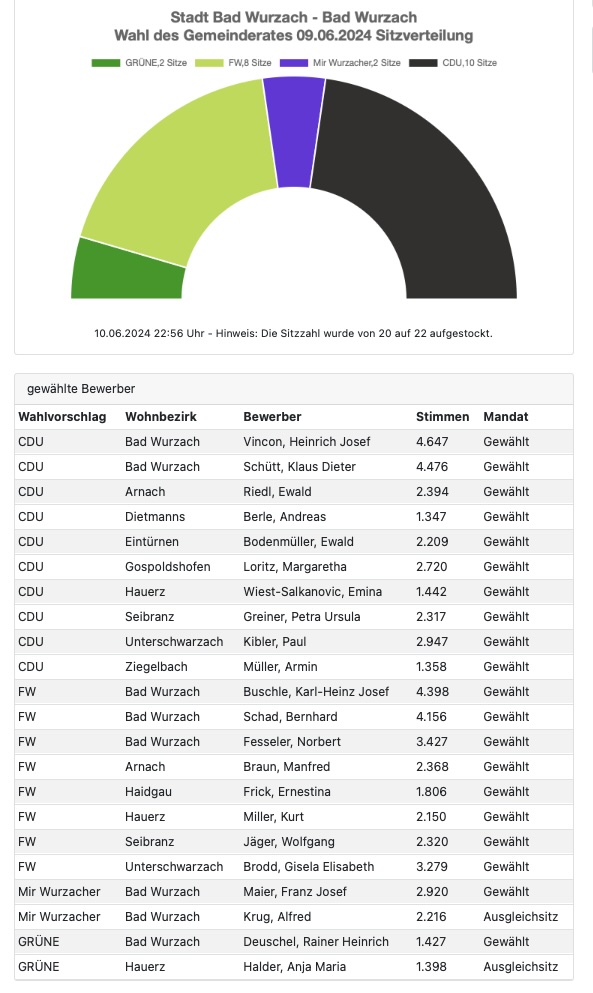 Nachstehend die Sitzverteilung im Diagramm und Ergebnislisten, der Webseite der Stadt Bad Wurzach entnommen (dort eingestellt am Montag um 22.56 Uhr):