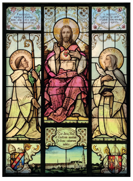 Ausgehend von diesem Glasfenster-Motiv in der heimischen Abtei betrachtete Abt Vinzenz das Geheimnis des Herzens Jesu.