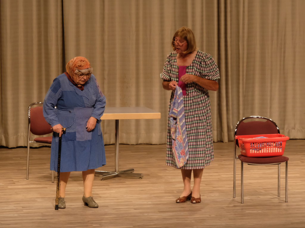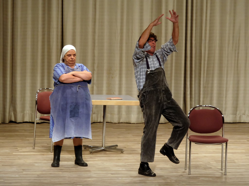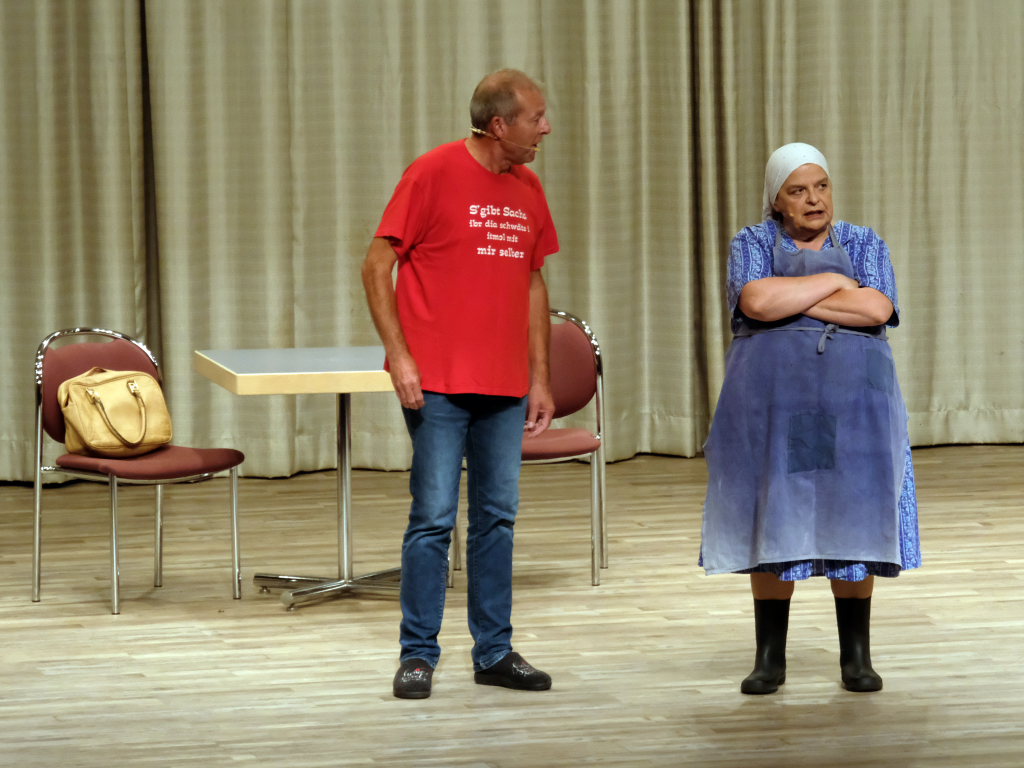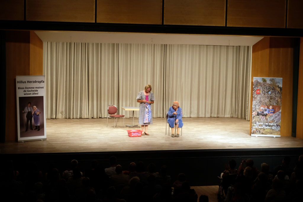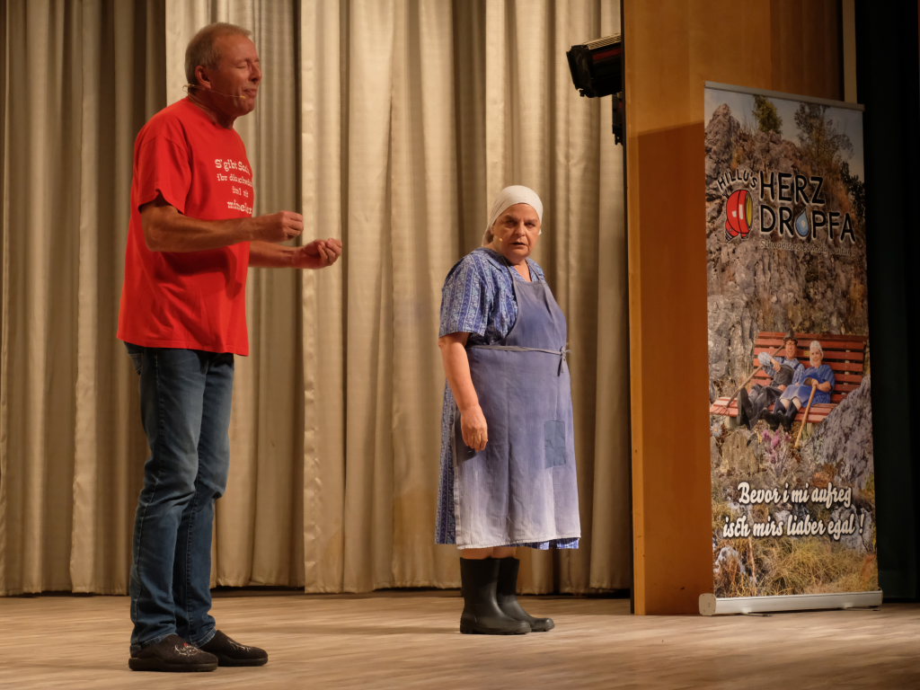 Deftig wird es auch, wenn’s „Herzdröpfle“ Franz als Raatschweib, die um einige Jahrzehnte gealterte Hillu fragt, warum sie bei Beerdigungen ihre Blumen immer nach hinten wirft: „Damit ma weiß, wer als nägschder dra isch.“ Und wenn die beiden sich gegenseitig ihre neuen Unterhosen präsentieren.