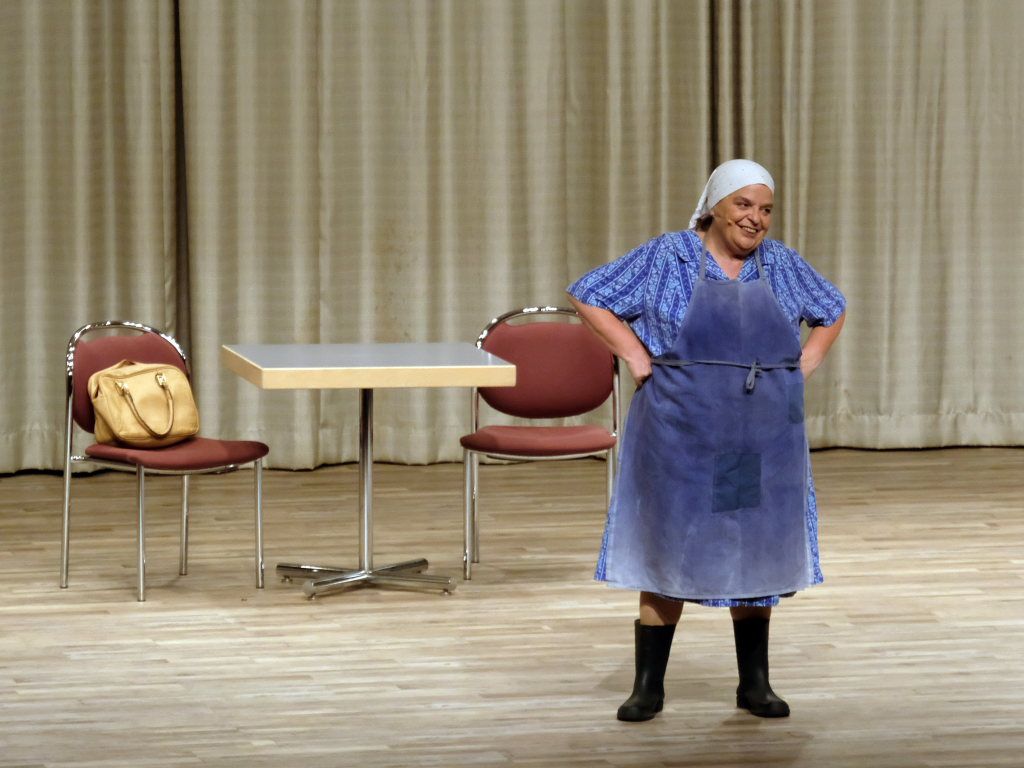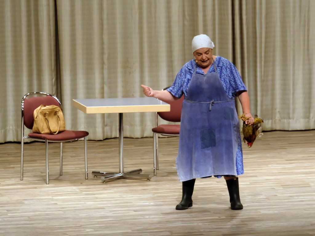 Und während ihr „Herzdröpfle“ Franz sich in ihren Maddeis verwandelt, erzählt Hillu alias Lena die Geschichte von der Frau Hegga-Scheißere und Feinstaub-Huschterin, die, nachdem sie beinahe Lena mit ihrem roten Bulldog – „die grüne sind nur für Arme“ gerammt hätte“ – wobei deren gerade eingelernter Hahn unter die Räder kam, wie also diese Dame aus der Landeshauptstadt in ihrer Penetranz „direkt in´d Soichrinna neihagelt“.