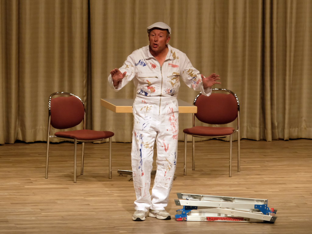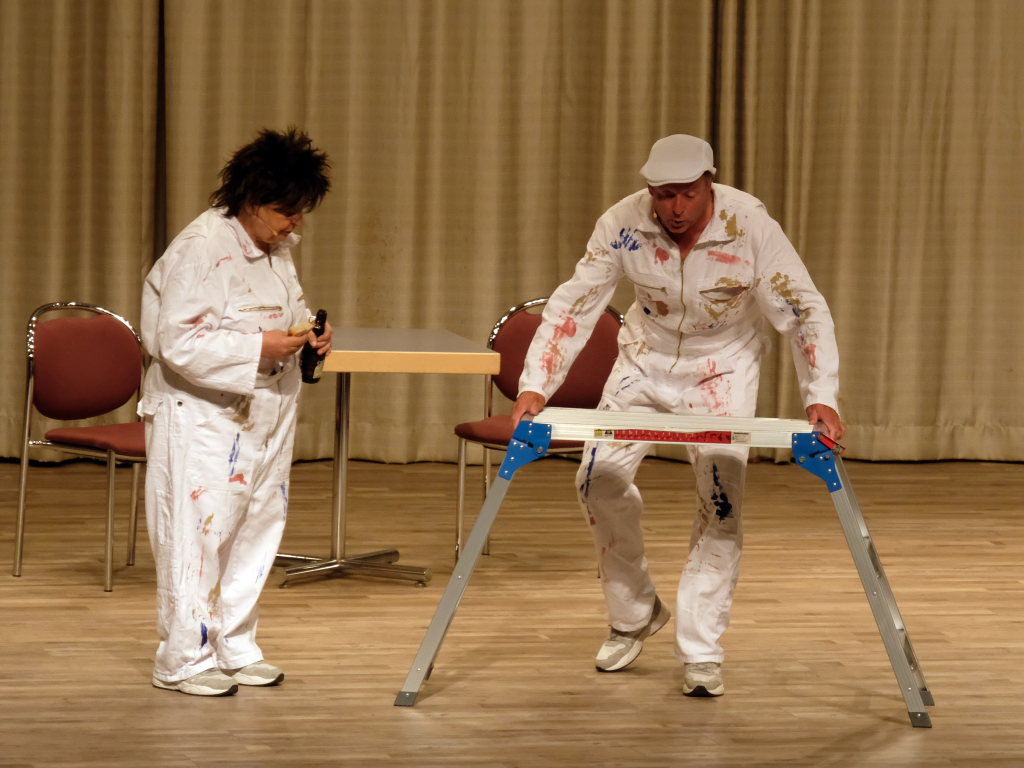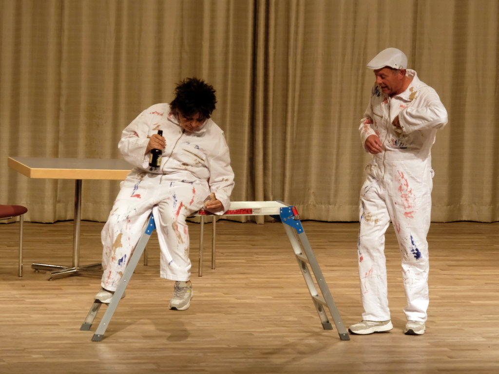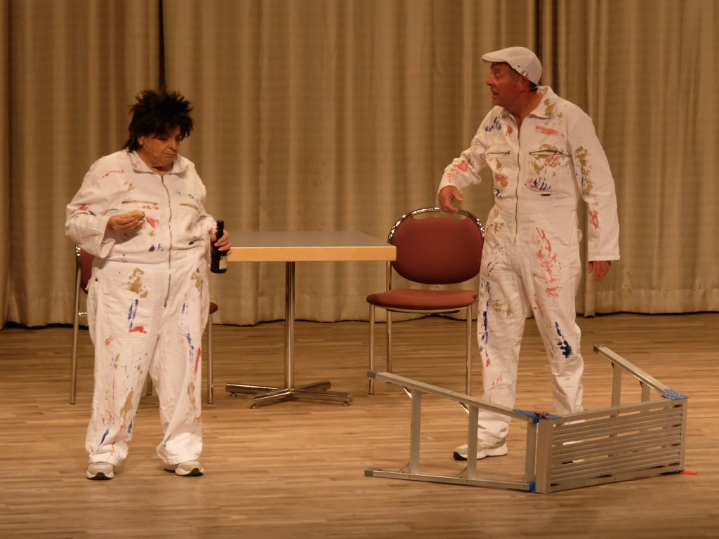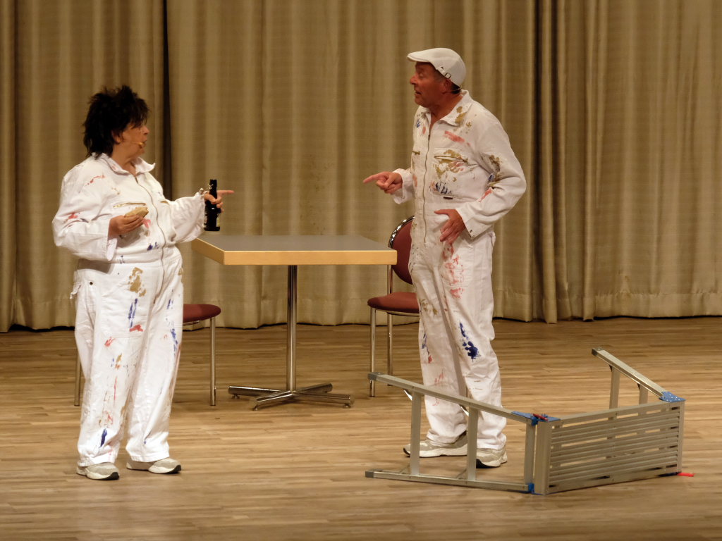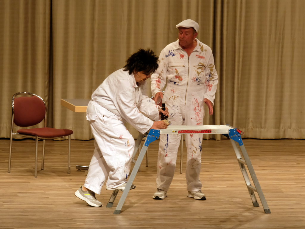 Ein Highlight jagt im Programm von Hillu´s Herzdröpfle das nächste, so auch wenn Hillu als vorlauter und arbeitsscheuer Malerlehrling mit dem Gesellen Franz über das Liebesleben ihres Meisters philosophiert: „Wie ein Streichholz entzündet er sich an der eigenen Schachtel!“