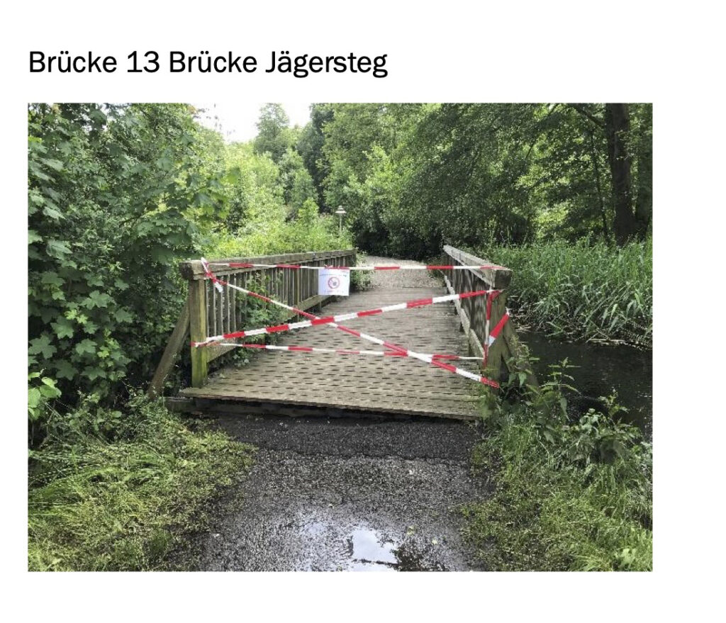 Vor knapp zwei Monaten hatte der Gemeinderat die Priorisierung beschlossen und wurde nun von der Realität überrollt. So sollen die Brücken Nr. 3 und Nr. 13 zusätzlich zu den ohnehin für dieses Jahr zur Sanierung anstehenden Brücken Nr. 4 und Nr. 7 erneuert werden. Die Radfahrerbrücke Nr. 17 kann noch gesperrt bleiben, da der Radverkehr über die neue Brücke beim Kurhaus geleitet werden kann. Der Weg von Brücke 13 über die Brücke 12 in Richtung Nordwesten kann ebenfalls umgeleitet werden.