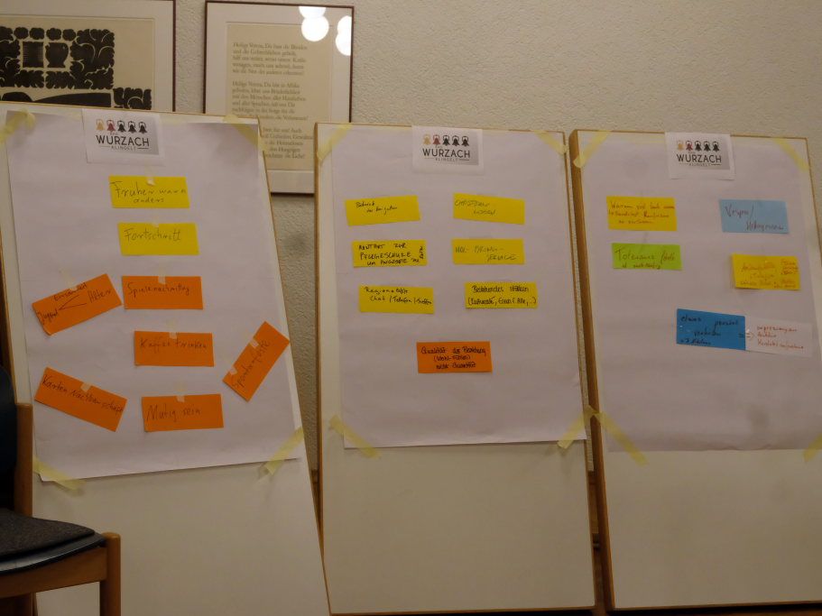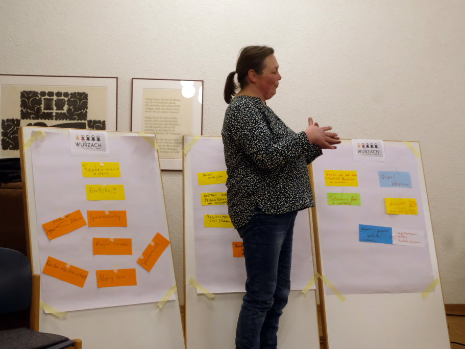 Die Gruppe der Frauen aus Haidgau, die schon viele Erfahrungen, vor allem in der Seniorenarbeit vorzuweisen hatte, setzte auf niederschwellige Angebote auch von Vereinen. Das Schwätzbänkle ist in ihren Augen ein schon erprobtes Mittel, um mit Menschen ins Gespräch zu kommen. Aber auch aktiv-Angebote wie Frauen- und Männertreff, gemeinsames Kochen und Backen, stellte Maria Schemmel im Namen der Gruppe die Ideen vor. Gemeinsames Backen, das hatten Gisela Brodd und Andrea Binzer als Elternvertreterin an der Werkrealschule festgestellt, habe allen Beteiligten sehr großen Spaß gemacht und den Gemeinsinn geschärft. Ein gemeinsames Vesper oder Mittagessen sei dafür ebenso geeignet. Und oft liegen die Ursachen, warum man nicht mehr miteinander spricht in uralten Streitereien, die meist wegen Kleinigkeiten entstanden waren. Die Förderung von Toleranz sei in der heutigen Zeit ebenfalls eine wichtige Aufgabe.