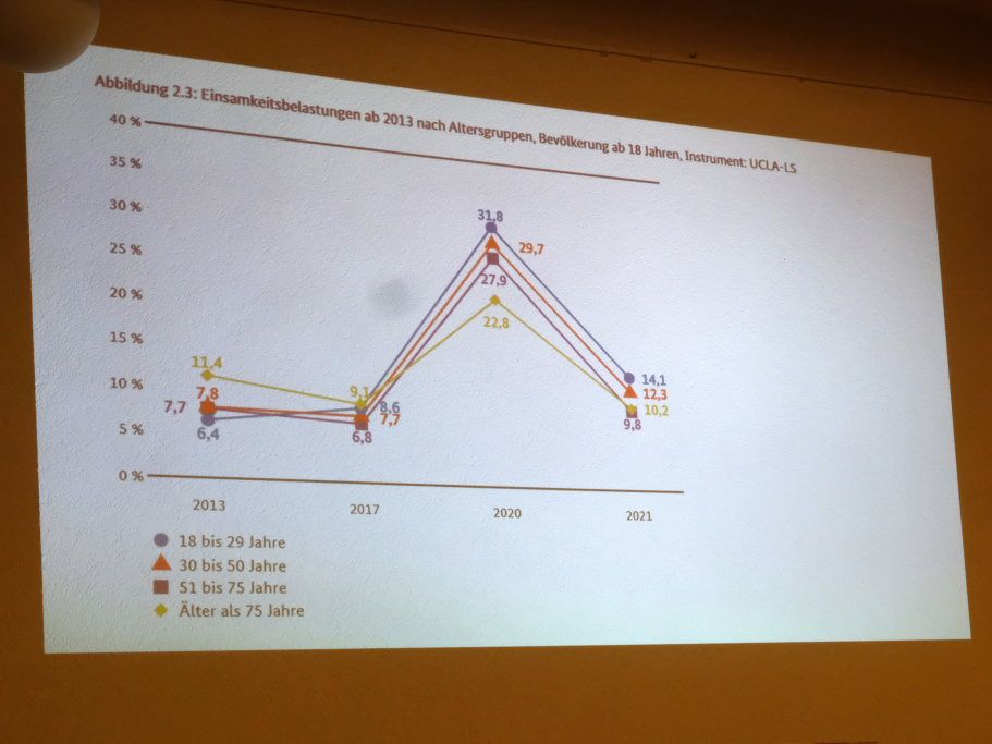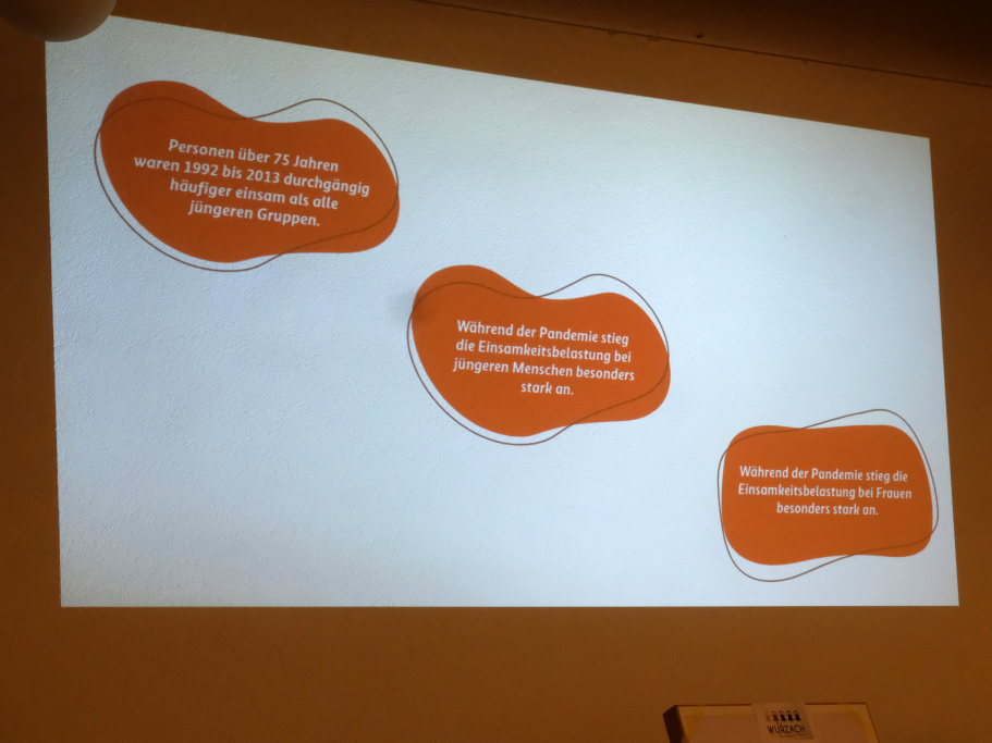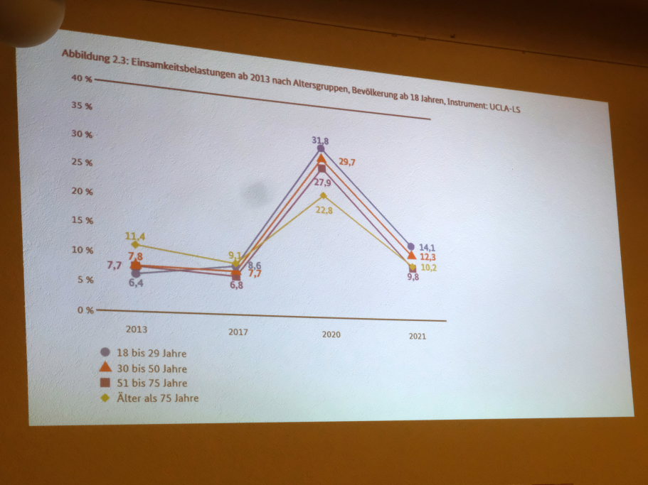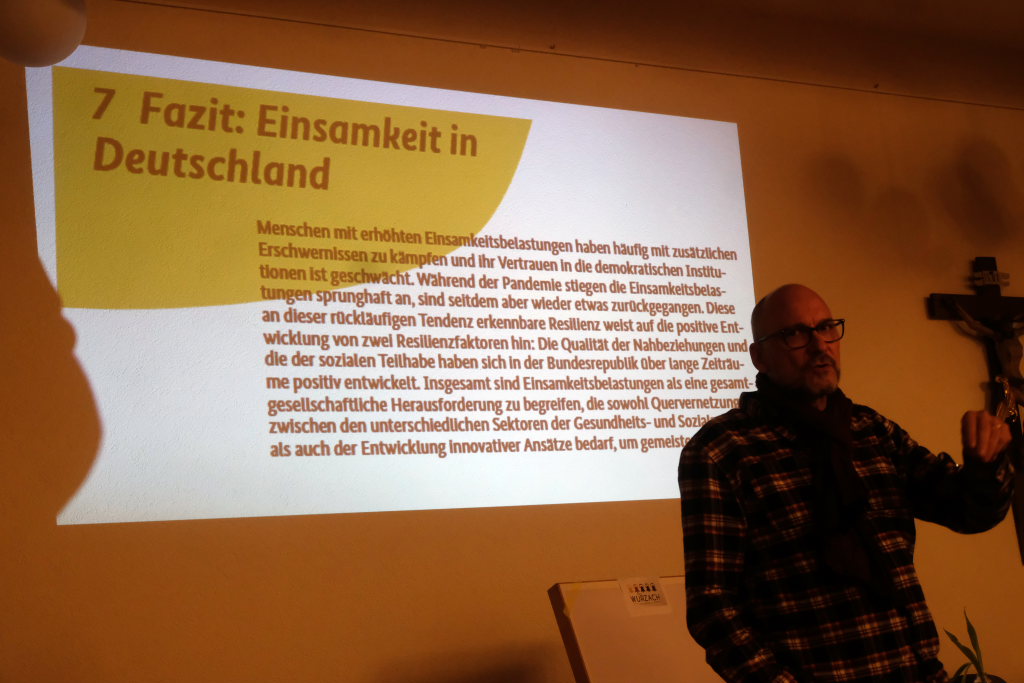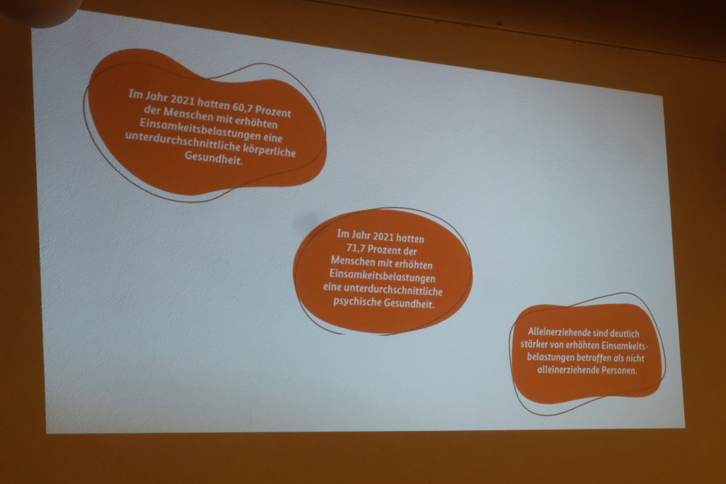 Rund acht Millionen Menschen seien in Deutschland von Einsamkeit betroffen, mit den entsprechenden Folgen: Ein Anstieg von psychischen und körperlichen Krankheiten, deren Anzahl sich nach Corona weiter erhöht hat. Risikofaktoren seine das Fehlen engerer Beziehungen, aber auch Arbeitslosigkeit und das alleine erziehen von Kindern. Auch die Art des Umgangs – unter anderem durch das Fehlen von persönlichen Kontakten – habe sich gewandelt. Wichtig sei, um die psychische Belastung z.B. bei Krisen zu mildern, eine Entstigmatisierung der Gesellschaft.