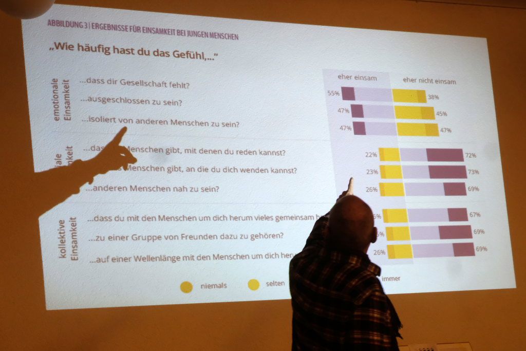 Matthias Winstel führte nach der Begrüßung mit einigen Videoeinspielern in das Thema ein. Gerade junge Menschen, trotz guter Vernetzung mit den sozialen Medien hatten sehr unter der damals erzwungenen Einsamkeit während Corona gelitten. Wie man sie da wieder herausholen kann, zeigte das Beispiel des ersten gezeigten Videos über die Aktion „Let´s connect“. „Jugendliche sind zwar gut vernetzt, kommen aber im richtigen Leben häufig nicht mit sich selber klar,“ zitiert Winstel aus der Studie. Folgen der Einsamkeit sind – nicht nur, aber vor allem – bei Jugendlichen ein geringeres Vertrauen in politische Institutionen und damit auch grundsätzlich weniger Vertrauen in unsere Gesellschaft.