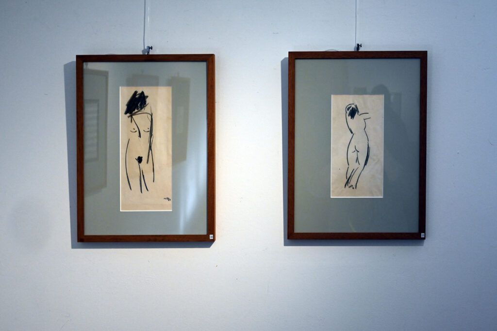Zwei Bilder in der Ausstellung fallen aus der Thematik. Ein weiblicher Akt in zwei Perspektiven. Mit wenigen schwarzen Strichen ist es Peter Paul Neff gelungen, den Körper einzufangen.