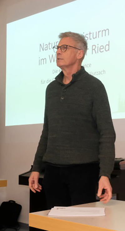 Gemeinderat Rainer Deuschel (Bild) von den Grünen eröffnete die Reihe der Vorträge. Er sei damals skeptisch in die Bürgerversammlung gegangen, gab er zu. Aber als der Architekt das Projekt dort sehr genau bis ins Detail beschrieben habe, sei er überzeugt worden, „dass es ein gutes Projekt ist.“ Der Turm sei ein Projekt des Naturschutzes, der die 1200 Hektar Hochmoorflächen und seine attraktiven Biotope pflegt. Er betonte auch, dass es sich beim Turm um ein Umweltbildungsprojekt des Naturschutzzentrums handelt.
