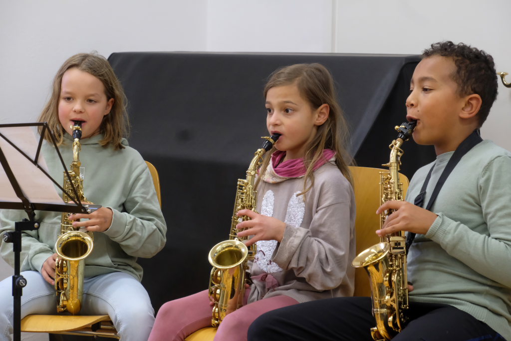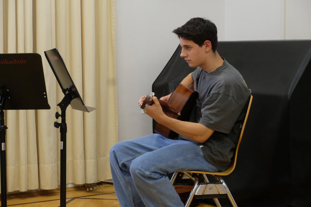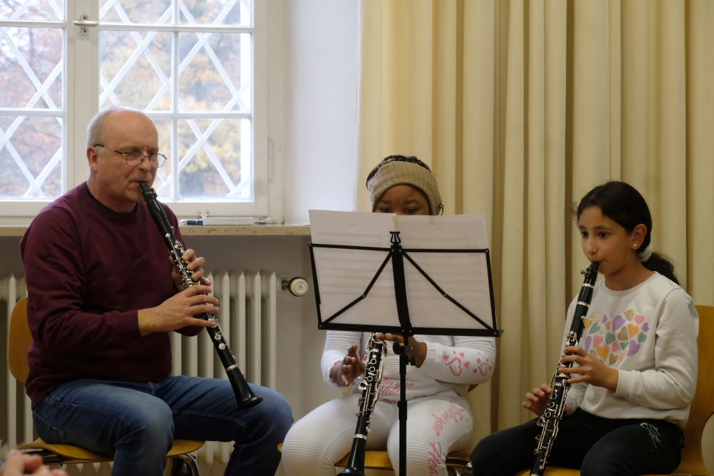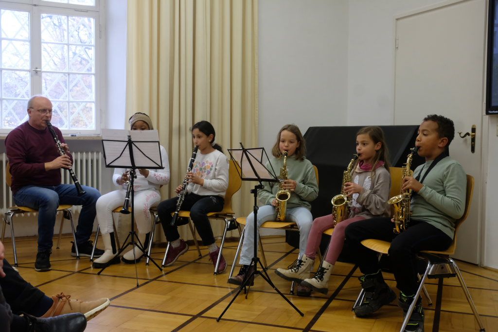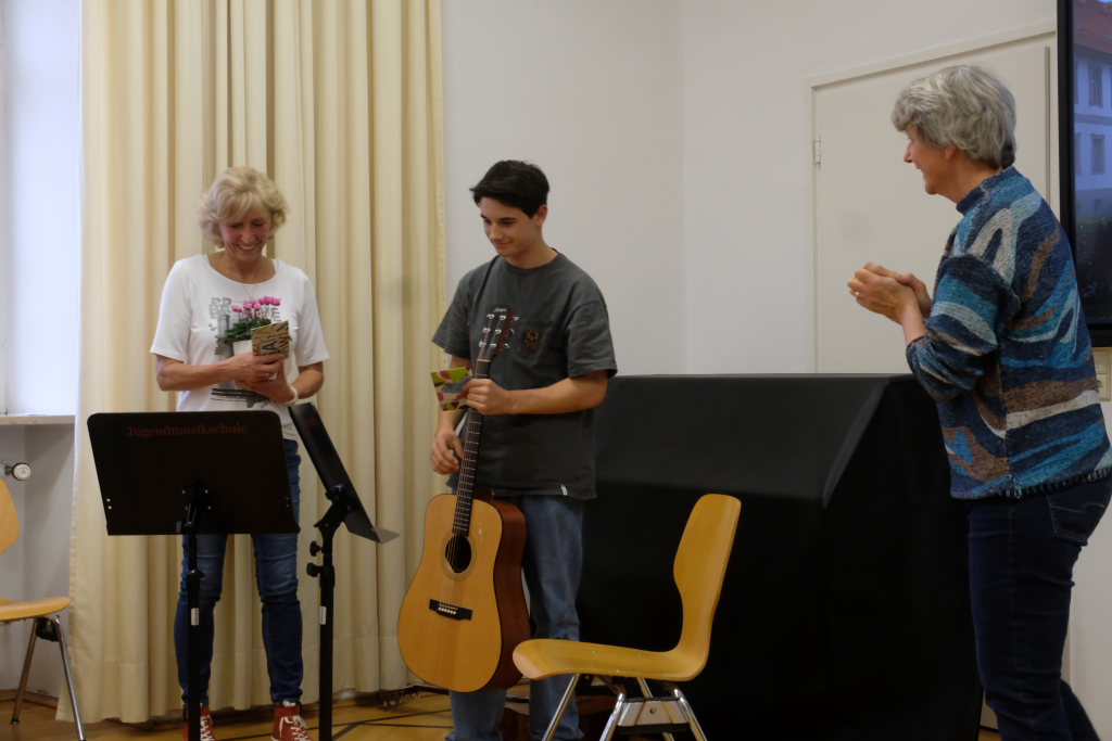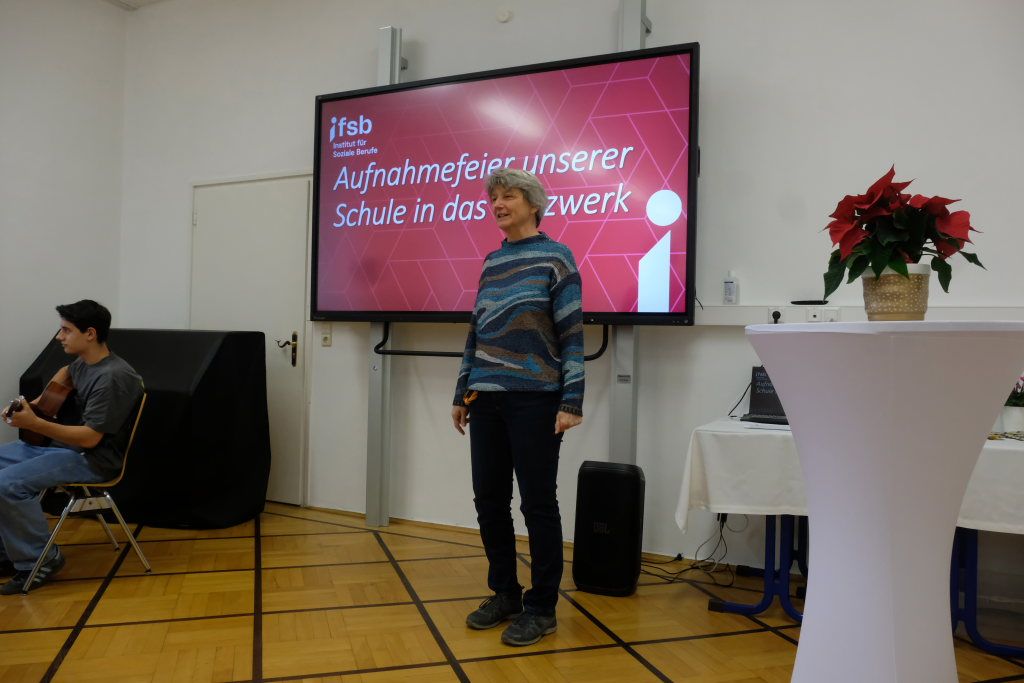 Die Moderatorin Claudia Steinhauser erläuterte als Vertreterin der seit dem letzten Herbst gegründeten Arbeitsgruppe die einzelnen Arbeitsschritte bis zur Aufnahme ins Netzwerk. An drei Abstimmungsterminen hätten sich 123 Schülerinnen und Schüler (und praktisch alle) des IfSB dafür entschieden, den vorgeschlagenen Weg zu gehen. Im Januar habe die Suche nach Paten einen ersten Erfolg gezeitigt. Und noch im Sommer habe sich eine weitere Patenschaft ergeben. Um die Spannung noch ein wenig zu erhöhen, um wen es sich dabei handelt, durfte ein weiteres Ensemble der Jugendmusikschule sein musikalisches Können präsentieren.