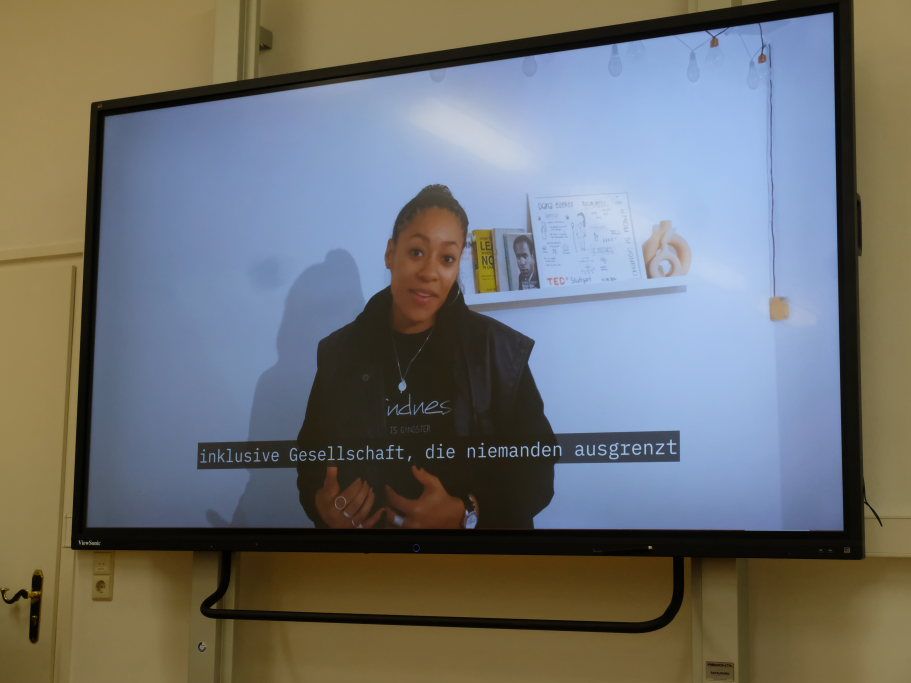 Sabine Schorpp, sprach für den Bereich Heilerziehungspflege. Der Titel sei ja ein Auftrag, den sich die Schule selbst gegeben hatte. Aber jeder müsse sich in Erinnerung rufen, was er selbst beitragen könne. Sie erinnerte daran, dass es eine Schule ohne Rassismus und Diskrimierung wahrscheinlich nicht geben werde oder könne. Beispiel Grundschulempfehlung: Bei gleichen Noten werde ein weißes Kind als Empfehlung das Gymnasium bekommen, während ein schwarzes die Hauptschulempfehlung erhalte. Ein weiteres Beispiel seien die Lehrbücher, wo eher selten dunkelhäutige Menschen auftauchten. Oder ein Beispiel aus dem Bereich Medizin: Ein fleischfarbenes Pflaster falle auf der Haut eines Weißen nicht groß auf, im Gegensatz zu der eines Schwarzen. Der erste Schritt, den daher jeder gehen solle, sei „Hinschauen und Zuhören“. Diskrimierung und die Machtstrukturen erkennen und sich füreinander einsetzen.