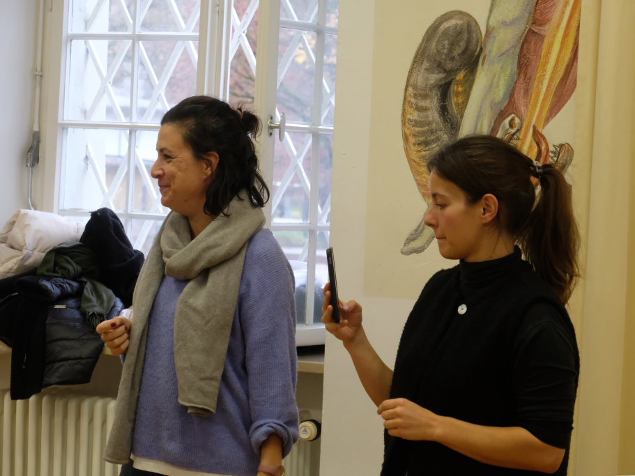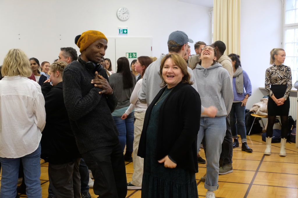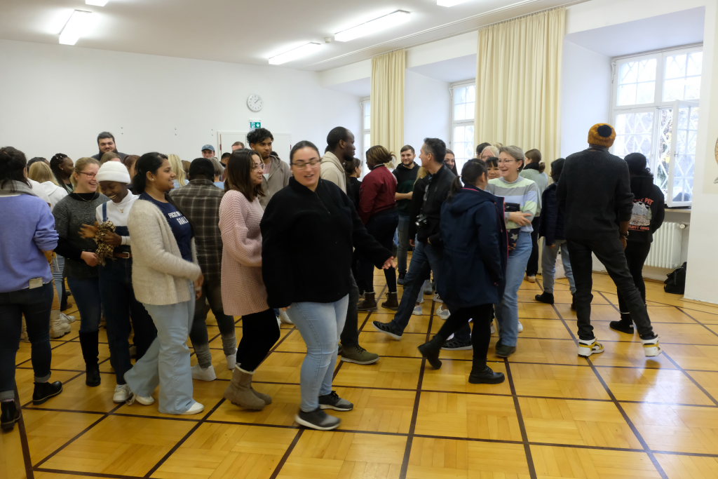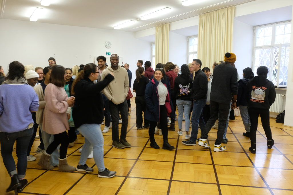 Bevor es zum gemütlichen Teil des Festes überging, gab es noch mit Talking Wheel eine spielerische Aufarbeitung des Themas: Während die Musik spielte, liefen alle kreuz und quer durch den Raum, bei deren Aussetzen sollte alle sich mit dem am nächsten Stehenden über Fragen wie „Welche Formen von Diskrimierung kenne ich? Was ist Rassismus für mich?“ austauschen. Diese Erfahrungen sollten sie dann im Anschluss im Flur vor der Aula zu Papier bringen und sich mit dem Schild per Sofortbildkamera ablichten lassen.