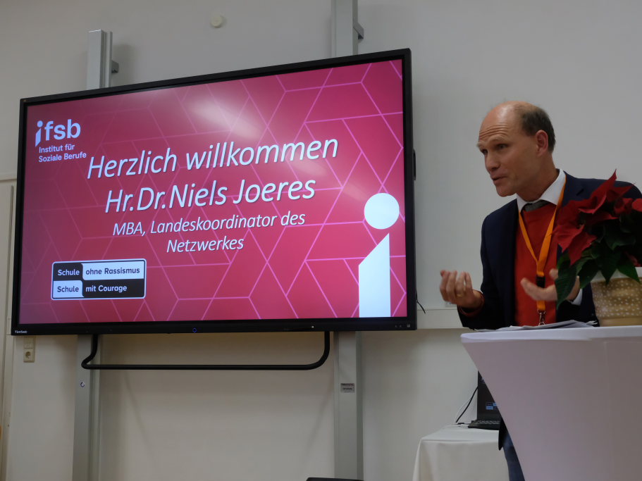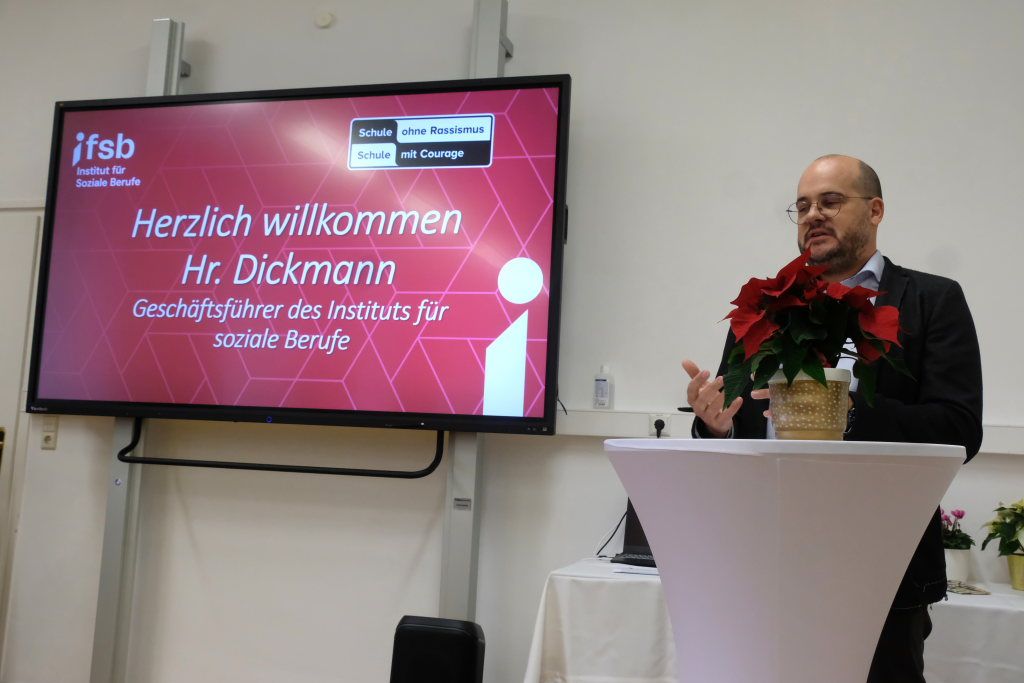 Dr. Niels Joeres, Landeskoordinator des Netzwerkes, der die Urkunde und die Tafel an die Projektverantwortlichen überreichte, zitierte in seinem Grußwort aus der Menschenrechts-Charta der europäischen Union. „Diskriminierung in jeder Form ist verboten.“ Deutschlandweit sind 4500 Schulen inzwischen Mitglied des Netzwerkes, allein 400 in Baden-Württemberg, wo das Netzwerk im kommenden Jahr bereits 30 Jahre aktiv sein wird. Das Courage Netzwerk wurde damals von Politkern wie Heiner Geißler, Cem Özdemir oder Norbert Blüm über Parteigrenzen hinweg gegründet. Finanziert wird es von „Demokratie leben“ sowie auch der Bundeszentrale für Politische Bildung. Er freute sich, dass nun auch die erfolgreiche Marke IfSB, als solche sei die Schule Baden-Württemberg weit bekannt, zum Netzwerk „Schule ohne Rassismus – Schule mit Courage“ dazu stoße. Joeres sieht hier im Raum Oberschwaben einen extremen Nachholbedarf, weil nur sehr wenige der aktuell 418 Courage-Schulen aus der Gegend sind. „Lasst uns gemeinsam dieses Netzwerk mit Leben füllen,“ rief er den Teilnehmern an der Feier zu.