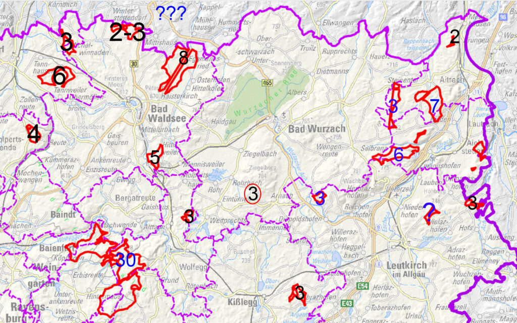 Umstelltes Ried: In die Karte des Regionalverbandes Bodensee-Oberschwaben mit den rot markierten Vorrangflächen für Windkraft hat Reinhold Mall die Zahl der erwarteten WKA hineingeschrieben. Man sieht eine Einkreisung des Wurzacher Riedes, wobei noch nicht erkennbar ist, was nördlich der Kreisgrenze geplant ist – zum Beispiel bei Mühlhausen (mit blauen Fragezeichen markiert).