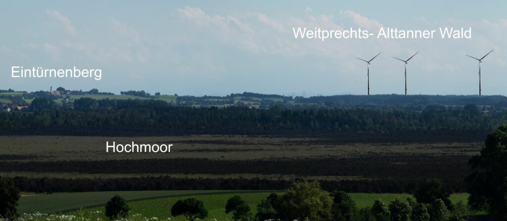 Blick aufs Hochmoor des Wurzacher Riedes von Knetzenweiler aus. Links sieht man Eintürnenberg, rechts die bei Weitprechts geplanten Windkraftanlagen. Visualisierung: Reinhold Mall