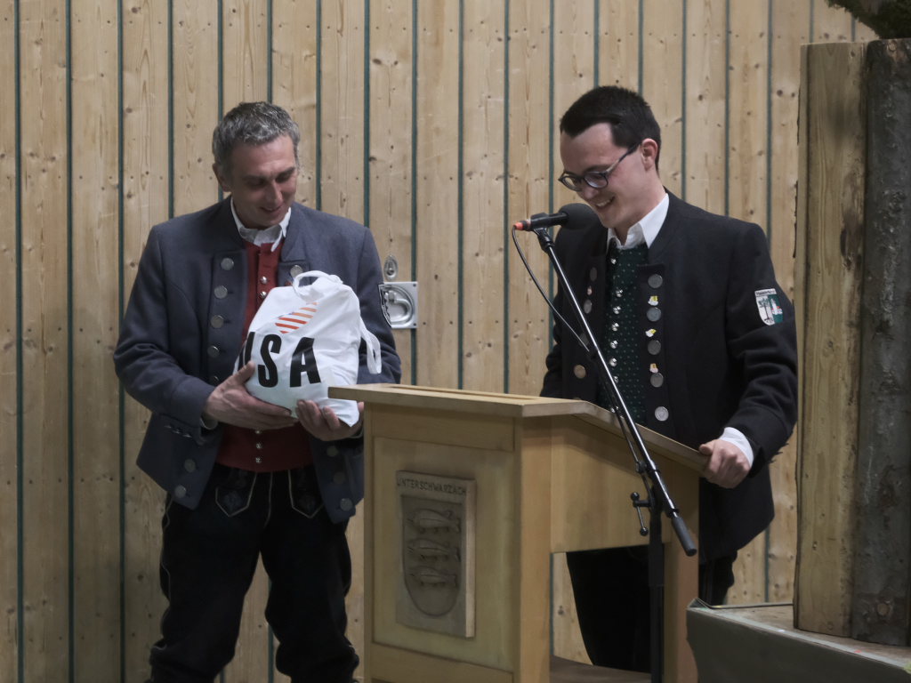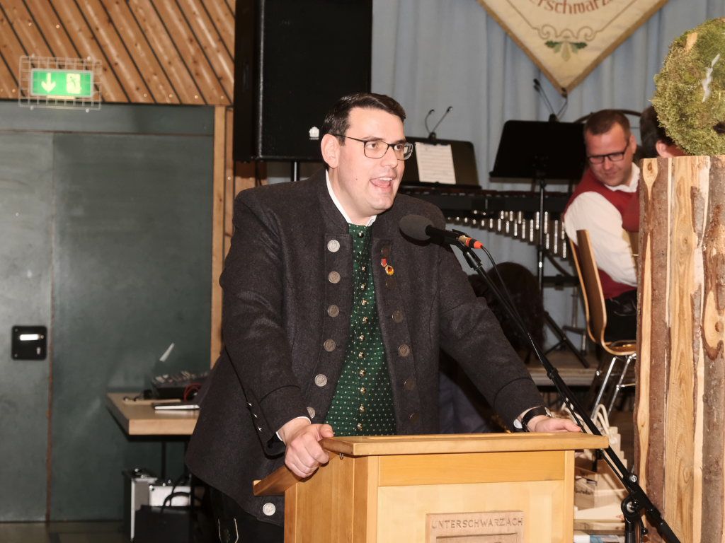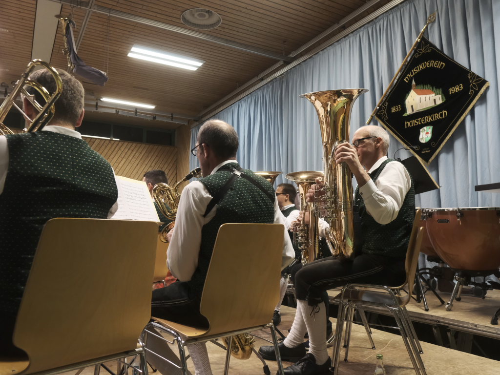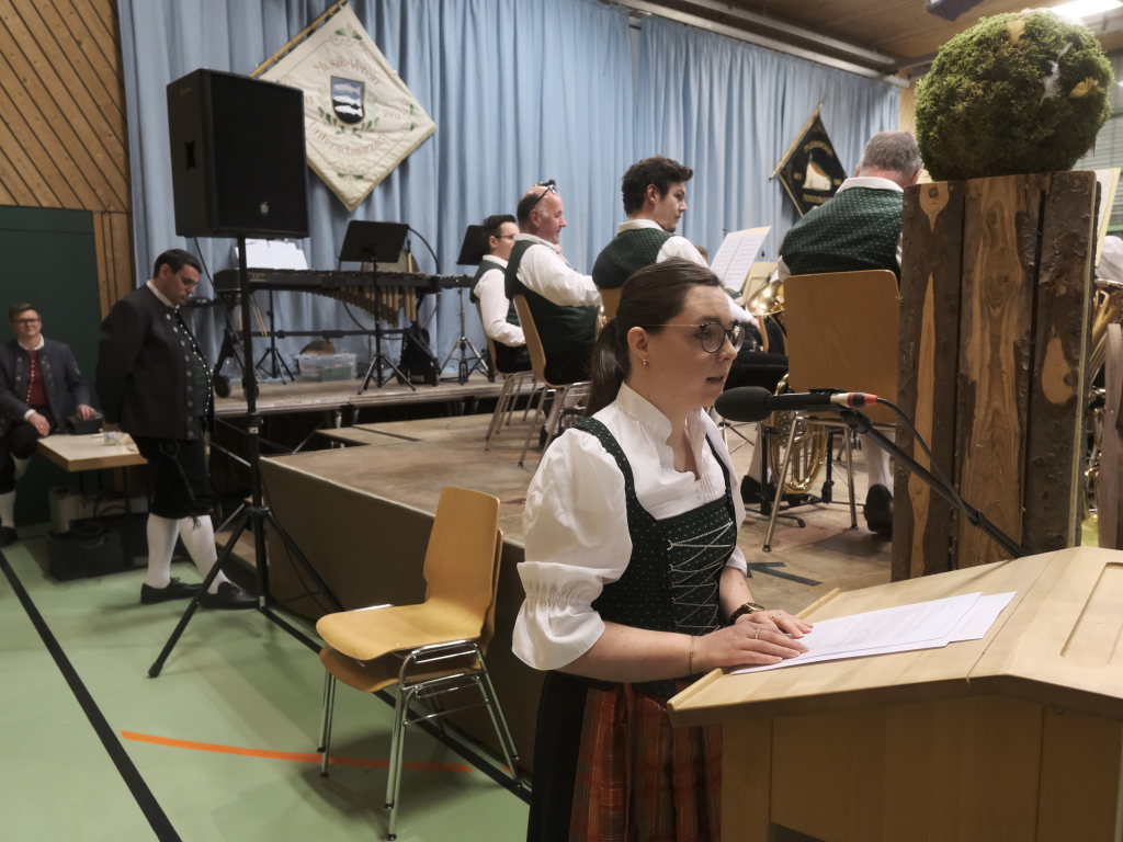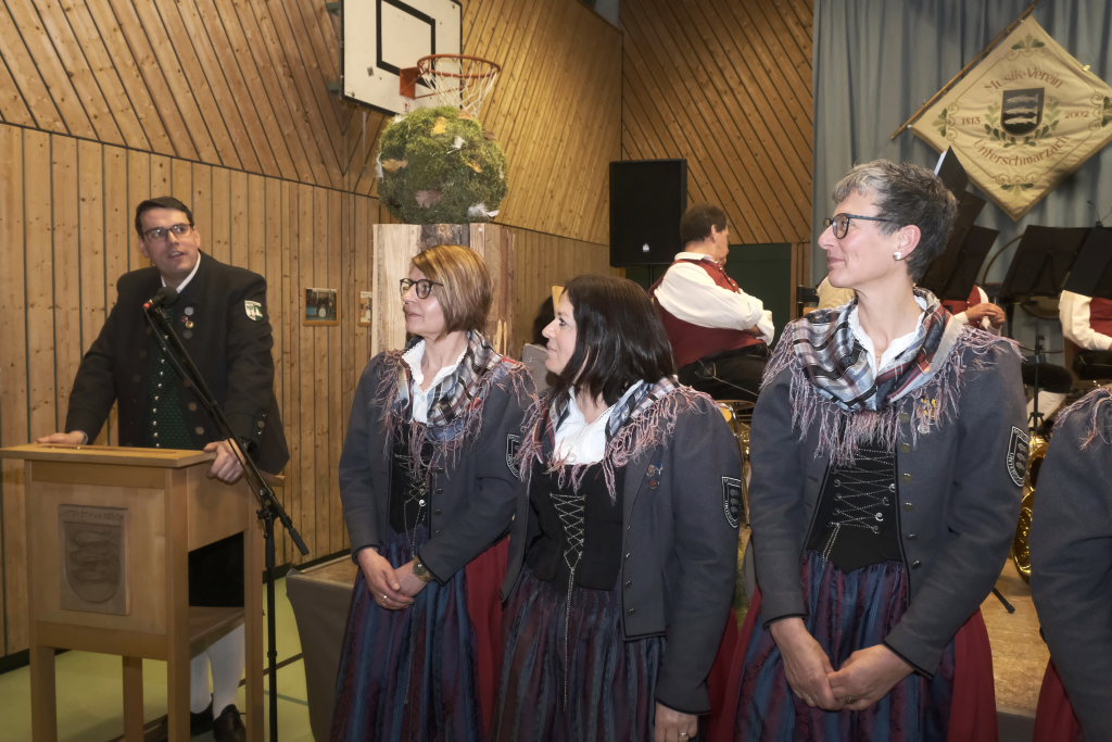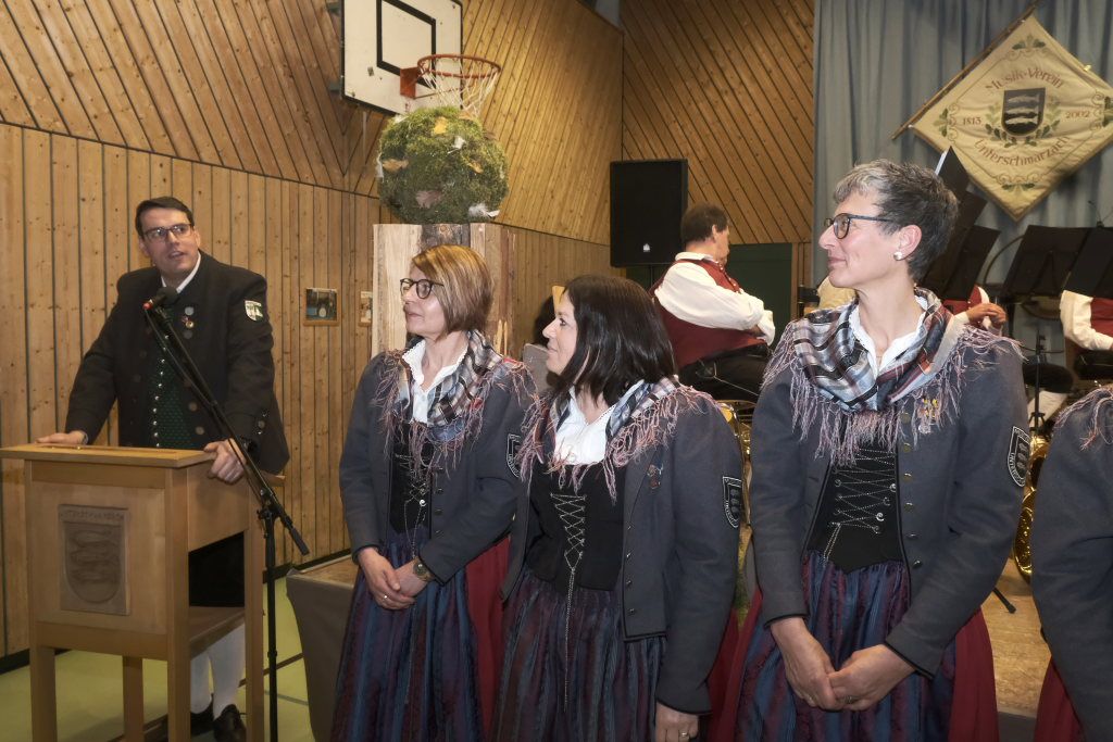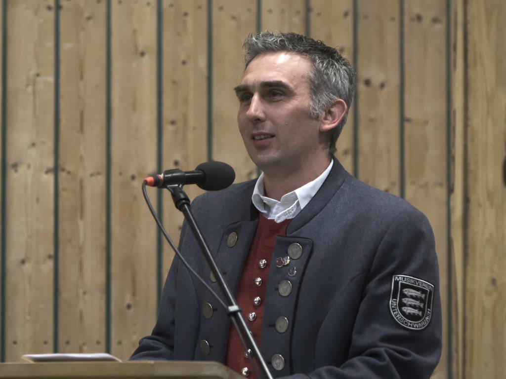 Nach seinem Dirigat mit dem MV Haisterkirch war für Klaus Wachter der Arbeitstag noch nicht zu Ende: Als stellvertretender Kreisverbandsvorsitzender des Blasmusikverbandes Ravensburg hatte er noch die Ehre (und das Publikum das Vergnügen), langjährige Musiker der Unterschwarzacher für 290 Jahre Musizieren mit Ehrenzeichen und Urkunden auszuzeichnen: