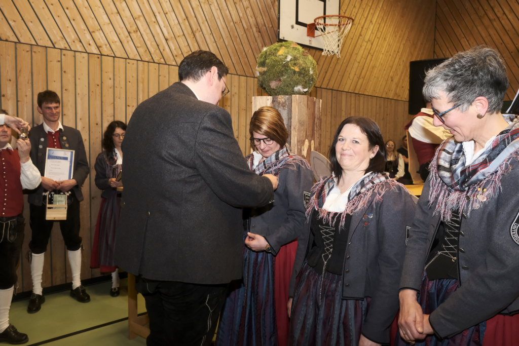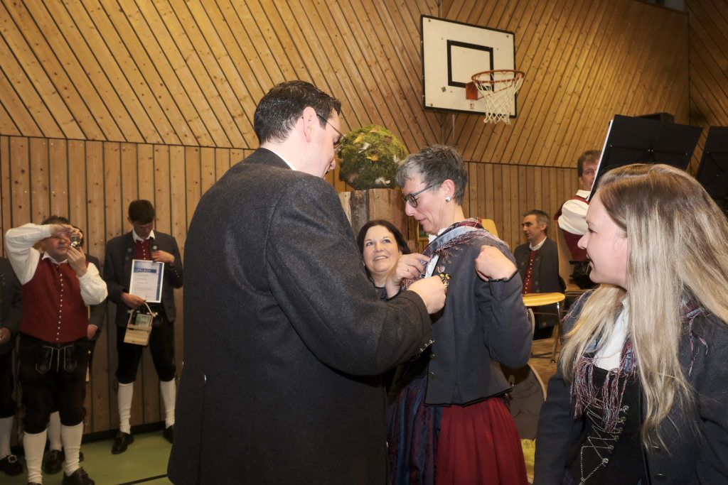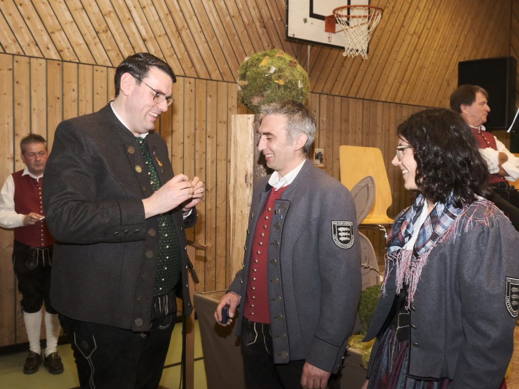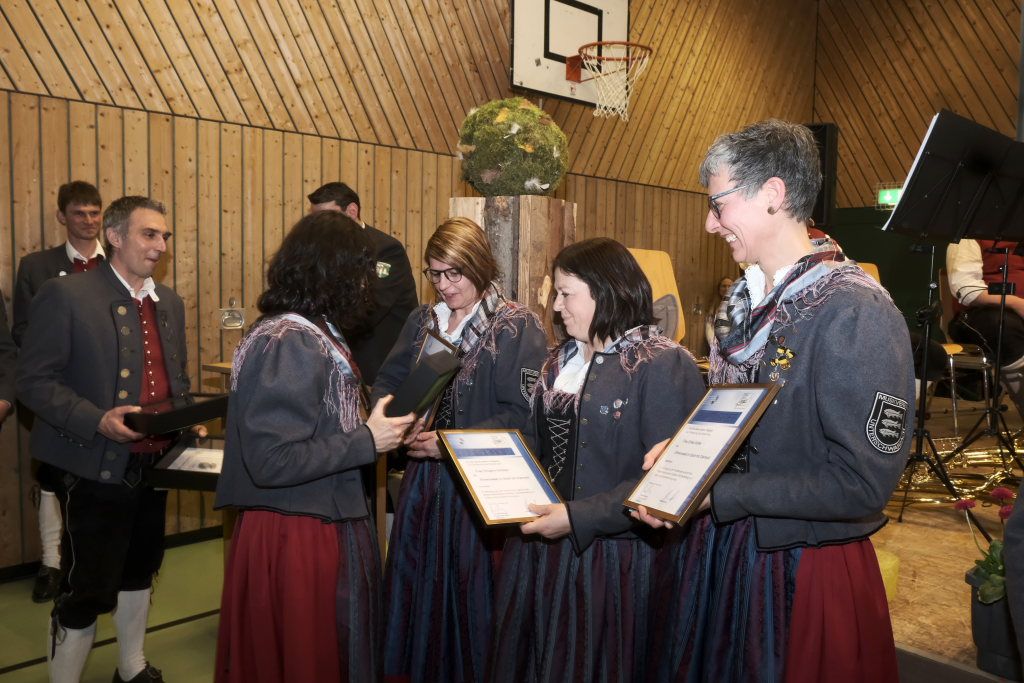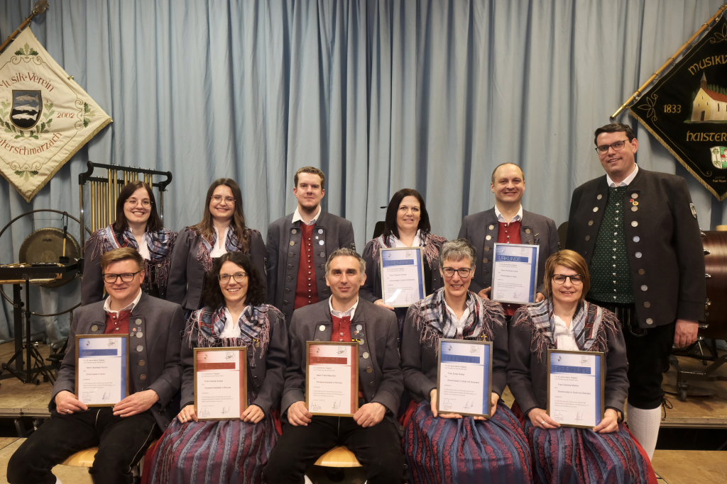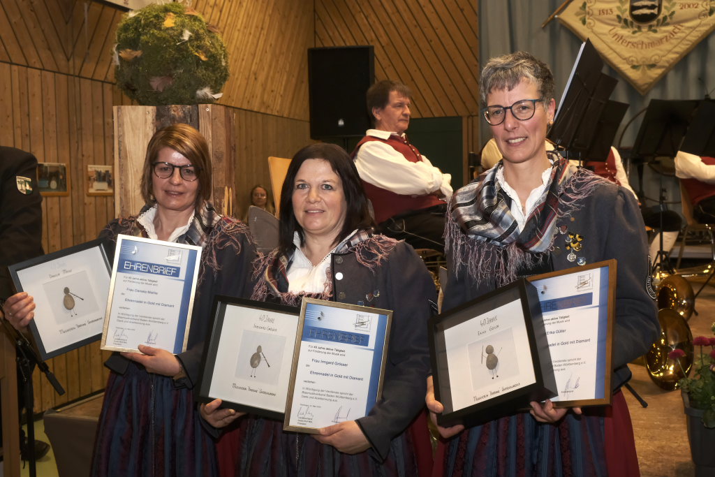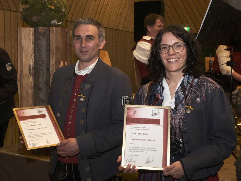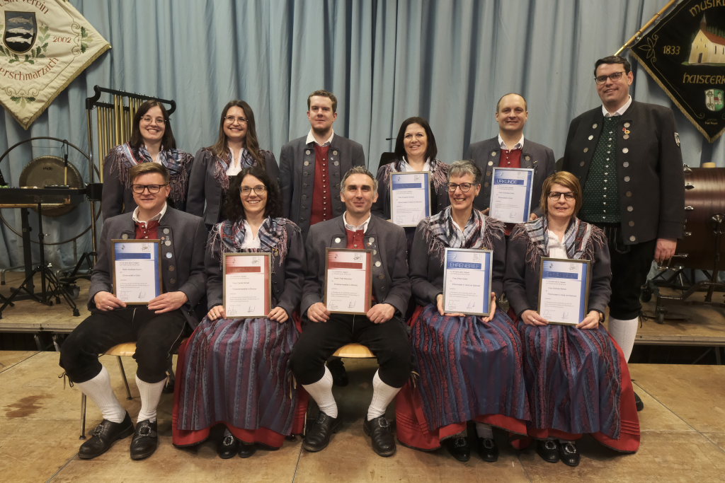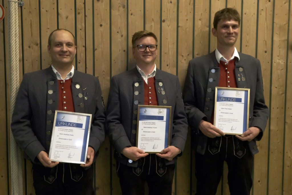 Für 10 Jahre aktives Musizieren wurden Sophia Straßer und Lisa Birk mit der Ehrennadel in Bronze ausgezeichnet. Für 20 Jahre erhielten Stefanie Schneider und Tobias Ness die Ehrennadel in Silber. Für 30 Jahre erhielten Andreas Humm, Andreas Herle, Paul Kibler die Ehrennadel in Gold samt Urkunde. Für 40 Jahre Aktivität im Musikverein erhielten Erika Gütler, Daniela Miehle, Irmgard Grösser die Ehrennadel in Gold mit Diamant samt Ehrenbrief aus den Händen von Klaus Wachter überreicht. Verbunden mit der Einladung beim Kreisseniorenorchester mit zu spielen. Die Förderermedaille in Bronze mit Urkunde für 10-jährige Tätigkeit im Vorstandsteam erhielten Carola Schad und Felix Maucher, die beide gemeinsam als Vorstandsteam im Jahre 2014 die Geschicke des Vereins in ihre Hände genommen hatten.
