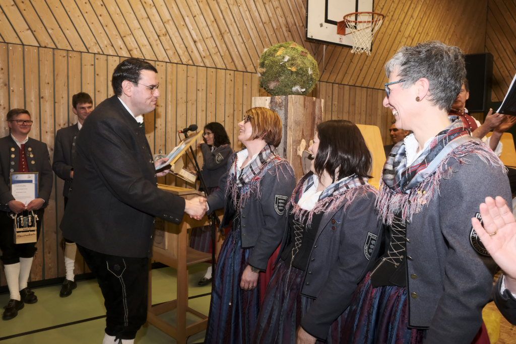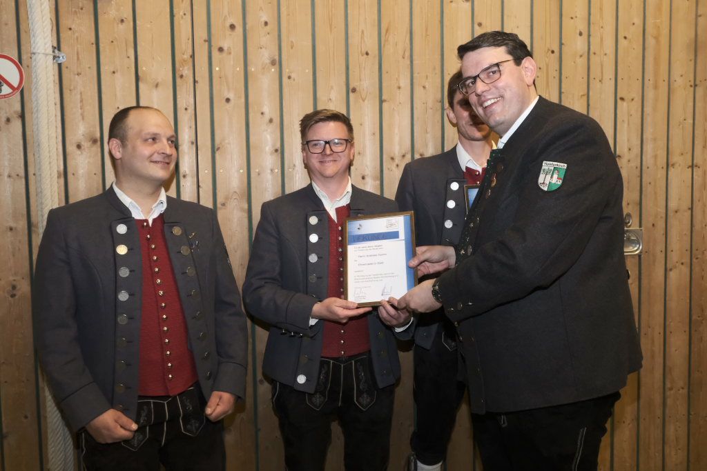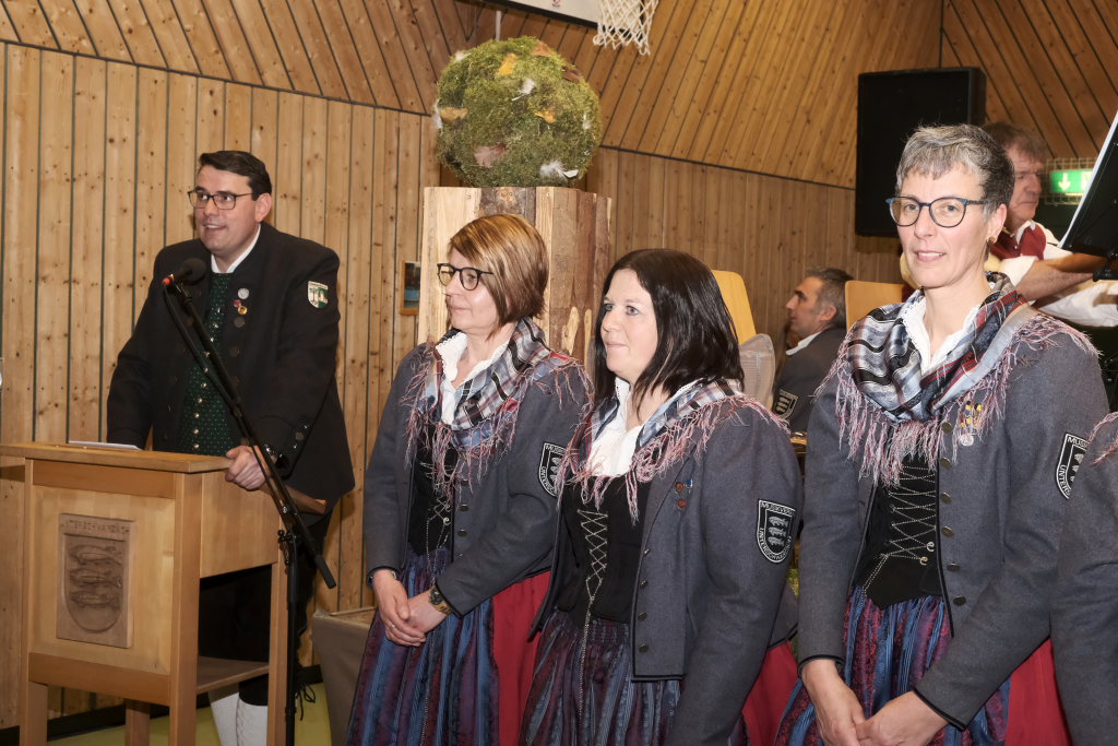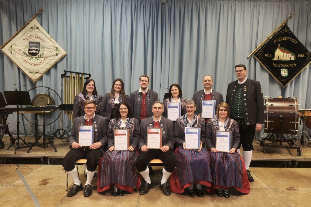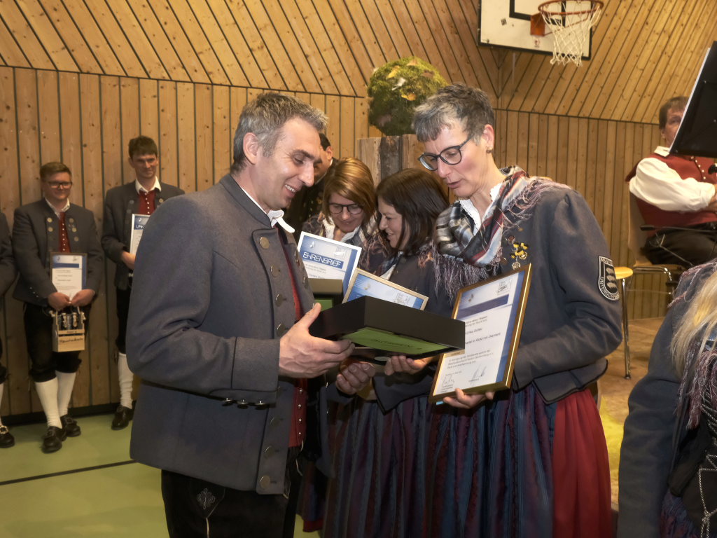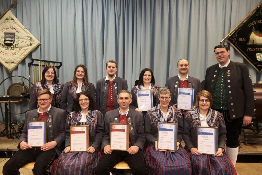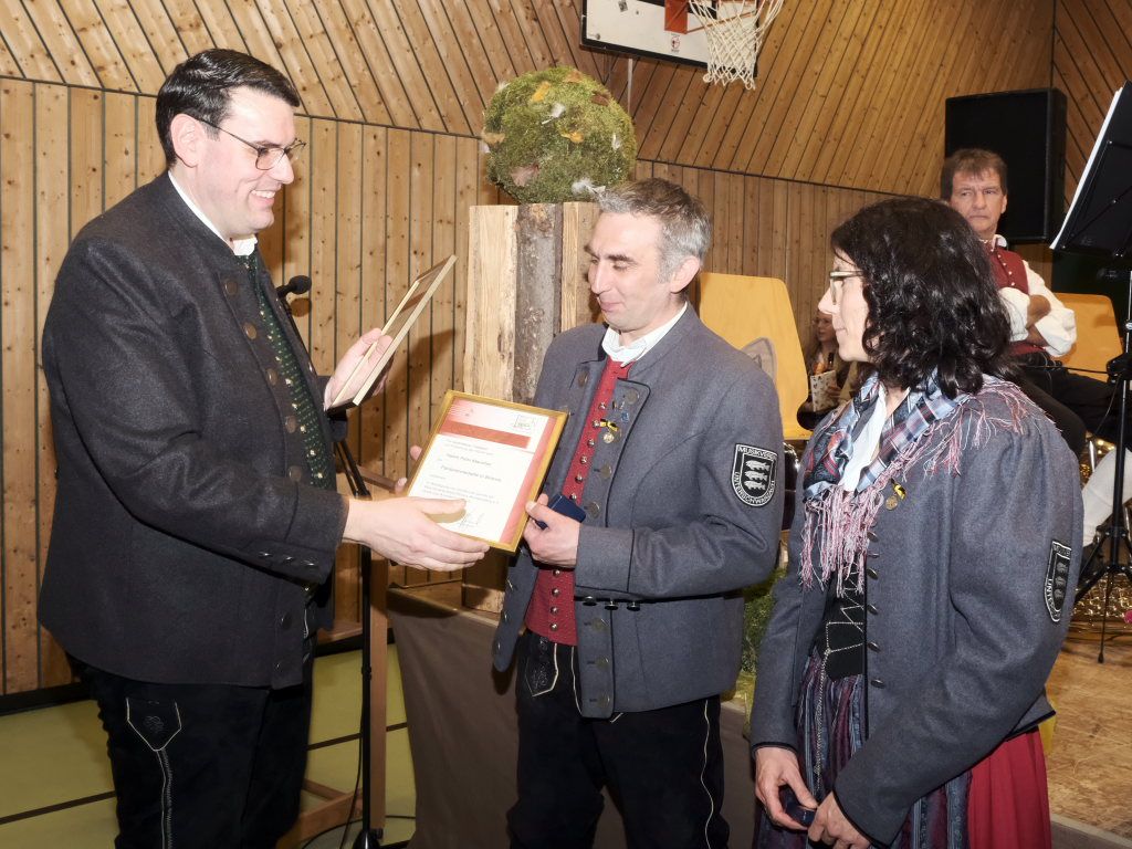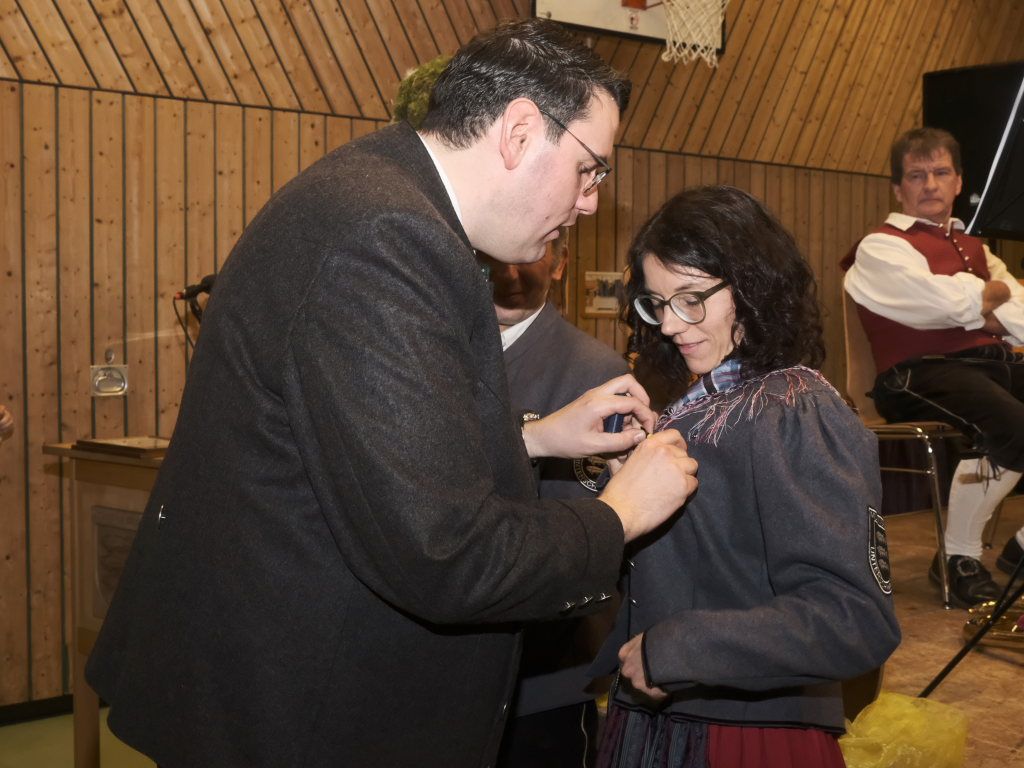 Für 10 Jahre aktives Musizieren wurden Sophia Straßer und Lisa Birk mit der Ehrennadel in Bronze ausgezeichnet. Für 20 Jahre erhielten Stefanie Schneider und Tobias Ness die Ehrennadel in Silber. Für 30 Jahre erhielten Andreas Humm, Andreas Herle, Paul Kibler die Ehrennadel in Gold samt Urkunde. Für 40 Jahre Aktivität im Musikverein erhielten Erika Gütler, Daniela Miehle, Irmgard Grösser die Ehrennadel in Gold mit Diamant samt Ehrenbrief aus den Händen von Klaus Wachter überreicht. Verbunden mit der Einladung beim Kreisseniorenorchester mit zu spielen. Die Förderermedaille in Bronze mit Urkunde für 10-jährige Tätigkeit im Vorstandsteam erhielten Carola Schad und Felix Maucher, die beide gemeinsam als Vorstandsteam im Jahre 2014 die Geschicke des Vereins in ihre Hände genommen hatten.