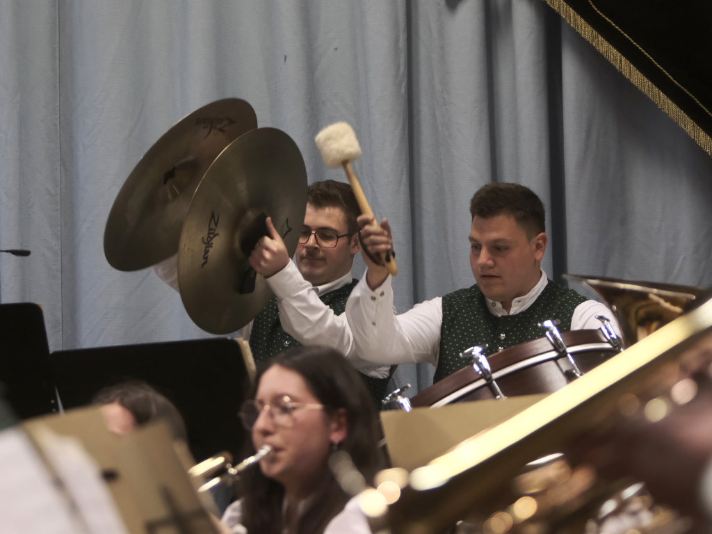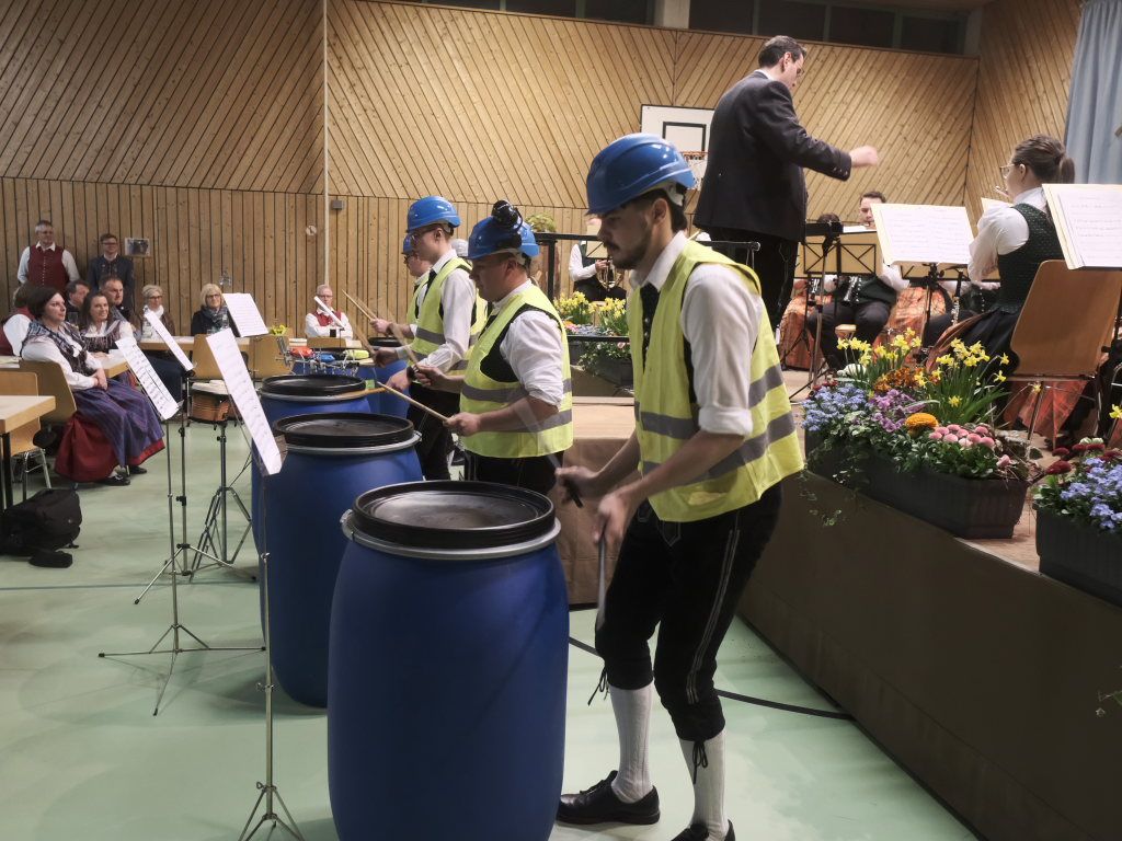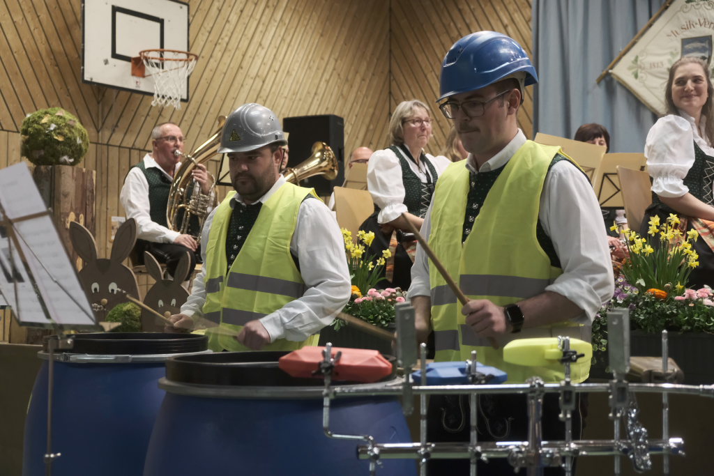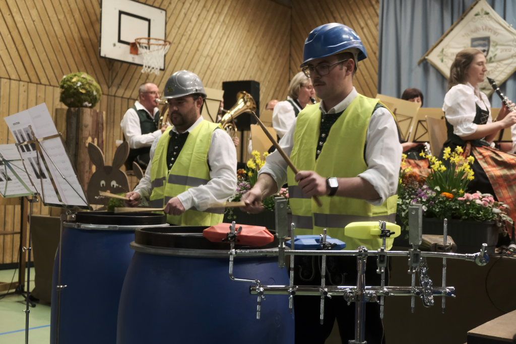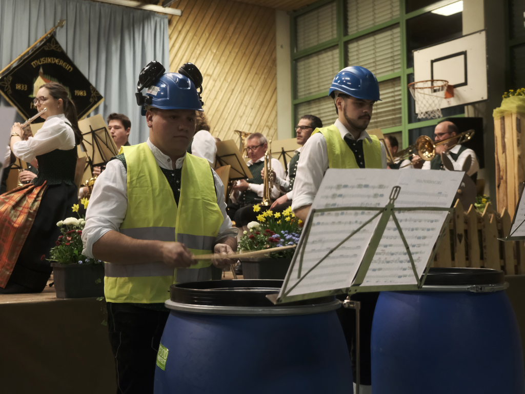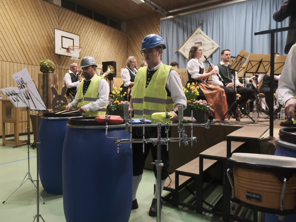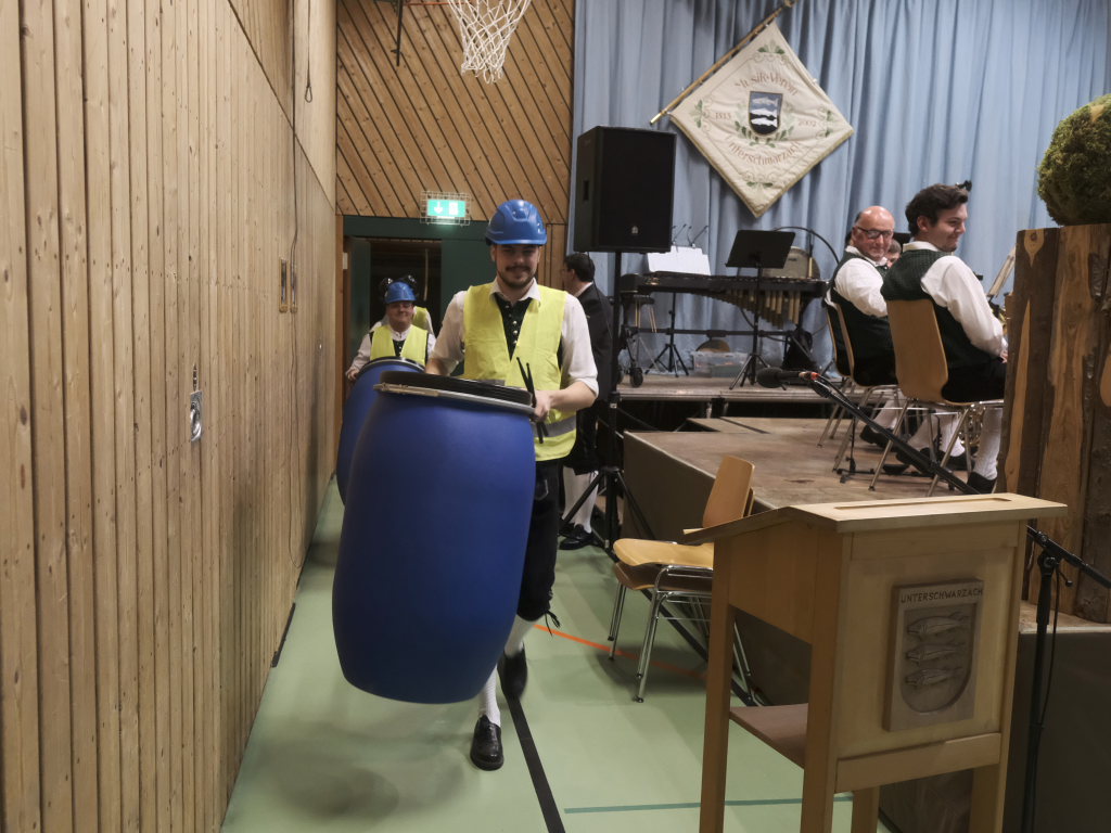 Zum Abschluss des offiziellen Konzertteils hat sich das Schlagzeugregister kräftig in den Vordergrund gestellt: Beim Drummer Splash von Fritz Neuböck konnte das Publikum fünf Drummer, die ansonsten zwar gut hörbar aber selten gut sichtbar sind, vor der Bühne hautnah beim „Bearbeiten“ von blauen Regentonnen und weiteren Percussion-Instrumenten beobachten. Natürlich durften die Schlagzeuger eine spontane Zugabe spielen, wie auch das gesamte Orchester mit dem „Traktorenmarsch“ von Franz Springer aus Schwendi, den dieser 1950 für die Musiker in Uttenweiler komponiert hatte.