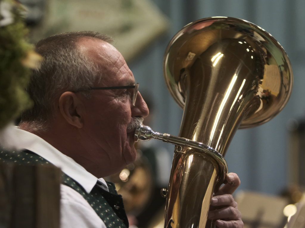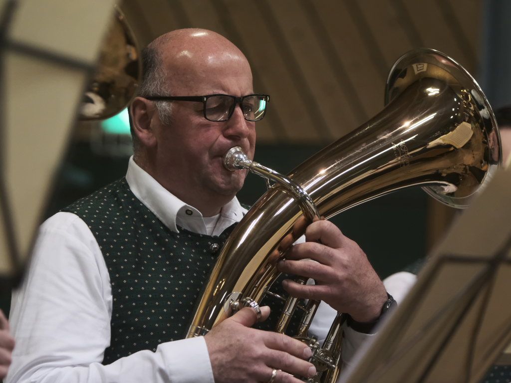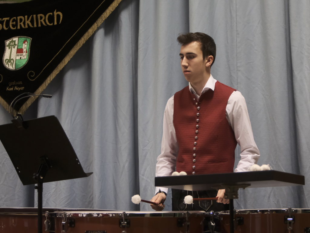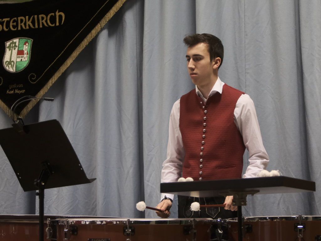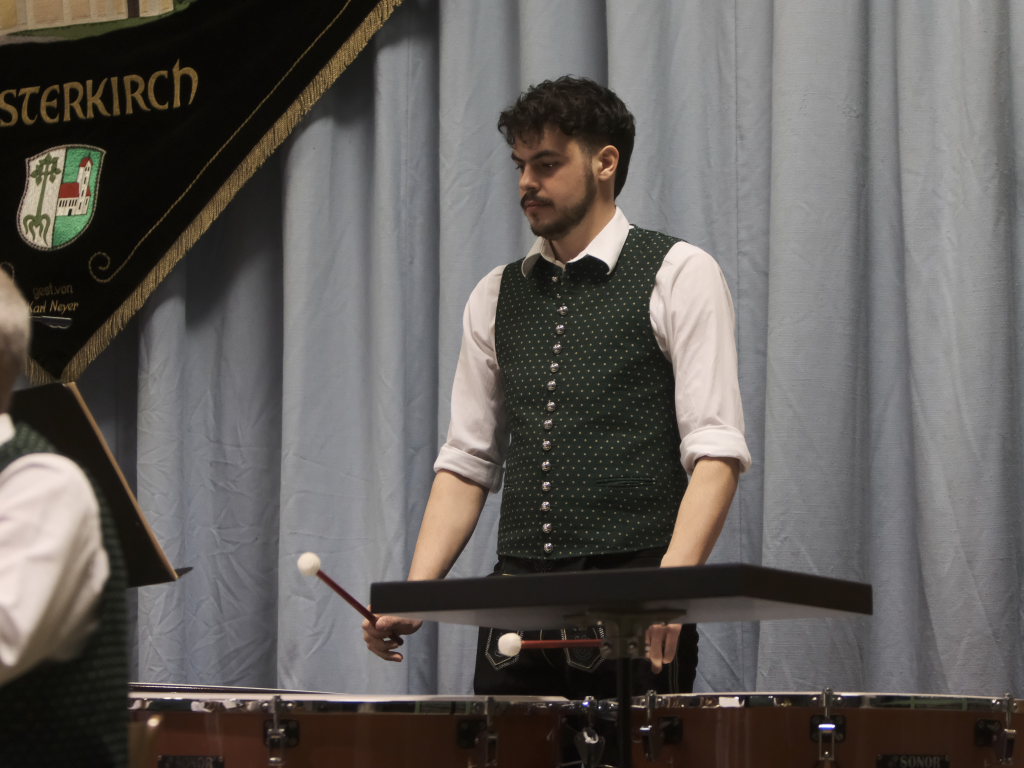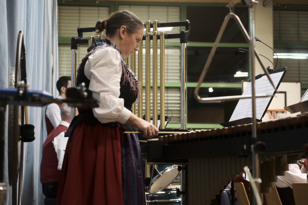 Zum Abschluss des offiziellen Konzertteils hat sich das Schlagzeugregister kräftig in den Vordergrund gestellt: Beim Drummer Splash von Fritz Neuböck konnte das Publikum fünf Drummer, die ansonsten zwar gut hörbar aber selten gut sichtbar sind, vor der Bühne hautnah beim „Bearbeiten“ von blauen Regentonnen und weiteren Percussion-Instrumenten beobachten. Natürlich durften die Schlagzeuger eine spontane Zugabe spielen, wie auch das gesamte Orchester mit dem „Traktorenmarsch“ von Franz Springer aus Schwendi, den dieser 1950 für die Musiker in Uttenweiler komponiert hatte.