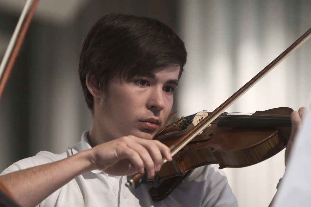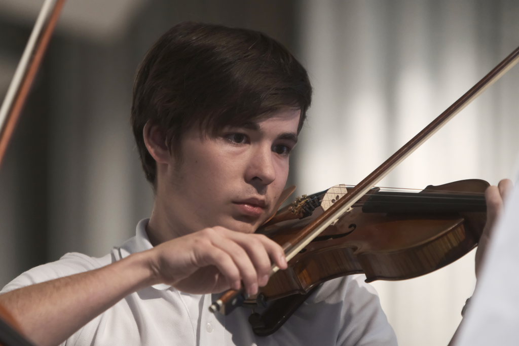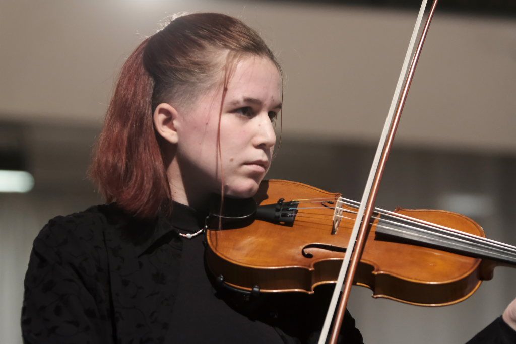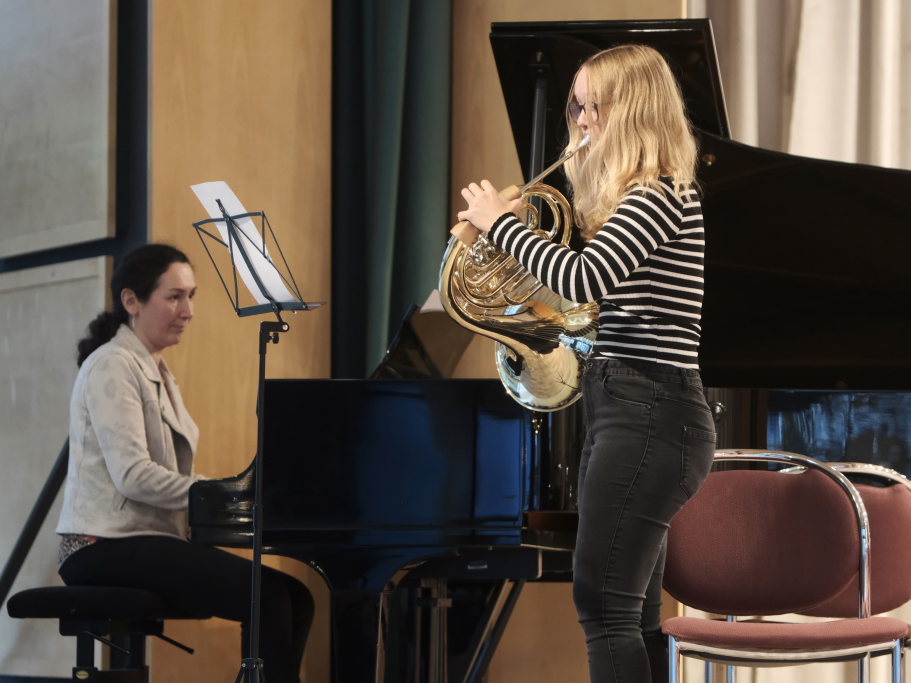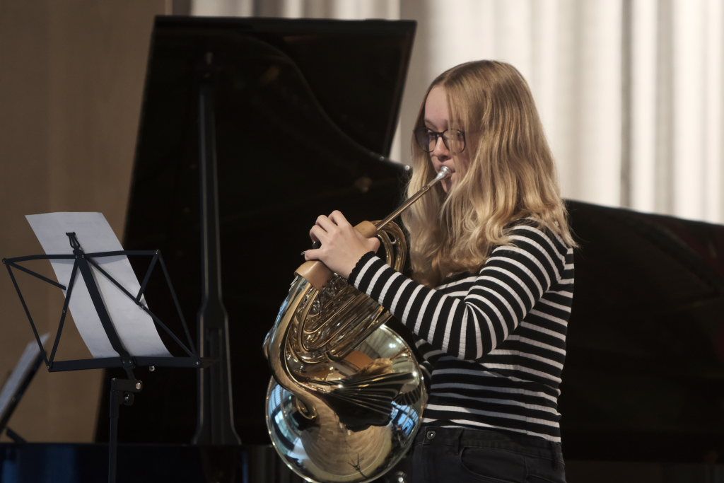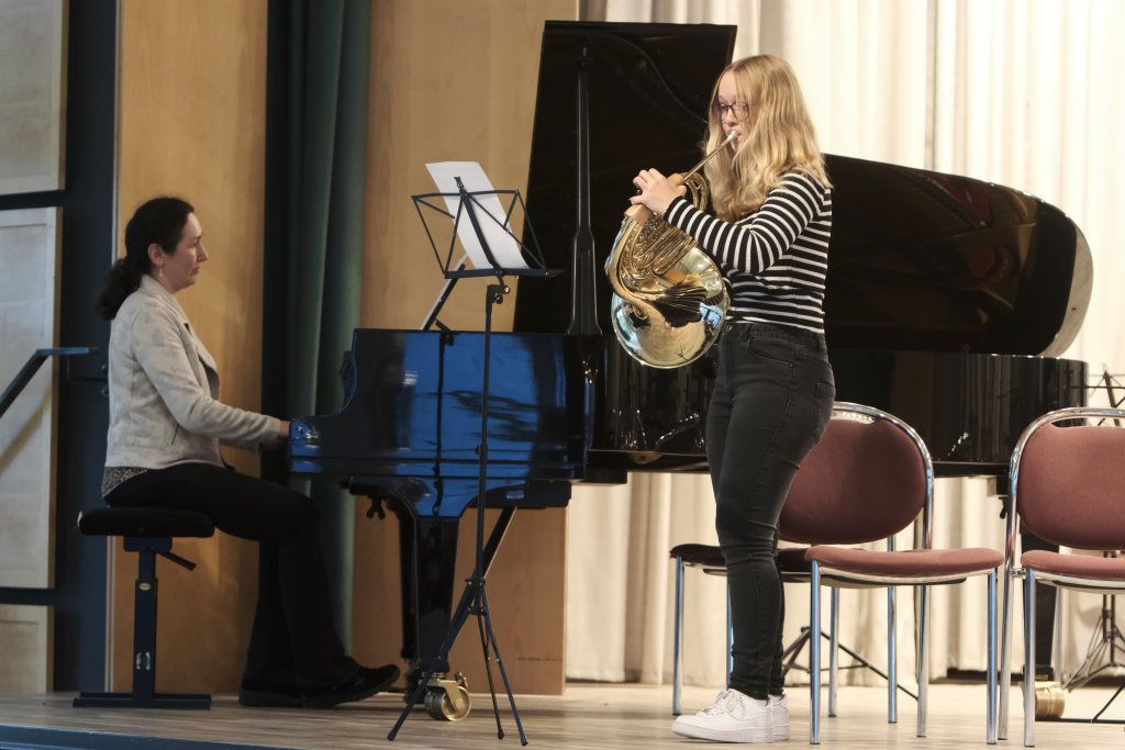 Die Horn-Schülerin bei Cecilia Brunetti, Anna Zeller, wagte sich – am Flügel begleitet von Larissa Bohr-Chernjak – an Johannes Brahms´ St. Antony Chorale Op. 56a und machte ihre Sache bei dem als schwierig zu beherrschenden Instrument sehr gut.