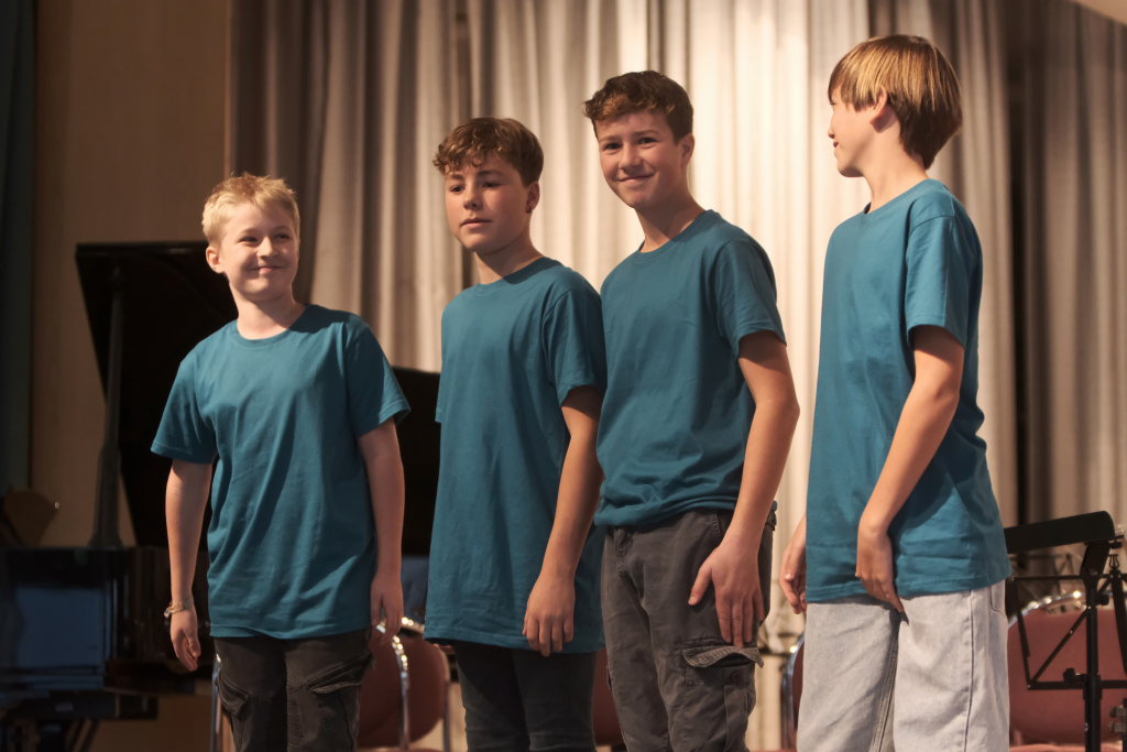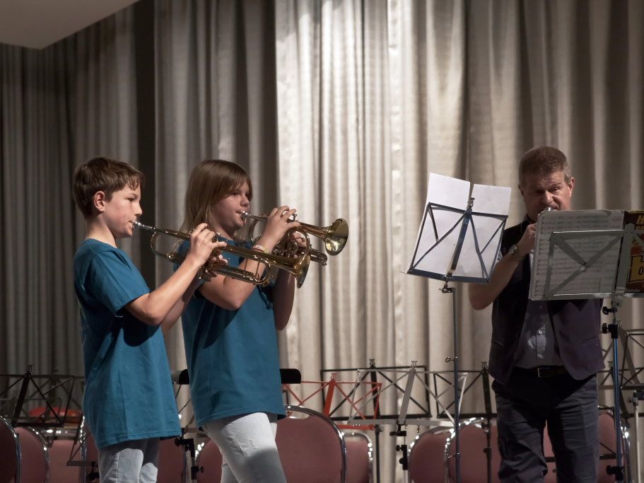 Gemeinsam mit ihrem Trompeten-Lehrer Martin Schad spielten Lena Riß und Felix Schwarz den „Mini-Rock“ von André Wagnein, den Fräulein Riß gerne im Minirock bestritten hätte, dabei aber bei ihren männlichen Mitspielern auf wenig Gegenliebe gestoßen war. Als Quartett traten Julian Riß, Andreas Kiebler und Max Schmid gemeinsam mit ihrem „Chef“ Martin Schad und dem Traditional Go down Moses an.